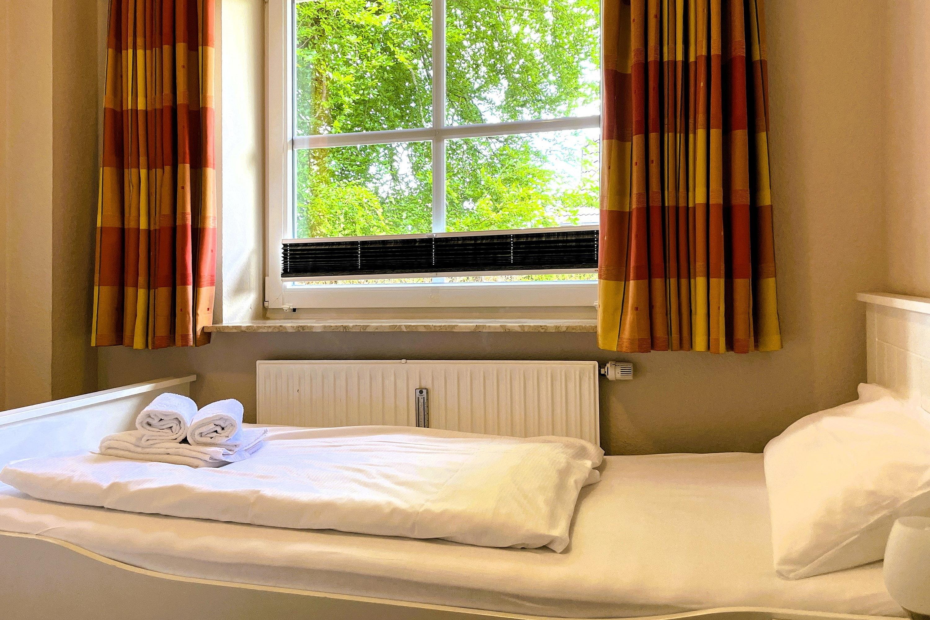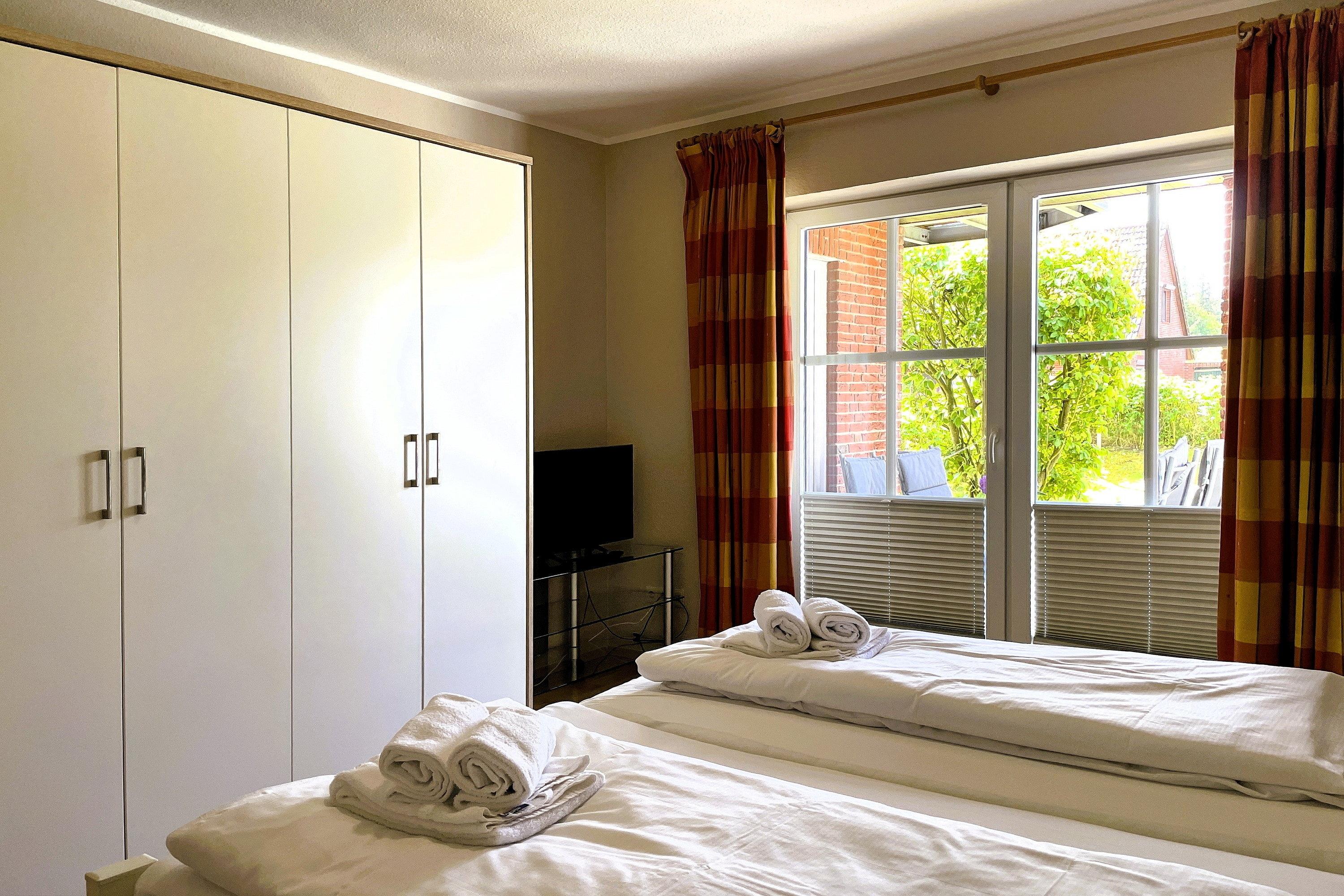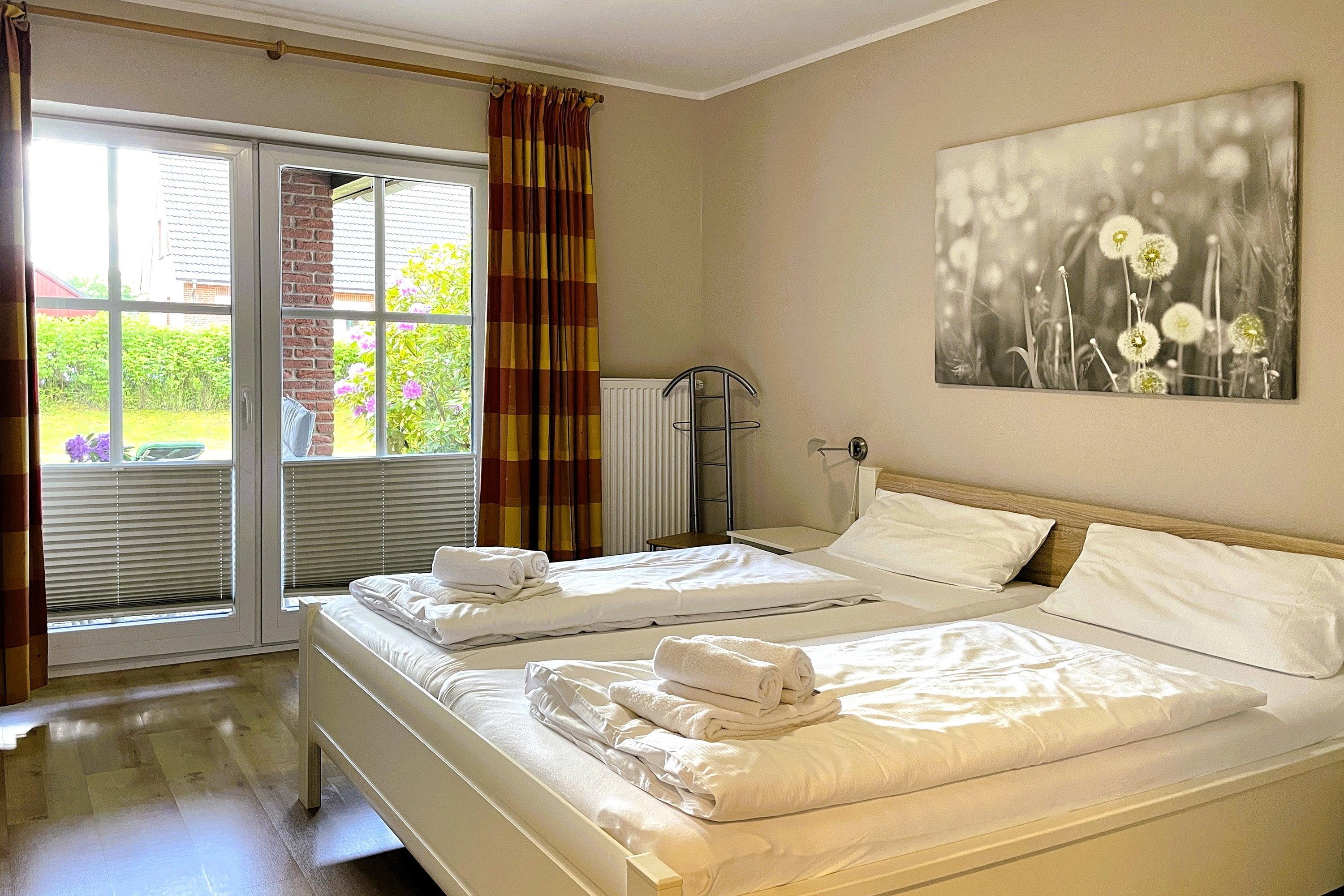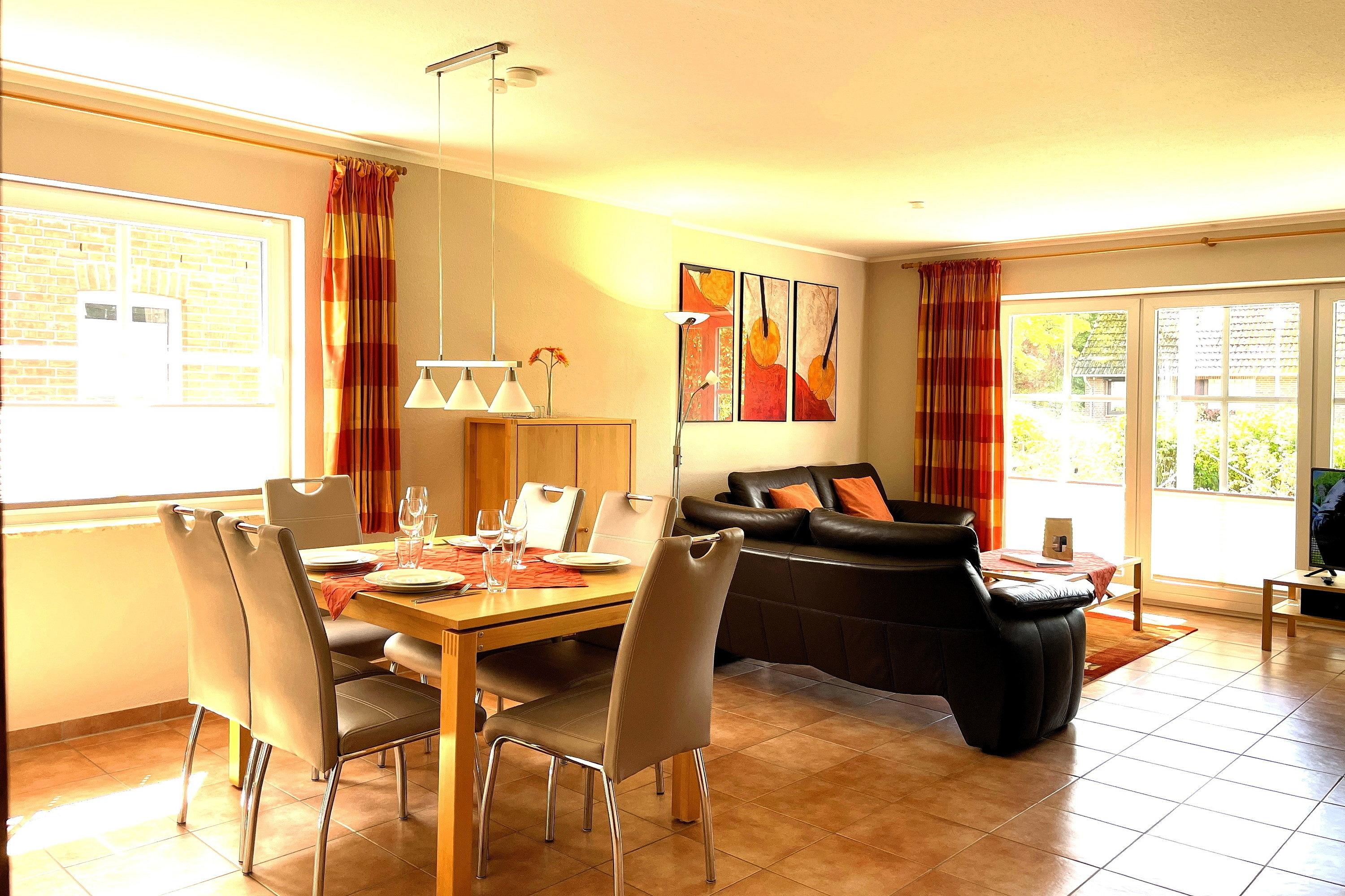 Mitten in Wyk liegt unsere EG-Wohnung 1 mit ca. 80 qm und lädt zu schönen Urlaubstagen ein. Vom Flur gelangen Sie in die einzelnen Räume. Der großzügige Wohnbereich mit integriertem Essplatz und kleiner Küche ist das Herzstück der Wohnung. Ausgestattet mit einem Flachbild-TV, WLAN, Telefon mit Flat ins dt. Festnetz sowie DVD-Player und einer Stereoanlage können Sie gesellige Stunden verbringen oder Sie möchten vielleicht alle zusammen am Esstisch ein Spiel spielen. Die gut ausgestattete Küche ist klein aber fein. Im Elternschlafzimmer mit Doppelbett und Kleiderschrank steht ein zusätzlicher Fernseher. Von hier können Sie- ebenso wie vom Wohnzimmer- die Terrasse betreten. Im kleinen, gemütlichen Kinderzimmer befinden sich 2 Einzelbetten, die für erholsamen Schlaf sorgen. Im Bad mit Fenster können Sie zwischen Dusche und Badewanne wählen. Im Keller des Hauses steht zur gemeinschaftlichen Nutzung ein kleiner Fitnessraum, eine Sauna, Waschmaschine und Trockner für Sie bereit. Alle Wohnungen sind allergiker- und kinderfreundlich eingerichtet. Das gepflegte Haus mit dem idyllischen Garten liegt nah am Stadtwäldchen mit dem Abenteuerspielplatz Löwenhöhle und lädt somit Jung und Alt zum Spazierengehen und Verweilen ein. In ca. 10 Gehminuten erreichen Sie den Strand und das Meer, die Fußgängerzone mit zahlreichen Cafés, kleinen Geschäften und Restaurants.