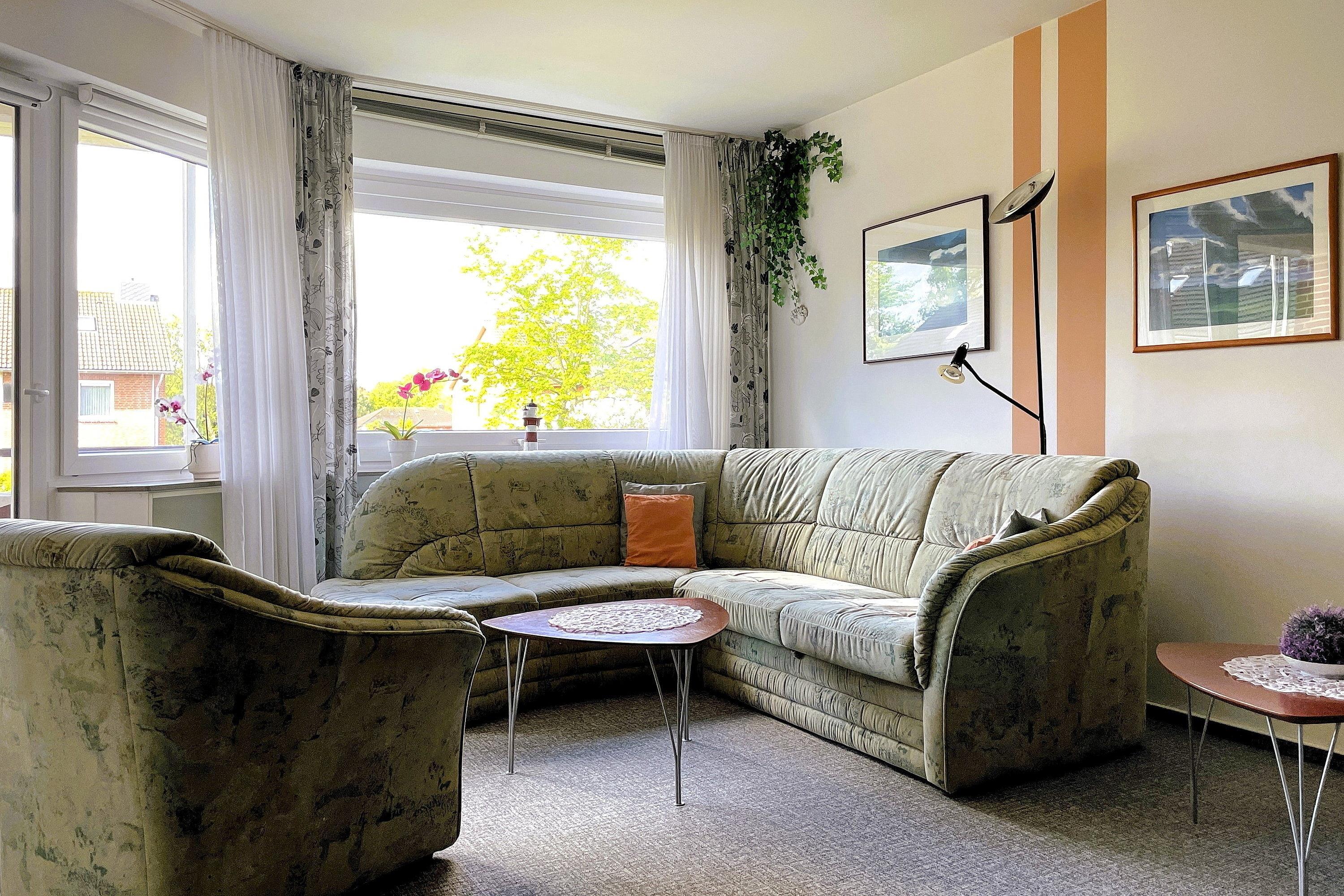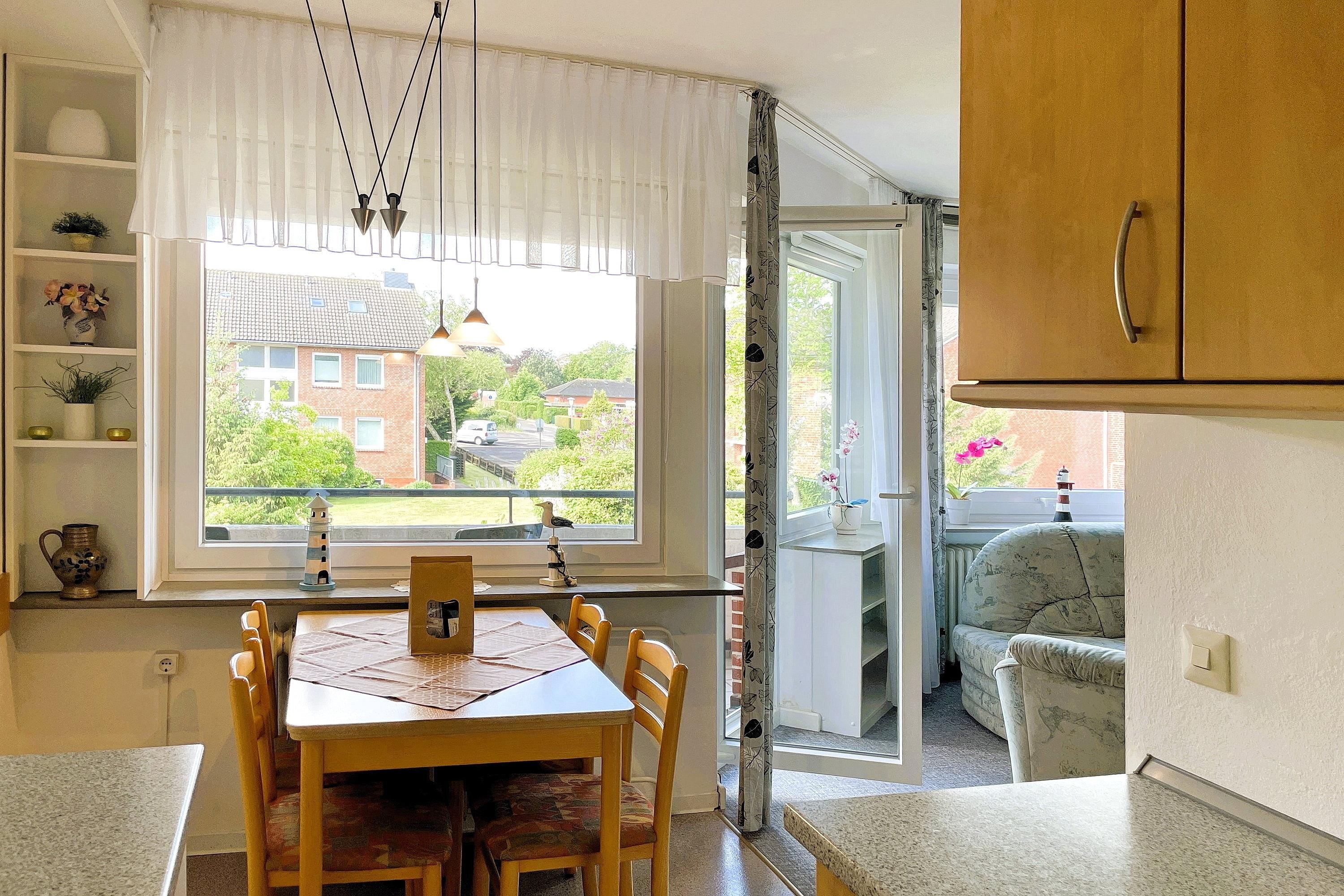 Urlaub in Wyk auf Föhr? Dann buchen Sie jetzt diese gemütliche Ferienwohnung. Genießen Sie Ihren Urlaub auf 50 m² mit ausreichend Platz für bis zu 2 Personen. Ihr Feriendomizil Wolff finden Sie in einer ruhigen Anliegerstraße, sie ist ca. 500 m vom begehrten Wyker Südstrand und ca. 5 Fahrradminuten von der Innenstadt entfernt. Die Wohnung befindet sich im 1. Stock, eines Mehrfamilienhauses, das von viel Grün umgeben ist. Auf ca. 50 qm stehen Ihnen ein kleiner Flur mit Garderobe, ein Schlafzimmer mit Doppelbett, Wannenbad, WC mit Fenster und ein großzügiger Wohn-Essbereich mit integrierter Einbauküche zur Verfügung. Das Wohnzimmer bietet einen gemütlichen Essplatz und den direkten Zugang auf Ihren Süd-Balkon mit Blick auf den Garten.