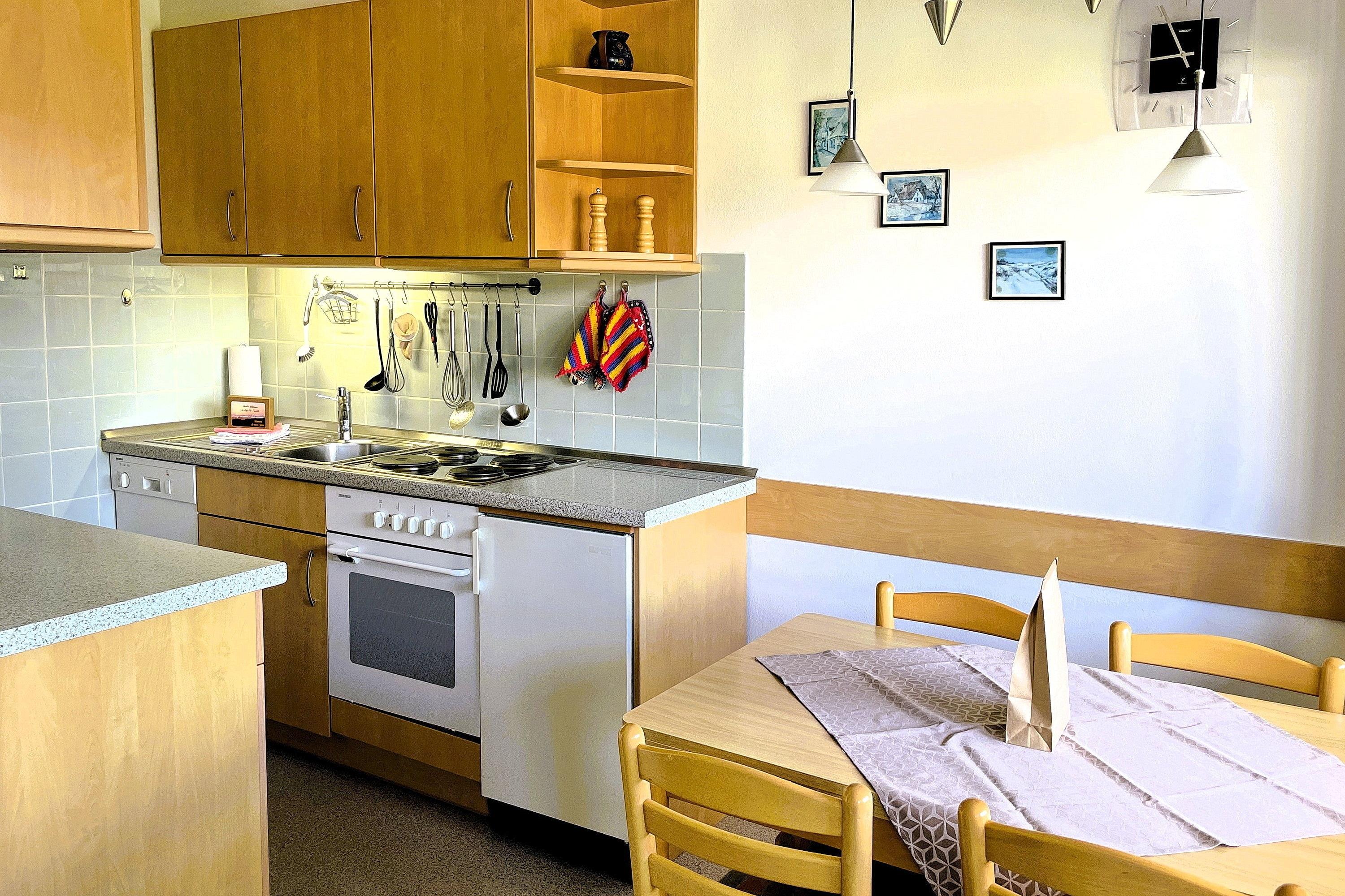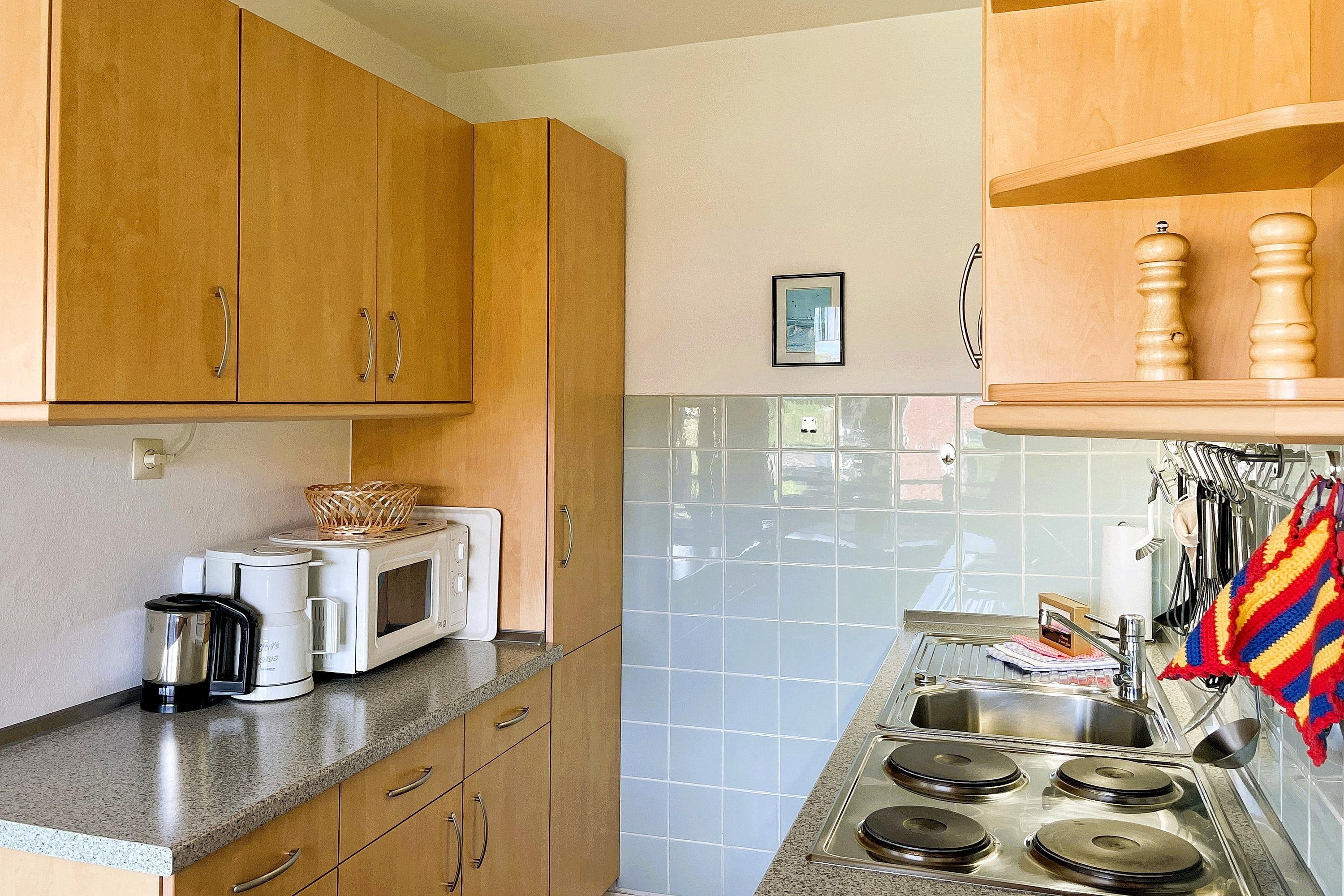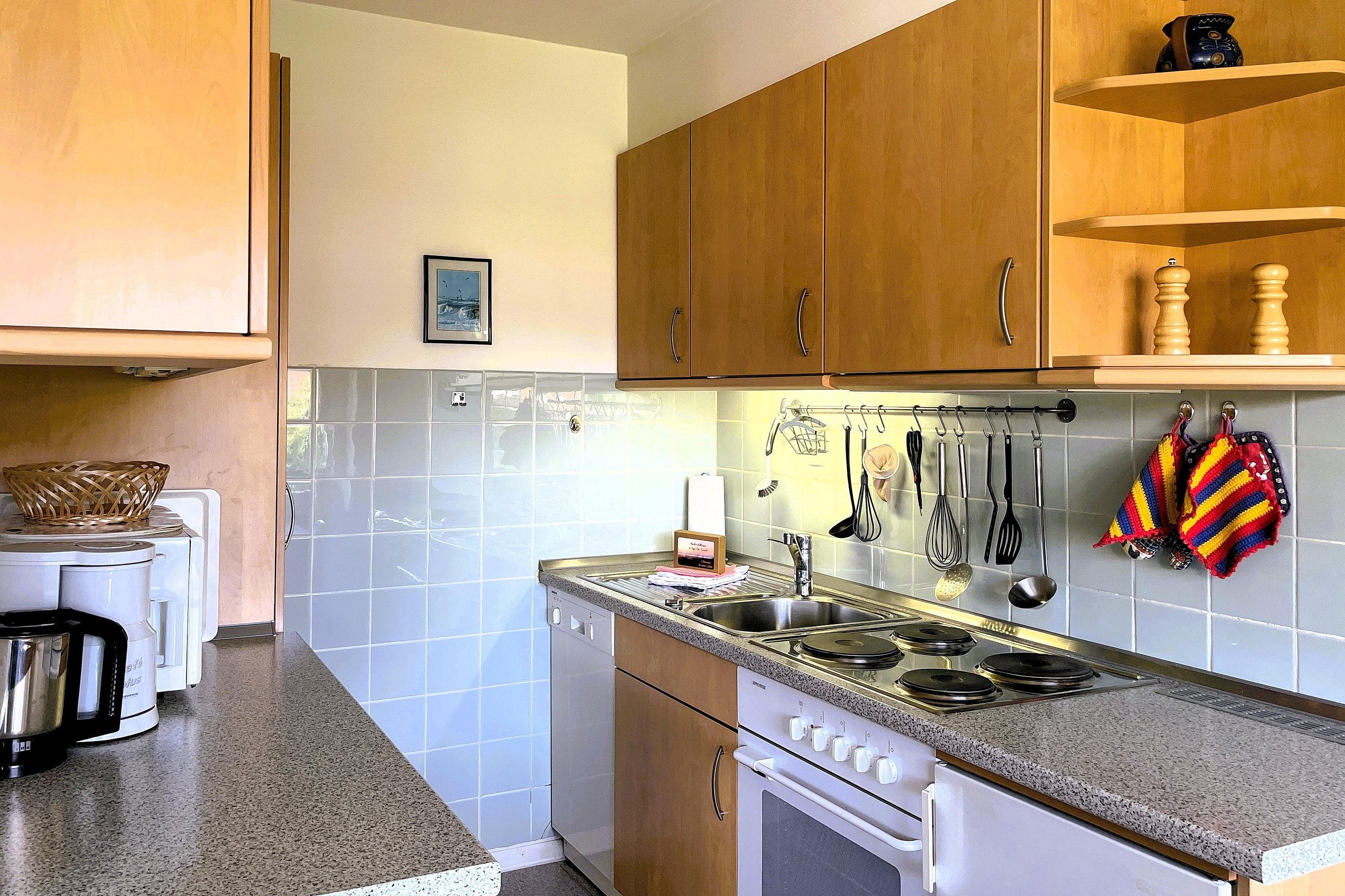 Die moderne Küche ist komplett eingerichtet. Zu der Ausstattung gehören Geschirrspüler, Mikrowelle, Elektro-Herd mit Backofen, Kühlschrank, Kaffeemaschine, Wasserkocher, Toaster, Geschirr, Besteck, Töpfe usw.