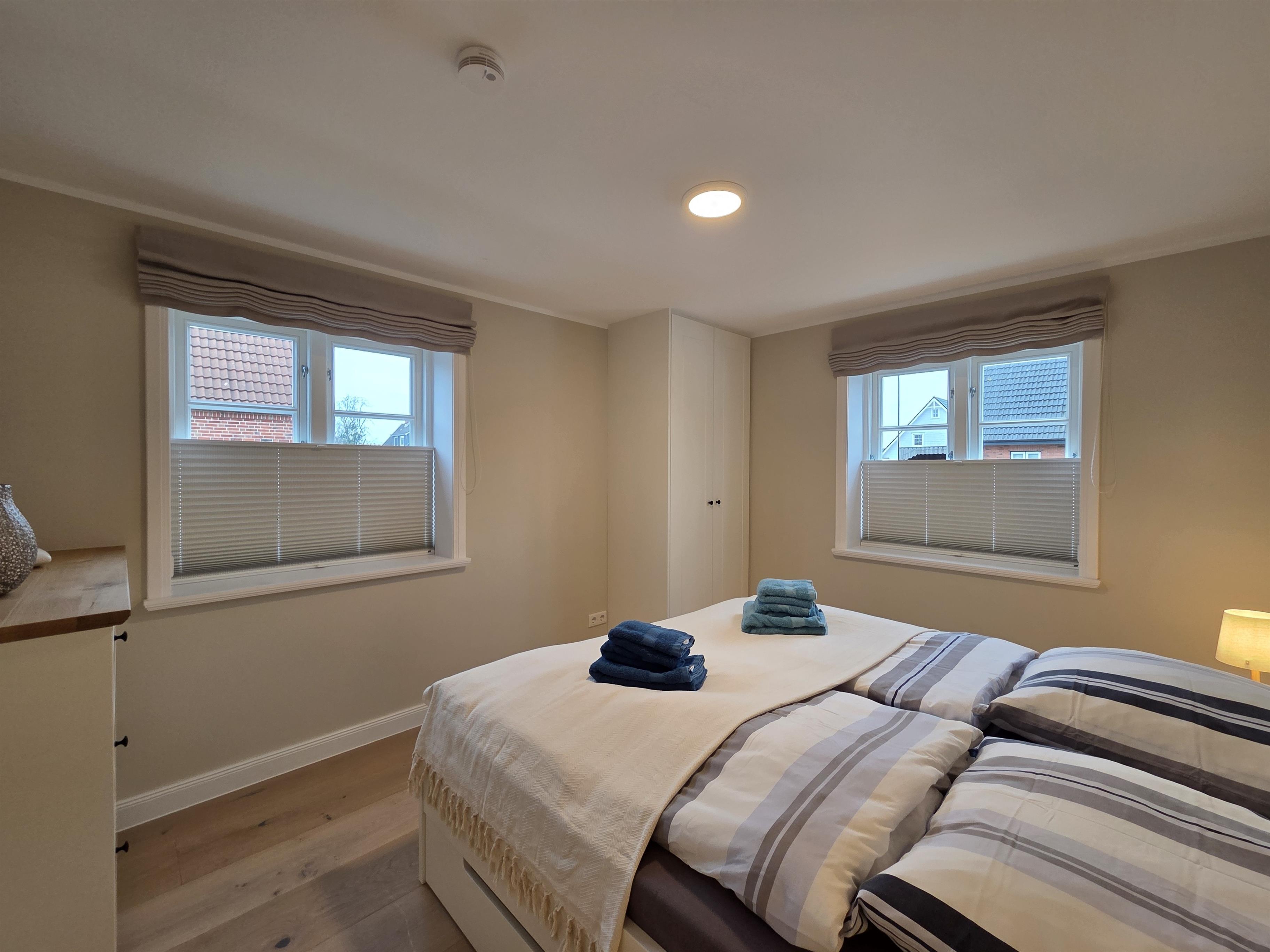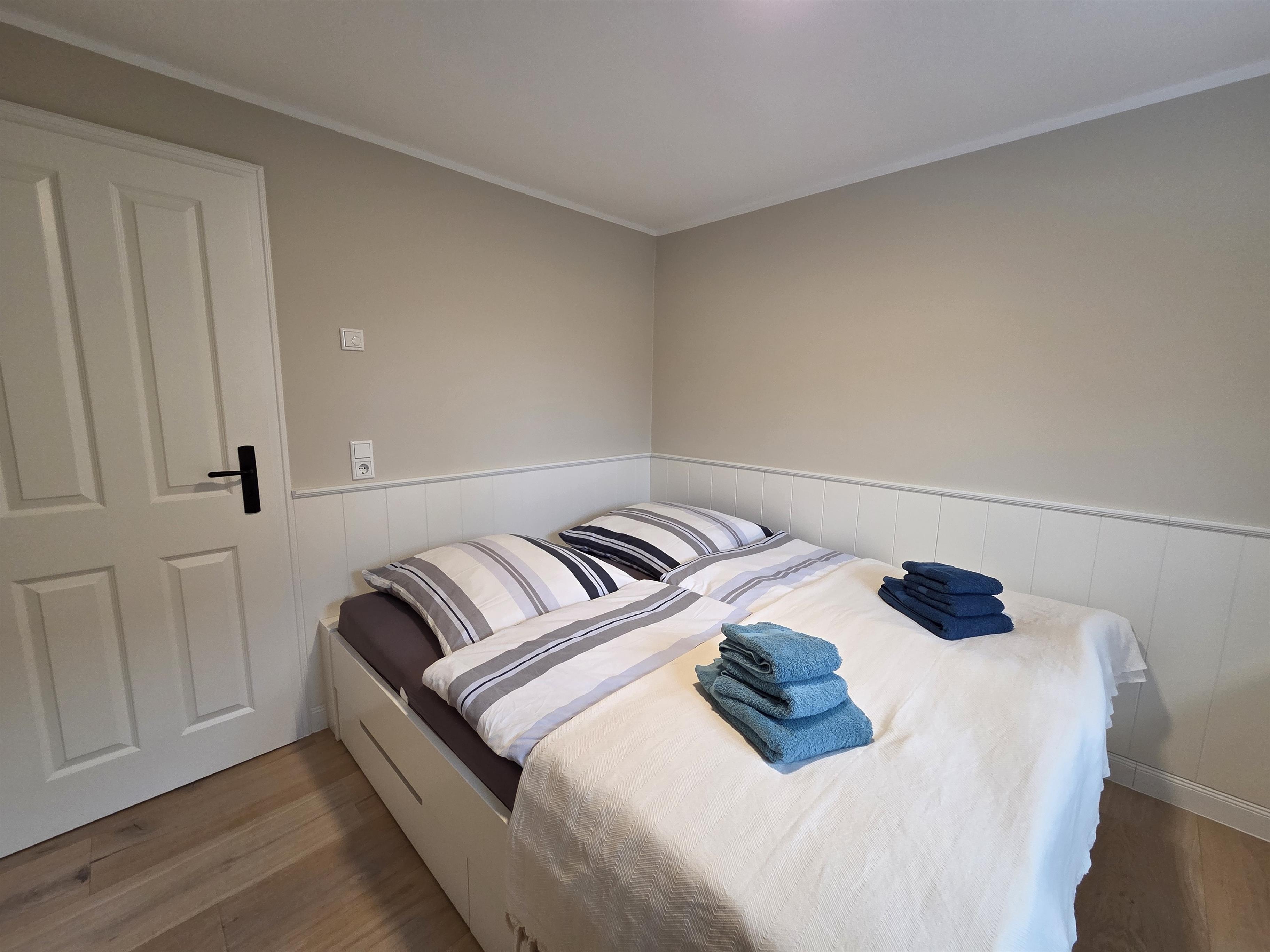 Die Ferienwohnung verfügt über zwei Schlafzimmer, jeweils mit komfortablem Doppelbett (180 × 200 cm) und Kleiderschrank, die für erholsamen Schlaf sorgen. Das moderne Bad mit Dusche/WC ist funktional ausgestattet, zusätzlich stehen Haartrockner sowie Waschmaschine und Trockner zur Verfügung.
