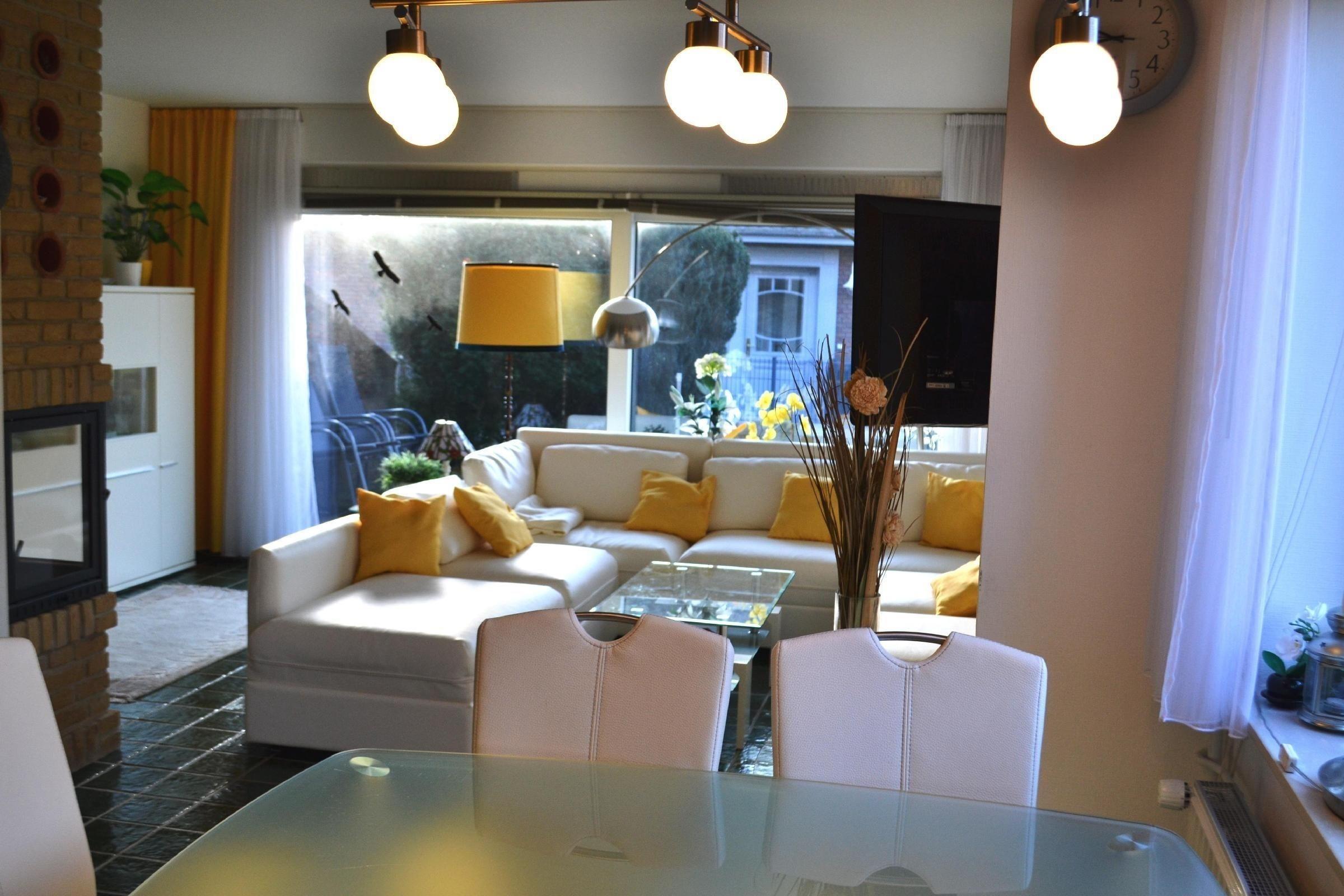 Das neu eingerichtete Ferienhaus Harmonie erstreckt sich über zwei Etagen und bietet eine Wohn- und Nutzfläche von etwa 85 m² für bis zu 5 Personen. Im Erdgeschoss befindet sich ein einladender Wohn- und Essbereich mit offener Küchenzeile sowie ein Duschbad mit WC. Eine offene Treppe führt in die obere Etage, die ein geräumiges Schlafzimmer mit Doppelbett und TV sowie zwei weitere Schlafzimmer mit Betten von 1,80 m Länge umfasst. Eines der zusätzlichen Schlafzimmer verfügt über ein Etagenbett, das auch als Doppelbett genutzt werden kann, das andere bietet ein Einzelbett. Zudem ist ein Gäste-WC vorhanden. Gemeinschaftliche Einrichtungen wie eine Waschmaschine und ein Trockner befinden sich im Keller. Fahrräder können in einem Gartenhäuschen oder im Keller untergebracht werden. Wäschepakete sind gegen Gebühr erhältlich.