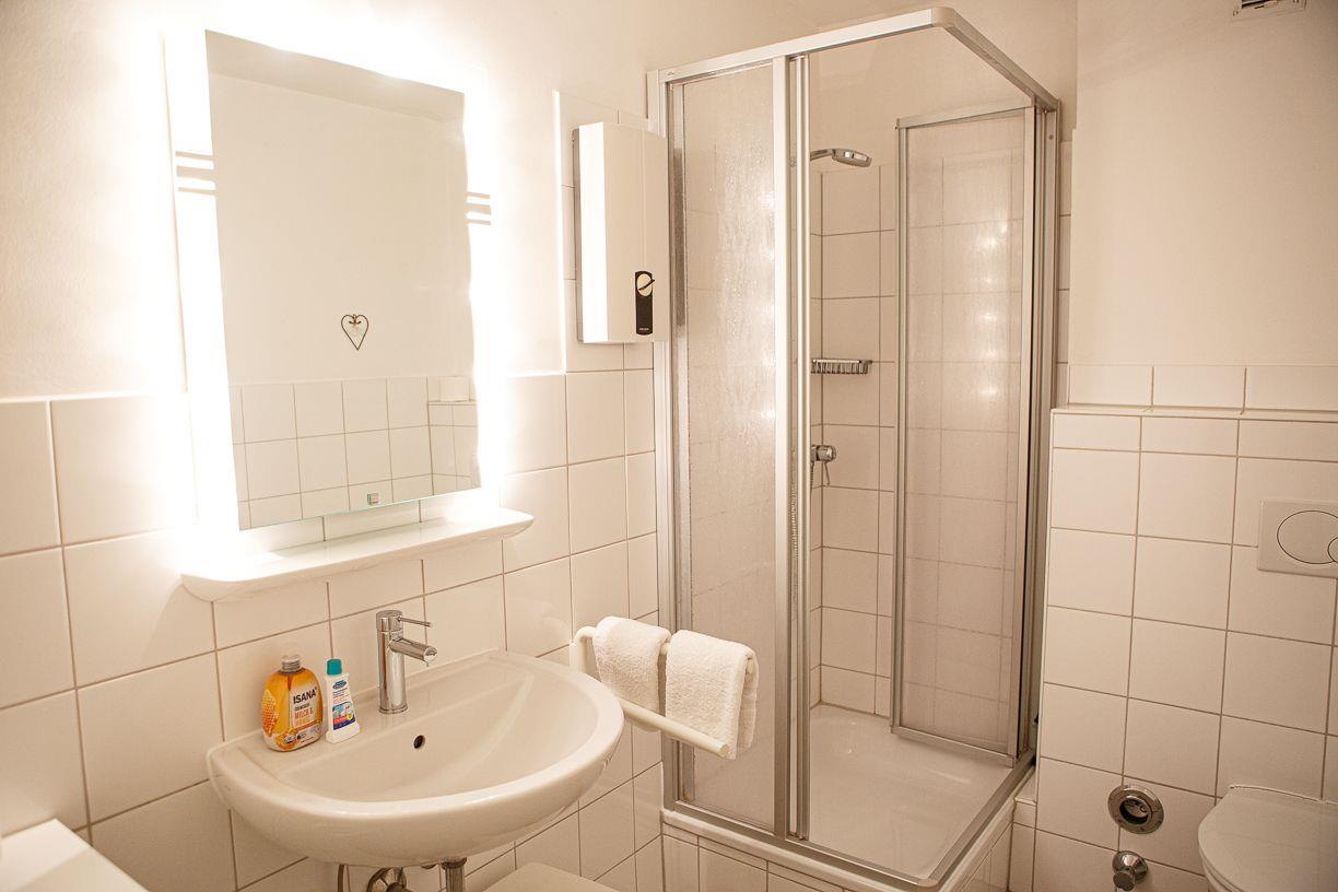 Das Badezimmer ist modern und großzügig gestaltet und verfügt über eine bodenebene Dusche, Handtuch- und Haartrockner.