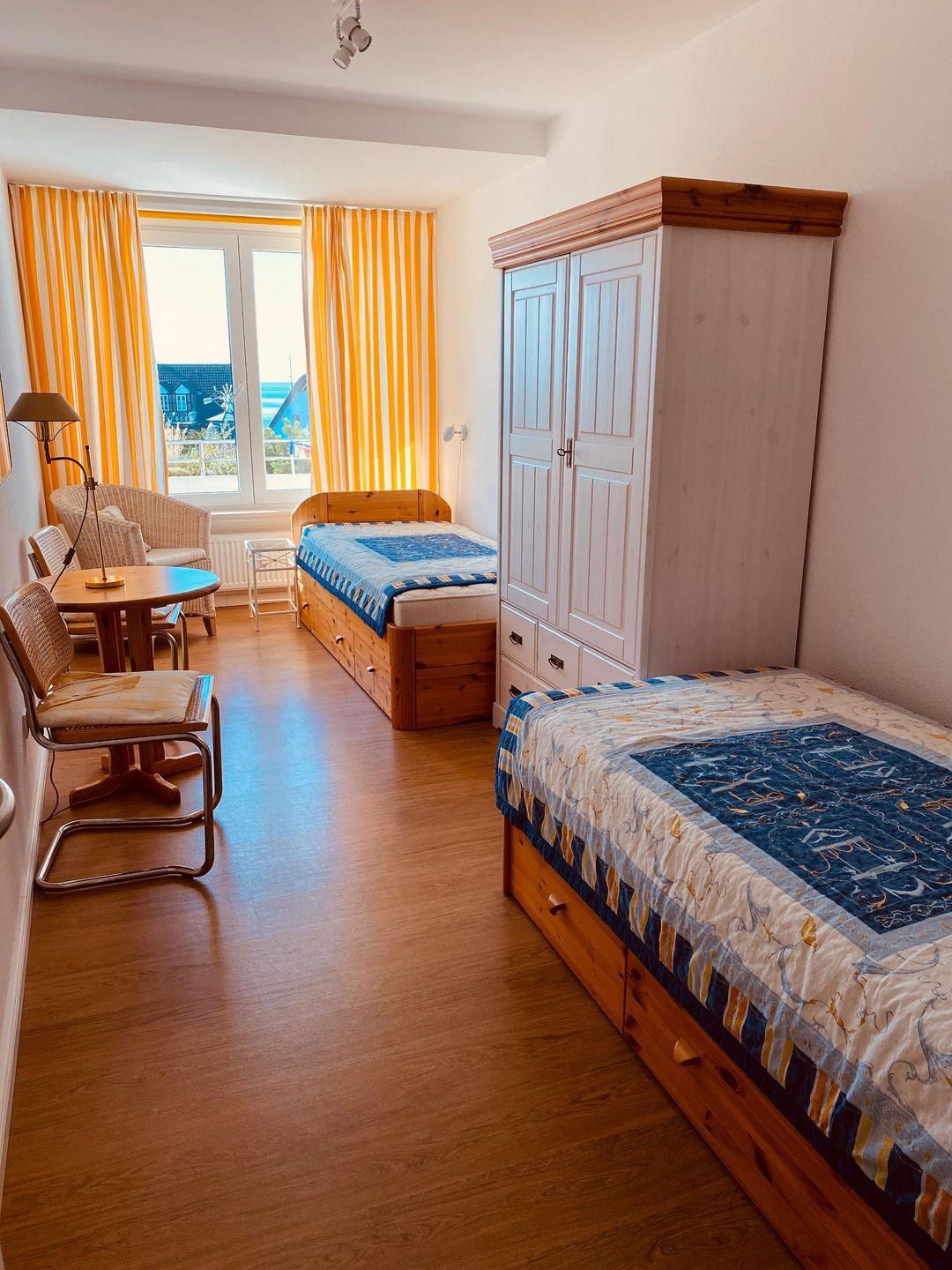 Der überdachte Balkon, ausgestattet mit Gartenmöbeln und Sonnenschirm, bietet Ihnen zu jeder Tageszeit einen eindrucksvollen Blick auf das Meer und lädt dazu ein, die frische Nordseeluft zu genießen. Die zentrale Lage der Wohnung in Wyk ermöglicht es Ihnen, alle wichtigen Einrichtungen bequem zu erreichen: Ein Restaurant befindet sich in nur 150 Metern Entfernung, Einkaufsmöglichkeiten und die Stadtmitte sind etwa 1,5 Kilometer entfernt. Zum Fähranleger gelangen Sie ebenfalls nach 1,5 Kilometern, während sich der Flughafen lediglich 150 Meter entfernt befindet. Der örtliche Golfplatz ist in 250 Metern schnell erreichbar und lädt zu sportlichen Aktivitäten ein.