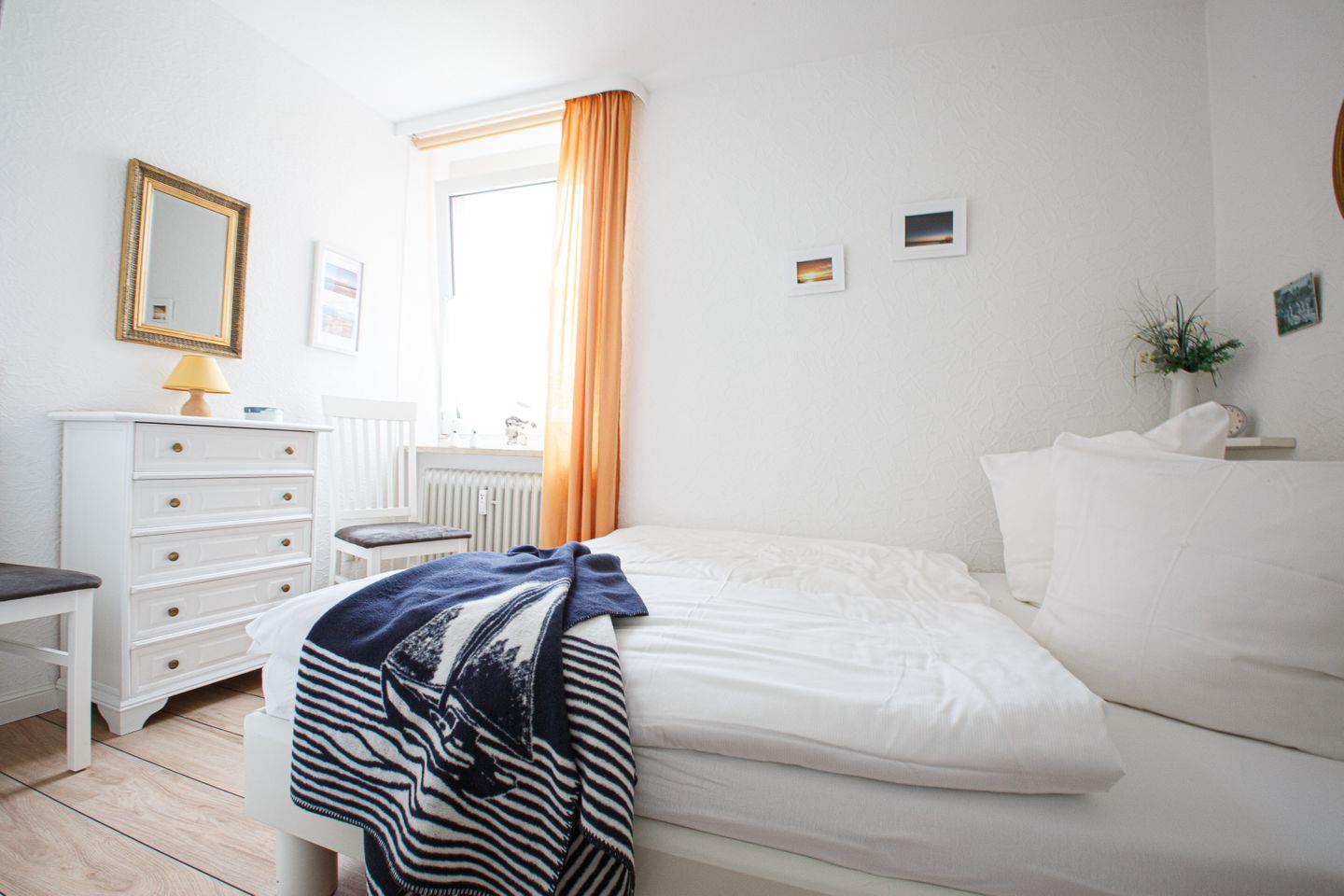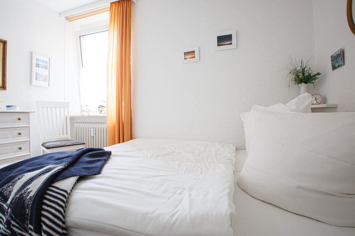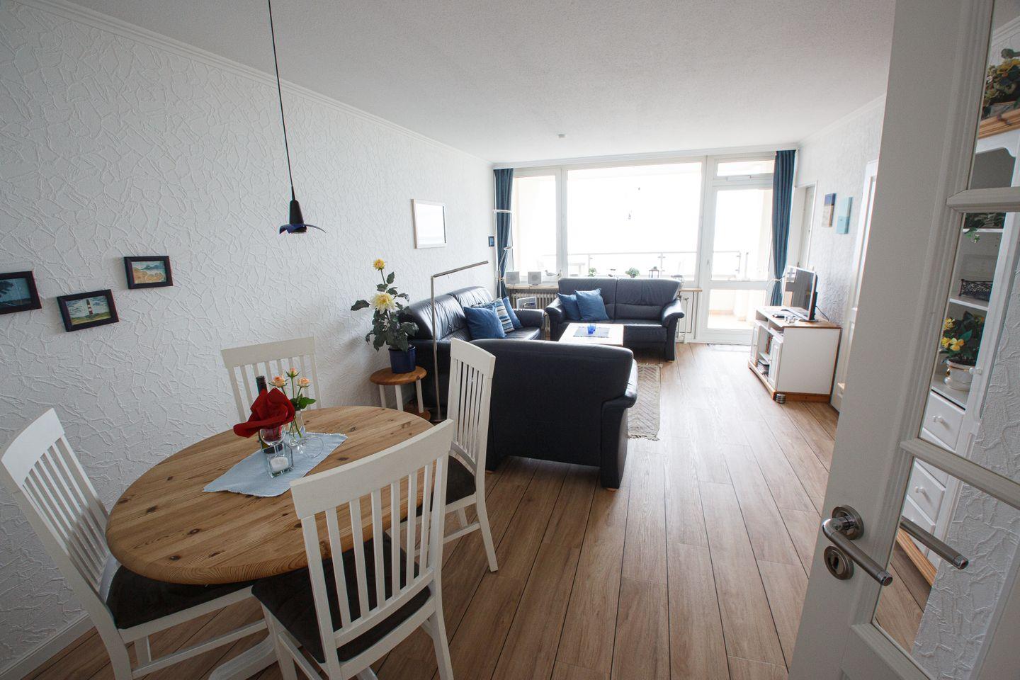 Unser Ferienobjekt "Sonnendeck" liegt im 4. OG und bietet für bis zu vier Personen Platz . Die gemütlich und komplett eingerichtet Wohnung besteht aus einem Wohnzimmer, zwei Schlafräumen, einer vom Wohnzimmer abgehenden, getrennten Küche, Diele und einem modernen Duschbad mit WC. Die Wohnung wurde umfassend renoviert. Alle Räume sind im modernen Landhausstil gehalten und mit hochwertigem Schiffsboden-Parkett ausgelegt. Der vom Wohnzimmer aus zugängliche Balkon in Südlage bietet einen herrlichen Blick über die Nordsee und Halligen. Balkonmöbel sind vorhanden. Fenster in jedem Raum des gesamten Wohn- und Schlafbereiches ermöglichen einen großzügigen Panoramablick auf das Wasser. Die Wohnung verfügt über einen kostenlosen WLAN-Zugang sowie Schwimmbad- und Saunanutzung im Hause.