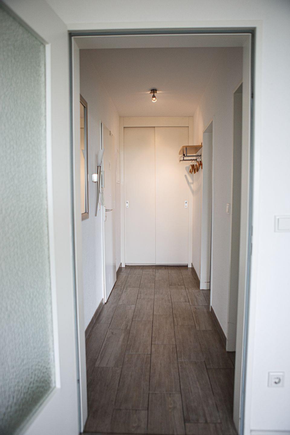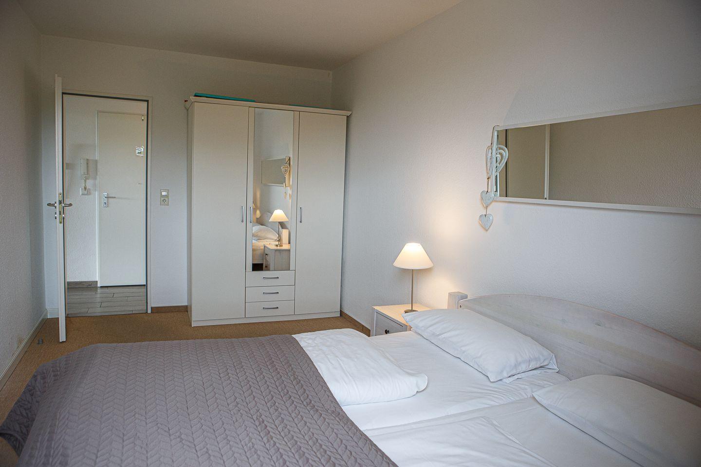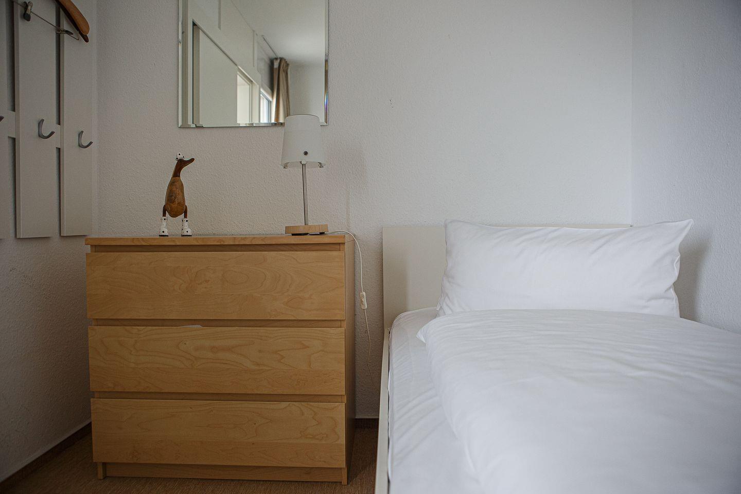 Die Wohnung ist großzügig geschnitten und bietet mit insgesamt drei Zimmern, darunter zwei separate Schlafzimmer, ausreichend Platz für bis zu vier Personen. Sie eignet sich daher besonders für Familien oder Paare, die Wert auf Komfort, Ruhe und eine ausgezeichnete Infrastruktur legen. Der lichtdurchflutete Wohnbereich ist mit einem gemütlichen Sofa, einem Sessel, einer Kommode sowie einer modernen Essgruppe ausgestattet und bietet direkten Zugang zu einem überdachten Balkon, der zusätzlich Schutz bei jedem Wetter garantiert. Hier lassen sich entspannte Stunden mit Aussicht auf die Umgebung verbringen.