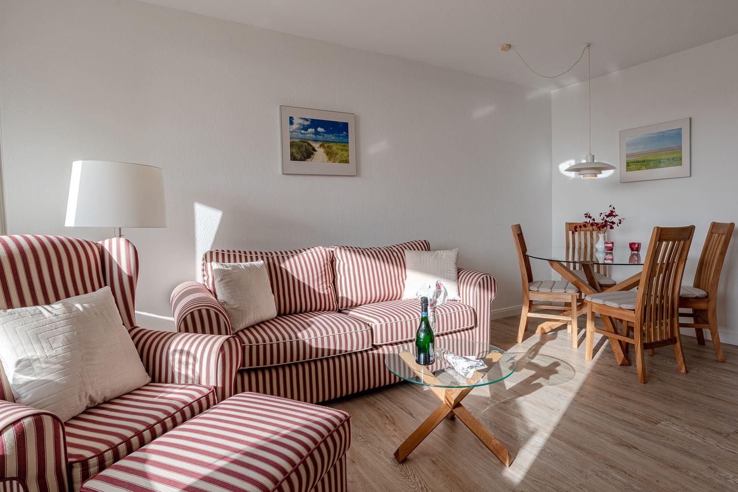 Sie ist ca 52 qm groß und eignet sich für zwei bis vier Personen. Unsere Strandliebe besteht aus einem Wohnzimmer, zwei Schlafzimmern, einer vom Wohnzimmer abgehenden Küche, einem Duschbad mit WC, einer Diele mit Einbauschrank, sowie einem vom Wohnzimmer aus zugänglichen Balkon in Südlage mit Blick ins Grüne und auf die Nordsee.