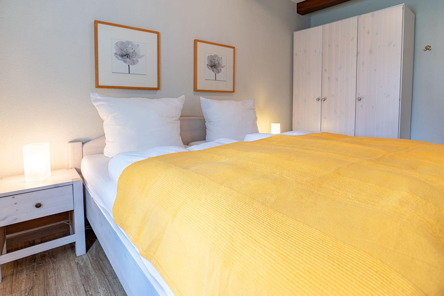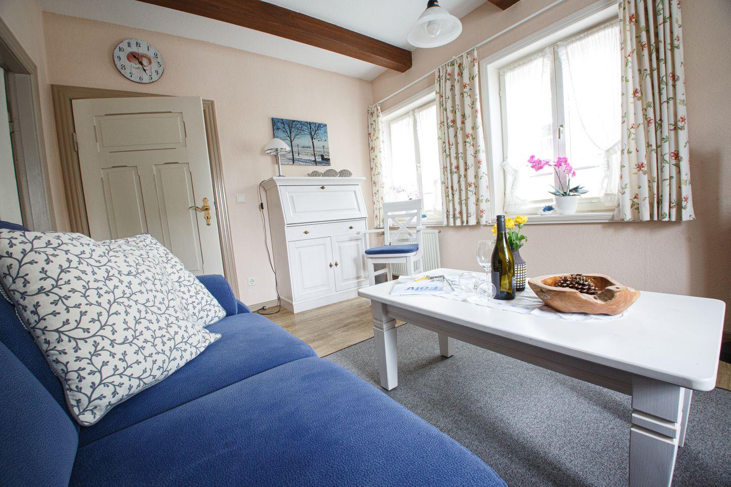 Die Unterkunft besteht aus insgesamt drei Zimmern, darunter ein Schlafzimmer mit Laminatboden für zwei Personen und einem Babybett. Im hellen Wohnzimmer lädt ein bequemes Sofa zum Entspannen ein, ergänzt durch Sat-TV, HiFi-Anlage und Radio. Hochwertige Fenster mit Sichtschutz sorgen für ein angenehmes Raumklima und Privatsphäre.