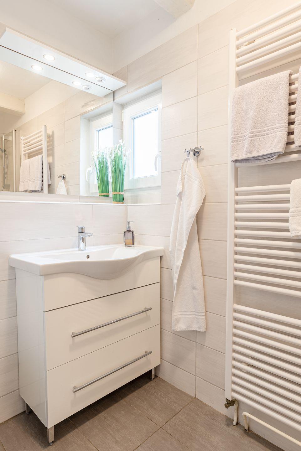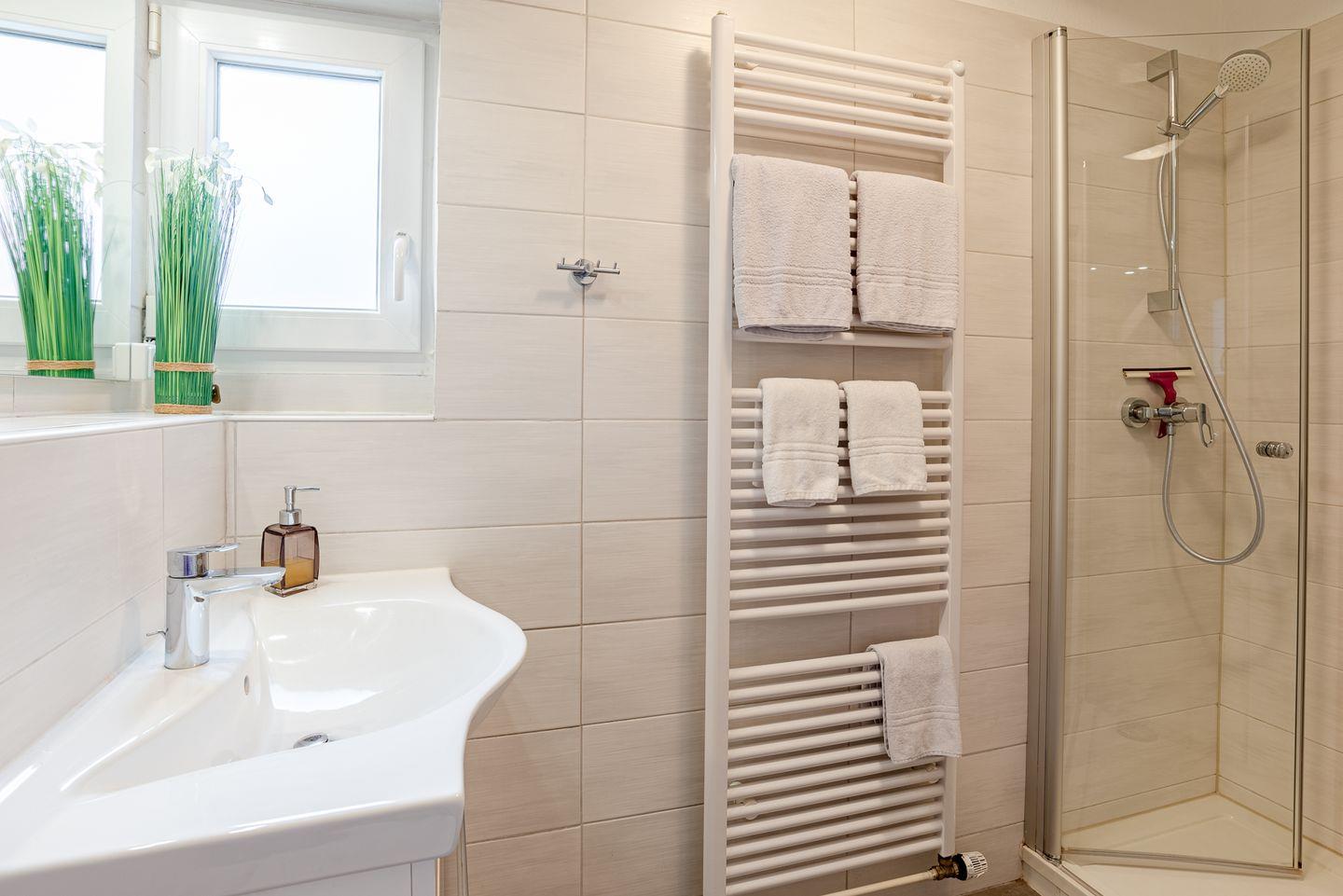 Das Badezimmer überzeugt mit einer bodengleichen Dusche, Haartrockner, Kosmetikspiegel, WC und Waschbecken. Es wurde besonders auf Allergikerfreundlichkeit geachtet, sodass die Unterkunft auch für sensible Gäste sehr gut geeignet ist. Das gesamte Haus ist Nichtraucherbereich.