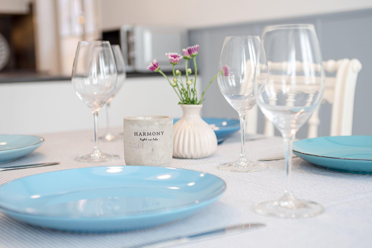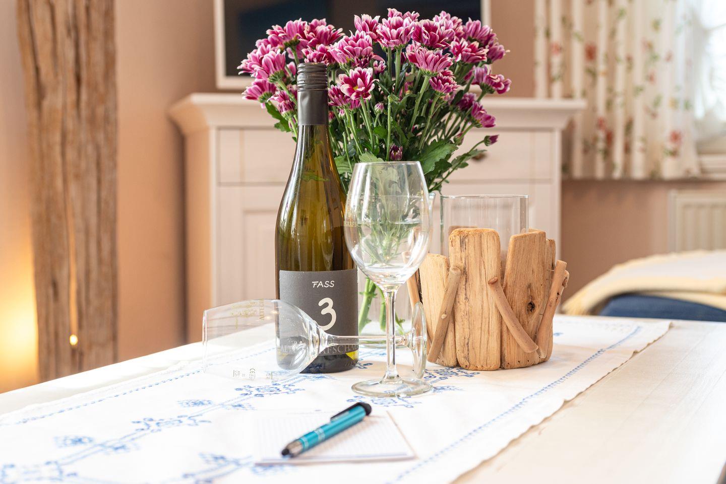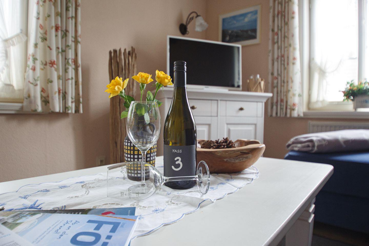 Die geschlossene Küche bietet einen Esstisch und ist umfassend ausgestattet: Zur Ausstattung zählen ein Ceranherd mit Elektrobackofen, eine Spülmaschine, Kühlschrank mit Gefrierfach, Mikrowelle, Wasserkocher, Kaffeemaschine, Toaster, Mixer, Eierkocher sowie zahlreiche Küchenutensilien und Gewürze. Für zusätzlichen Komfort stehen Bügeleisen, Bügelbrett und Wäscheständer bereit. Eine Erstausstattung mit Bettwäsche, Hand- und Geschirrhandtüchern ist im Service inbegriffen. Zimmerservice, Wäscheservice, Brötchen- und Einkaufsservice unterstützen Sie gerne im Alltag.
