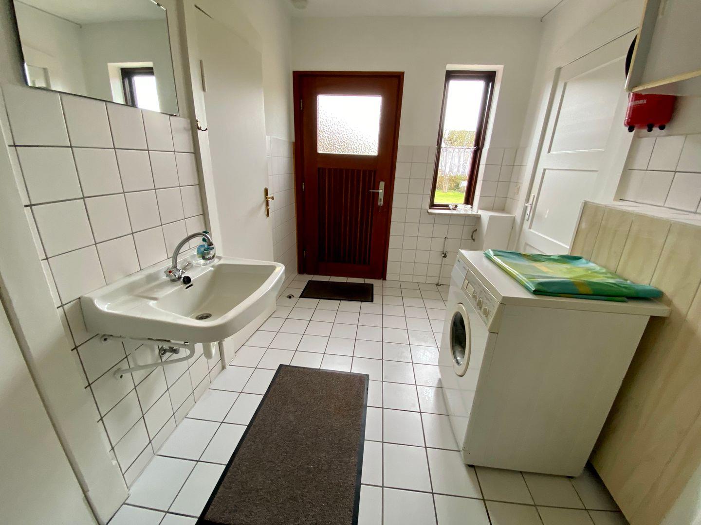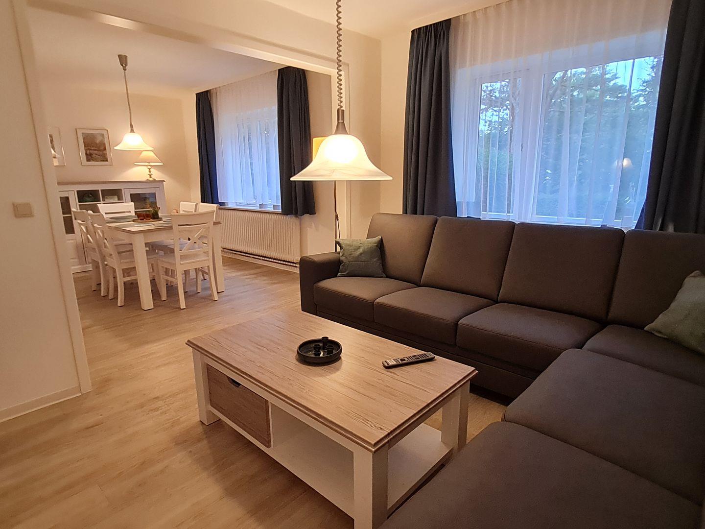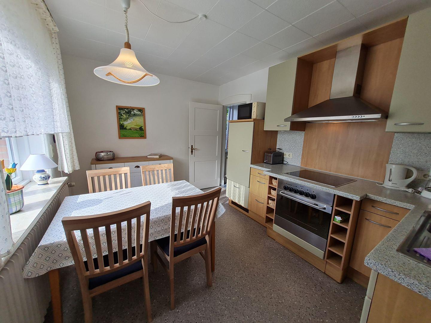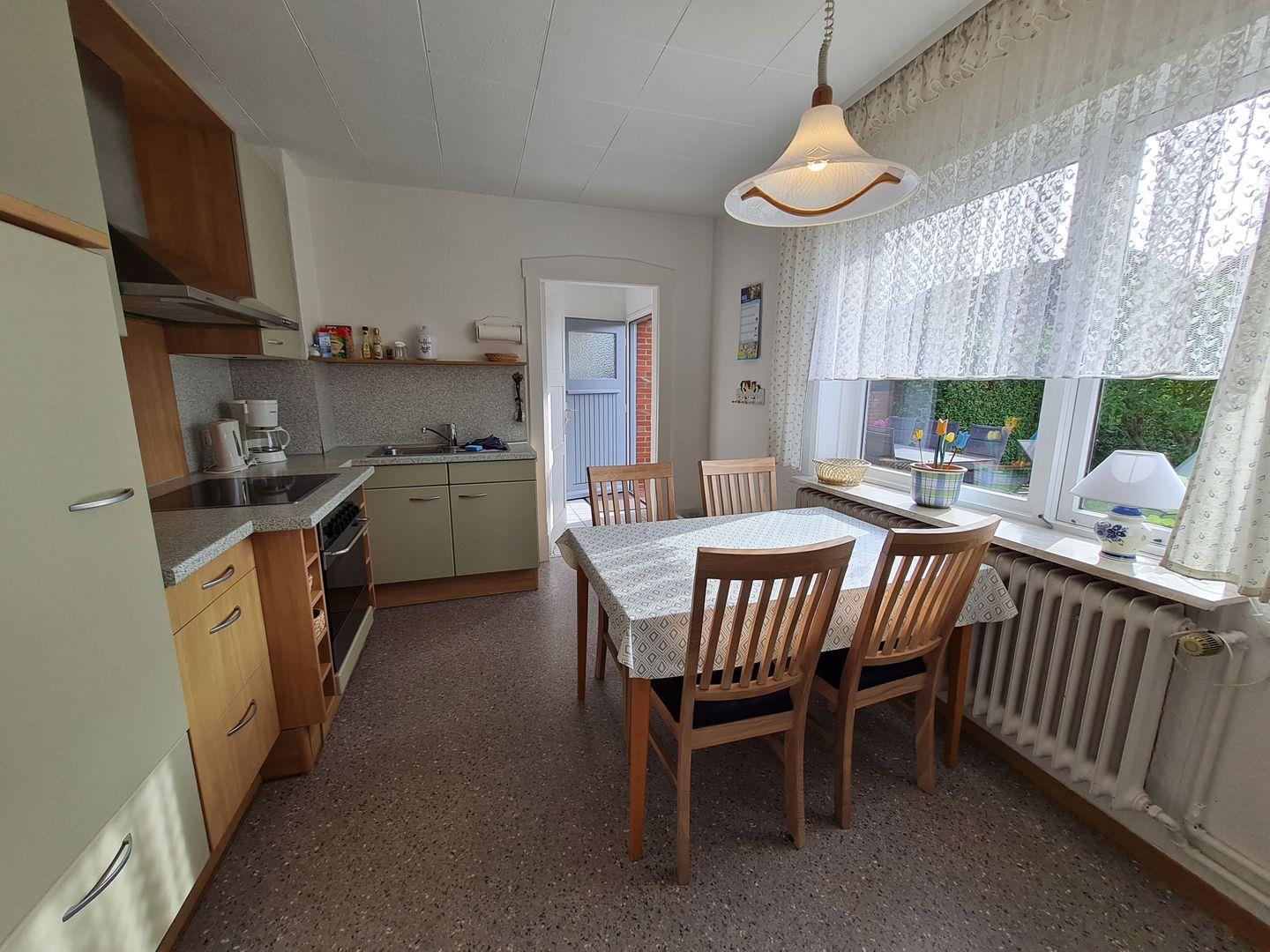 Im Erdgeschoss (ca. 55 m2) bietet das behaglich eingerichtete Ferienhaus ein Wohn- und Esszimmer mit SAT-TV und einem kostenlosen W-Lan. Neben Büchern finden Sie hier diverse Spiele, um den Tag - wenn die Sonne einmal nicht lacht - trotzdem abwechslungsreich gestalten zu können. Zwei Kinderhochstühle bieten Ihren Jüngsten die Möglichkeit am Geschehen auf dem Tisch mitzuwirken. Ebenfalls im Erdgeschoss finden Sie eine moderne Küche mit Umluft-Backofen, Ceranfeld, Kühlschrank und Mikrowelle. Hinter der Küche befindet sich der Vorraum mit einer Waschmaschine. Angrenzend befindet sich eine separate Dusche und ein separates WC. Vom Vorraum aus gelangen Sie in den schönen Garten mit einem großen Gartentisch, 6 Stühlen und einer Gartenliege.