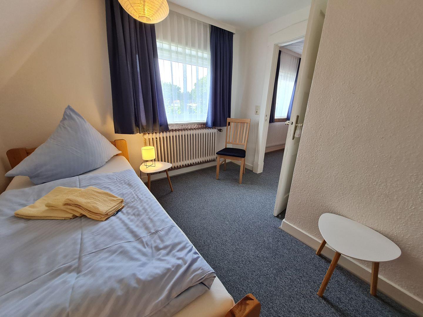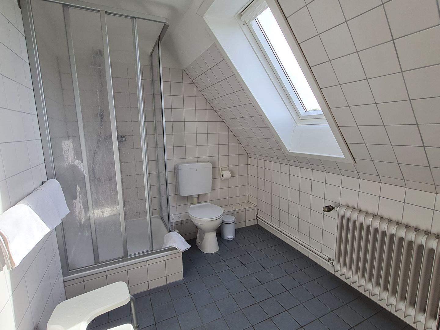 Im Obergeschoss (ca. 45 m2) befinden sich 3 Schlafzimmer (davon ein Durchgangszimmer zum Kinderzimmer) mit insgesamt sechs Betten (1x Boxspringbett, 1x Doppelbett, 2x Einzelbett), sowie ein weiteres geräumiges tageslicht Badezimmer mit Dusche, Föhn, WC und einem Waschbecken. Ein Kinderreisebett ist ebenfalls vorhanden.