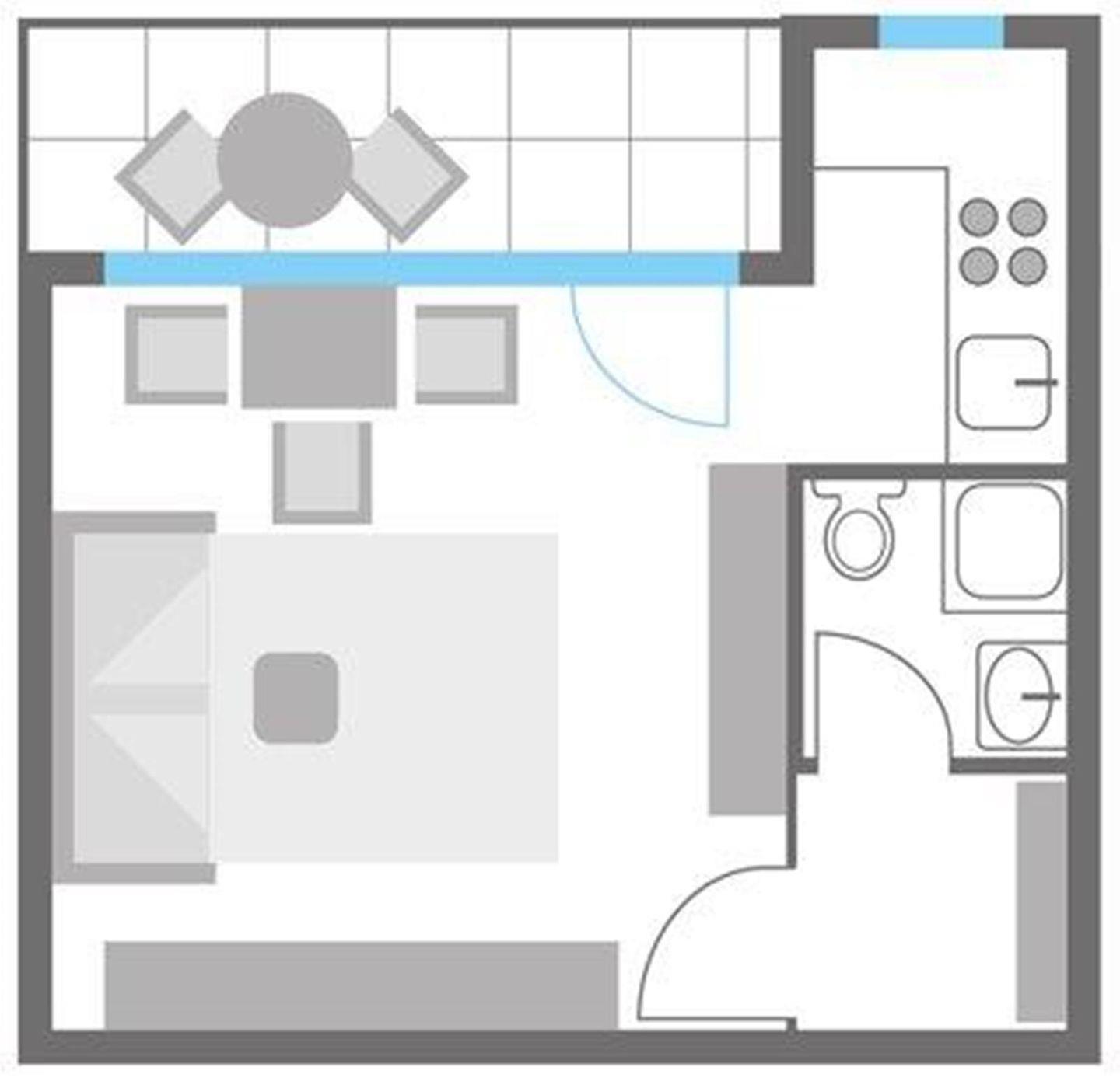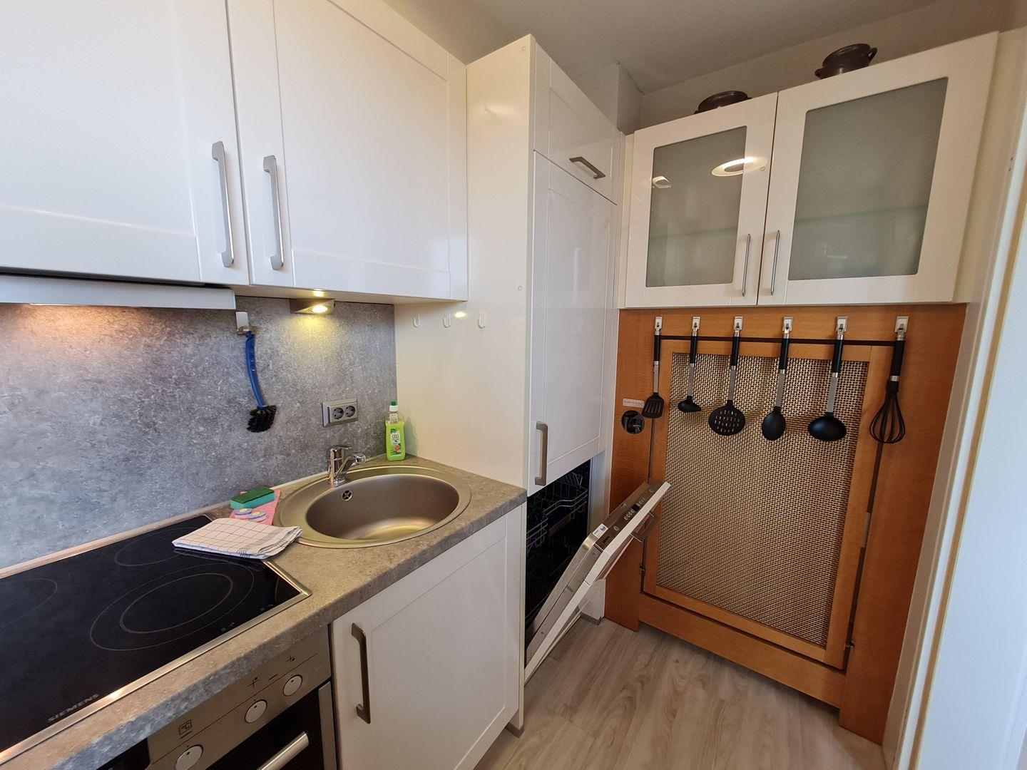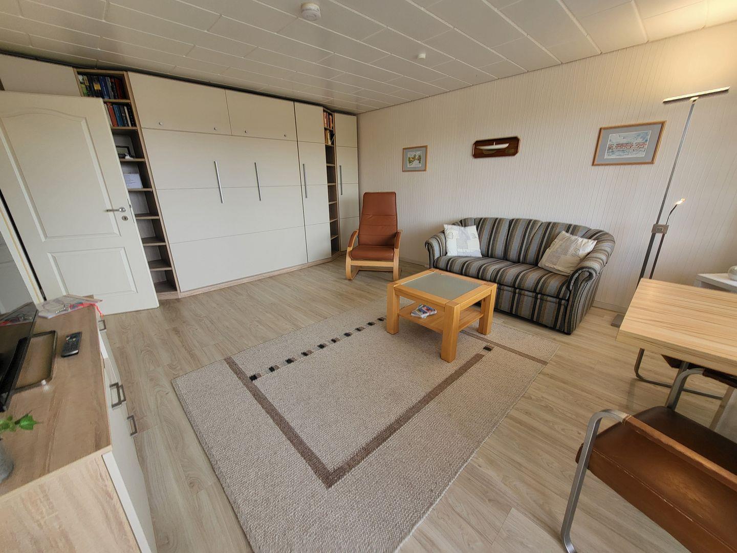 Die Wohnung ist auf einen kombinierten Wohn- und Schlafraum (Esstisch am Fenster, Sofa, Sessel, Couchtisch, Schrankbett mit einem Doppelbett, SAT-TV, Bücher, Internet-Radio über W-LAN), moderne Küche, Duschbad mit WC und Waschbecken, Flur mit Garderobe und einen West-Balkon mit Gartenmöbeln aufgeteilt.
