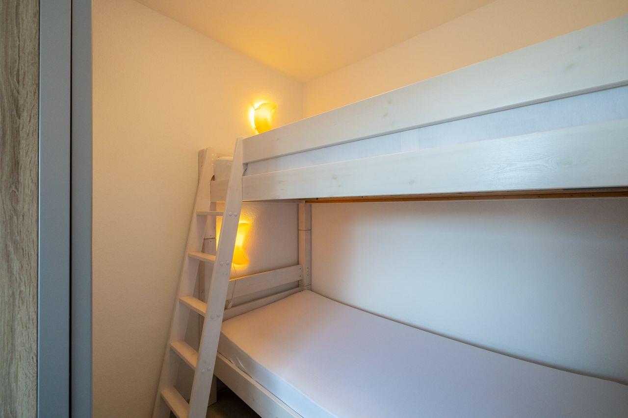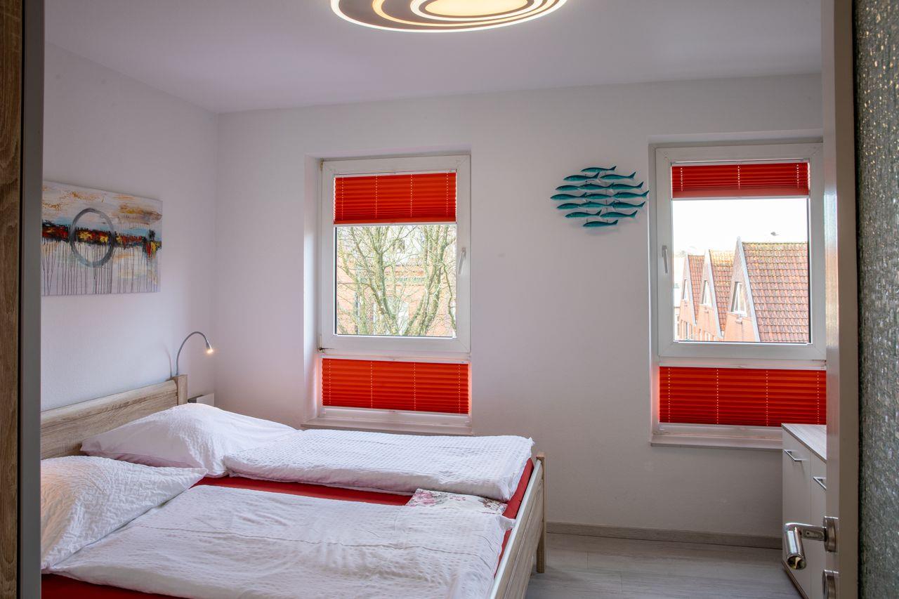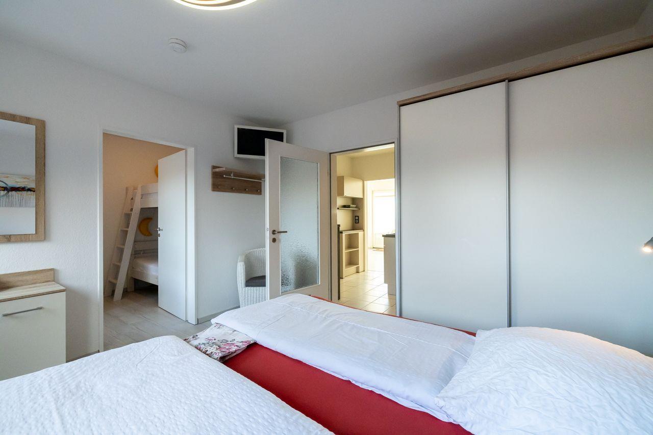 Vom Wohnungsflur zweigen ab: die praktische Küchenzeile, das großzügige Wohnzimmer (mit Ausziehcouch als 5.Schlafmöglichkeit), ein Schlafraum mit einem Doppelbett und ein Kinderschlafraum mit Etagenbetten (2 Meter). Ebenso hat diese Wohnung tief herunter gezogene Fenster. Die Küchenzeile ist gut ausgestattet. Vorhanden sind: eine Mikrowelle, eine Spülmaschine und ein Cerankochfeld. Das Duschbad ist in einem neuen Zustand. Zur Ausstattung gehören: großflächige Fliesen und eine moderne Duschkabine.