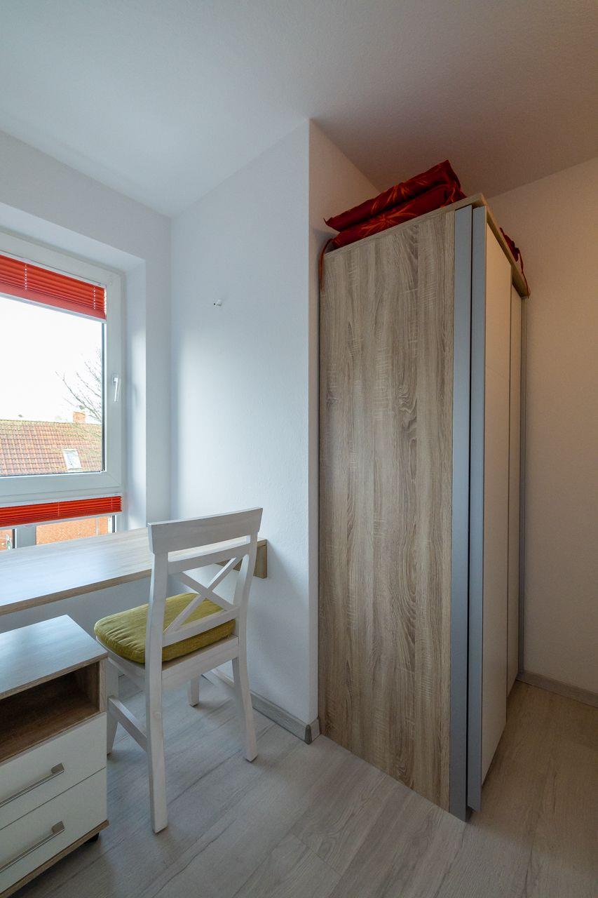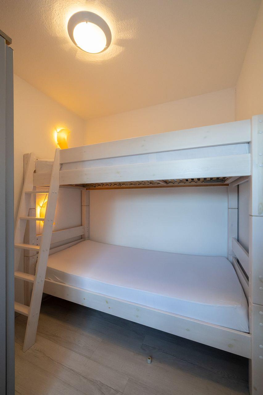 Vom Wohnungsflur zweigen ab: die praktische Küchenzeile, das großzügige Wohnzimmer (mit Ausziehcouch als 5.Schlafmöglichkeit), ein Schlafraum mit einem Doppelbett (180x200) und ein Kinderschlafraum mit Etagenbetten (90x200). Ebenso hat diese Wohnung tief herunter gezogene Fenster. Die Küchenzeile ist gut ausgestattet. Vorhanden sind: eine Mikrowelle, eine Spülmaschine und ein Cerankochfeld. Das Duschbad ist in einem neuen Zustand. Zur Ausstattung gehören: großflächige Fliesen und eine moderne Duschkabine.