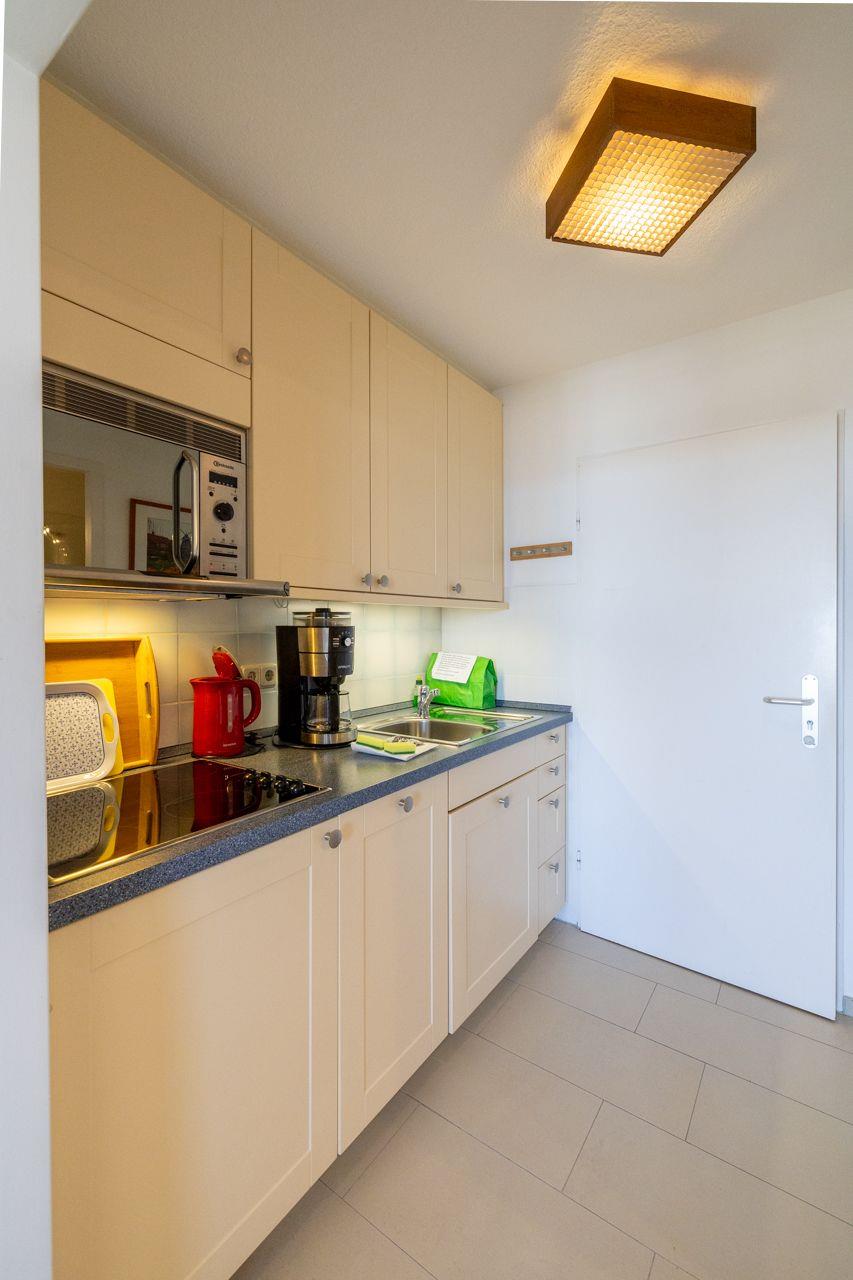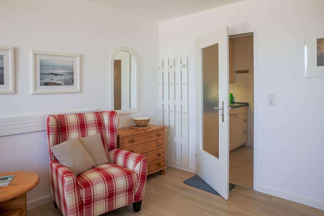 Die Wohnung selbst ist über wenige Treppenstufen erreichbar und liegt im 1. Obergeschoss. Besonders hervorzuheben ist der direkte Blick auf das Meer Richtung Osten. Hier lassen sich die eigenen Kinder beim Spielen beobachten.
