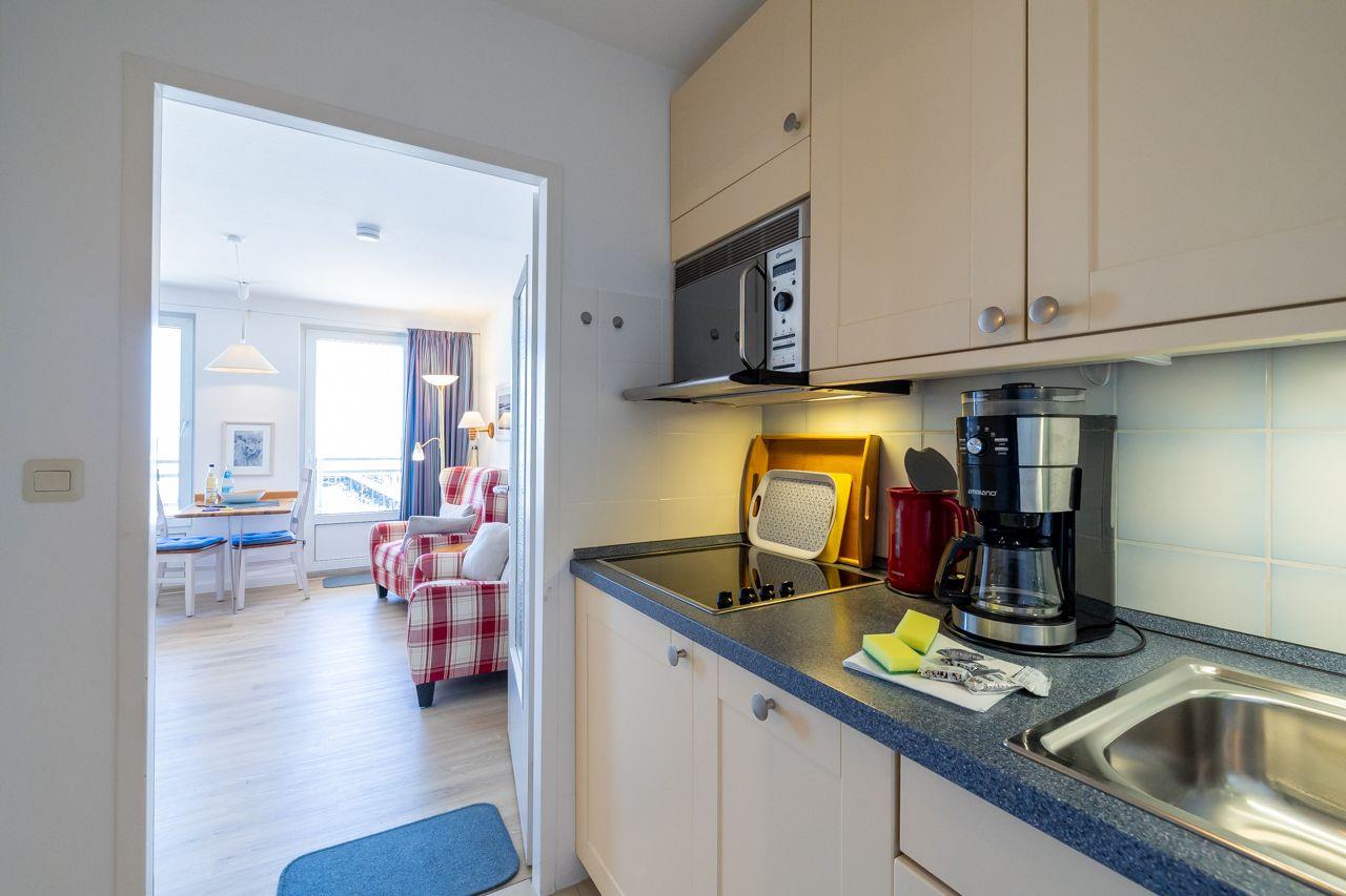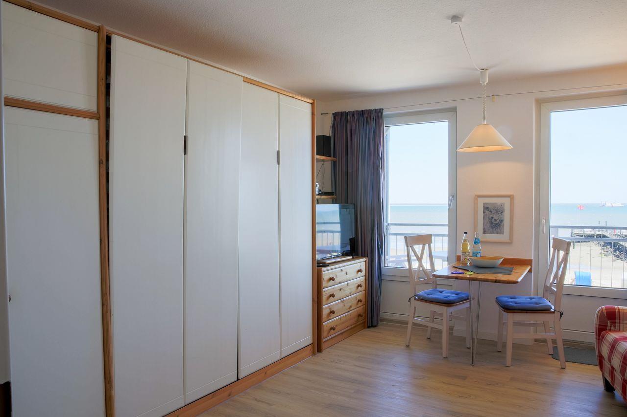 Die Wohnung besteht aus einem Wohnschlafraum mit einem Doppelschrankbett, modernem Duschbad und einer Küchenzeile (Mikrowelle und Spülmaschine). Ebenso hat diese Wohnung eine große Tür und Fenster mit Balkon zum Wasser, mit uneingeschränkten Meerblick. W-Lan, Satelliten-TV und CD-Player, Radio sind natürlich vorhanden. Bei Bedarf stellen wir Ihnen gern ein Kinderreisebett und/ oder einen Hochstuhl kostenfrei bereit. Auf Anfrage ist die Mitnahme eines Hundes möglich.