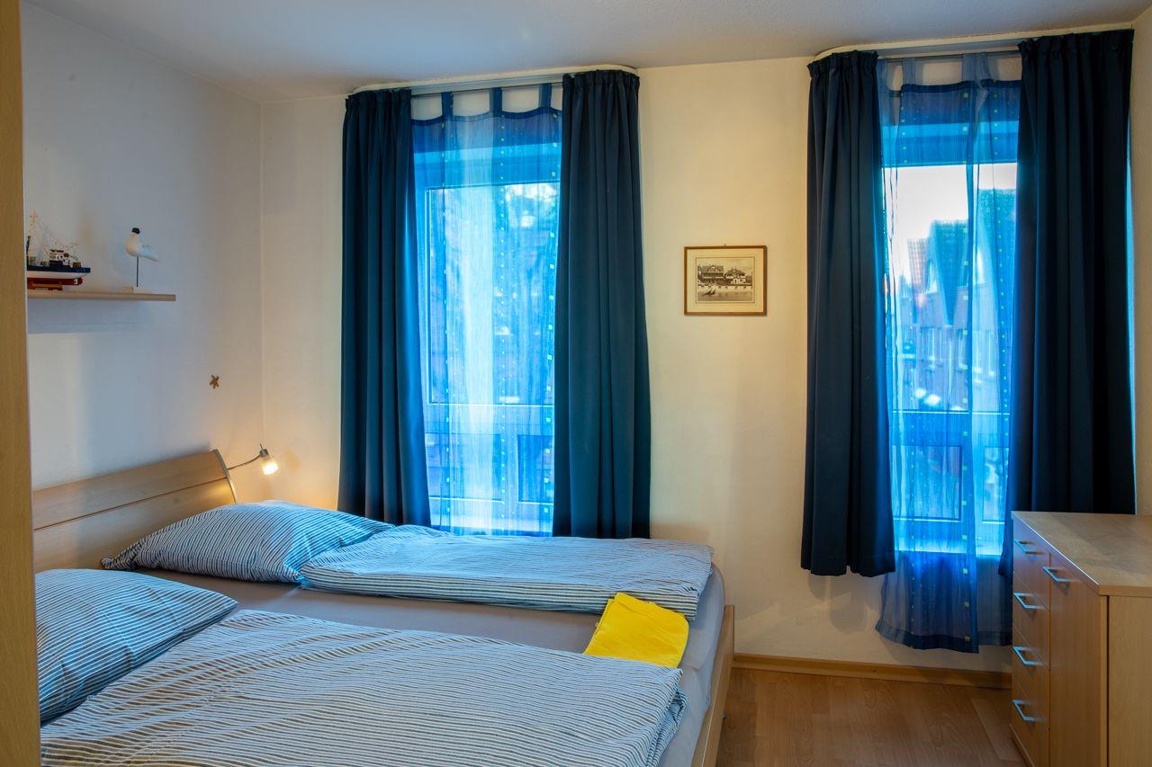 Beim Betreten der Wohnung zweigen vom Wohnungsflur die praktische Küchenzeile, das großzügige Wohnzimmer und ein Schlafraum mit einem Doppelbett ab. Das zweite Schlafzimmer, das vom Hauptschlafzimmer abgeht, ist mit einem Etagenbett (zwei Mal 90*200 cm) ausgestattet und verfügt ebenfalls über tief heruntergezogene Fenster. Die gut ausgestattete Küchenzeile bietet eine Mikrowelle, eine Spülmaschine und ein Cerankochfeld für die Zubereitung köstlicher Mahlzeiten. Das Duschbad präsentiert sich in neuem Zustand und überzeugt mit großflächigen Fliesen sowie einer modernen Duschkabine.