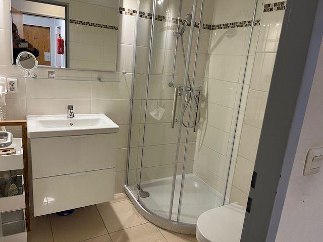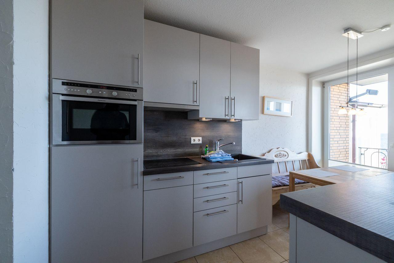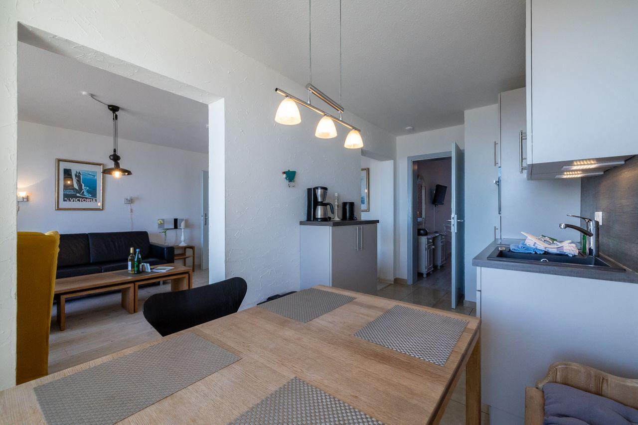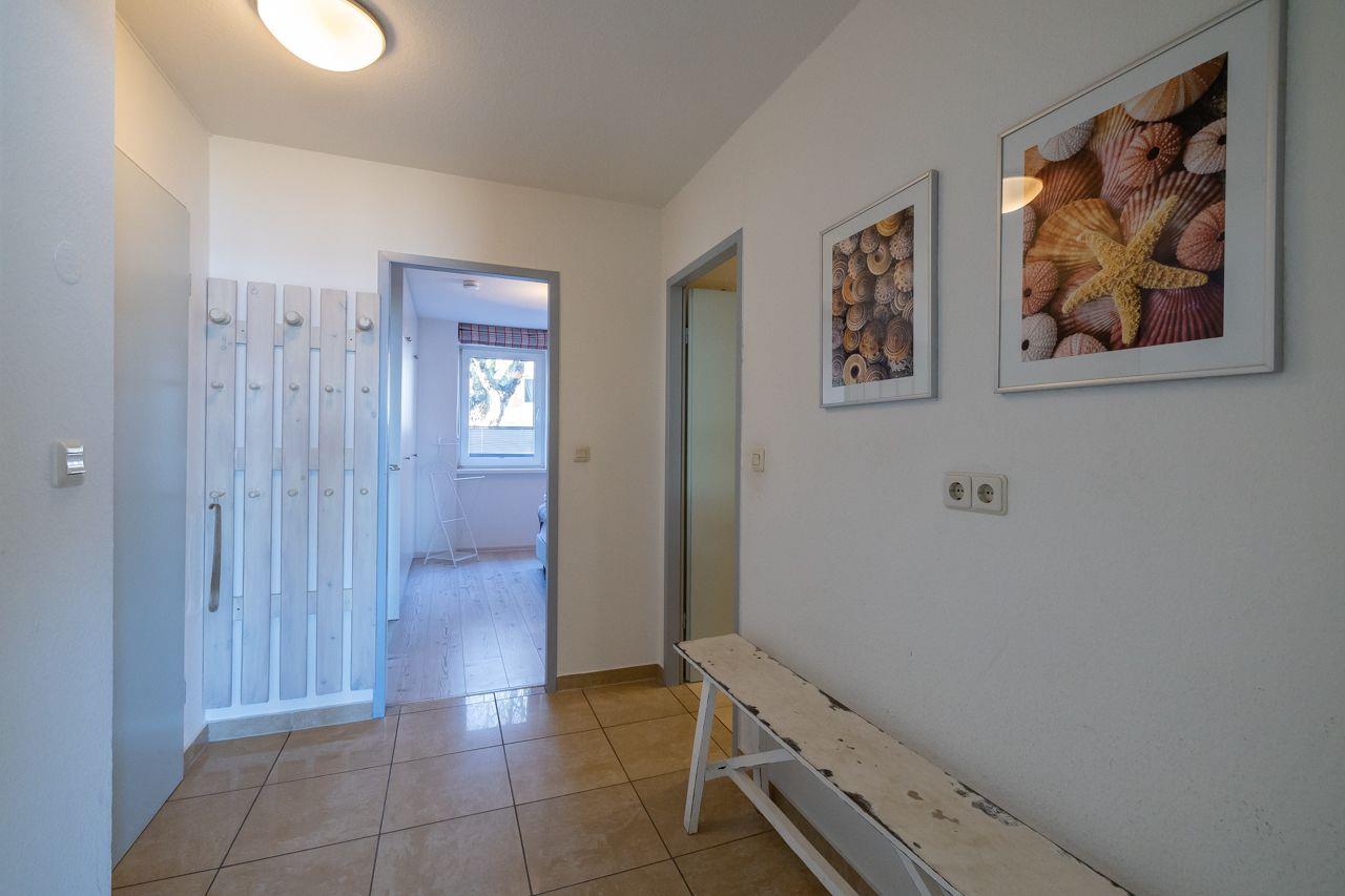 Vom Wohnungsflur aus gelangen Sie ins das große Schlafzimmer mit Doppelbett, das moderne Duschbad und das lichtdurchflutete Wohnzimmer mit Meerblick und Terrasse. Die separate Küche hochwertig, gut ausgestattet und bietet Ihnen einen Sitzplatz mit Meerblick. Von hier aus haben Sie ebenfalls Zugang zu einer weiteren Terrasse und zum 2. Schlafzimmer. In der neuen Küche finden Sie u.a. eine Mikrowelle, eine Spülmaschine und ein Cerankochfeld vor. Das Duschbad ist ebenfalls neu und verfügt über eine Dusche. Zur Ausstattung gehören: großflächige, helle Fliesen und eine moderne Duschkabine.