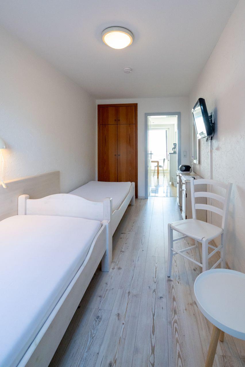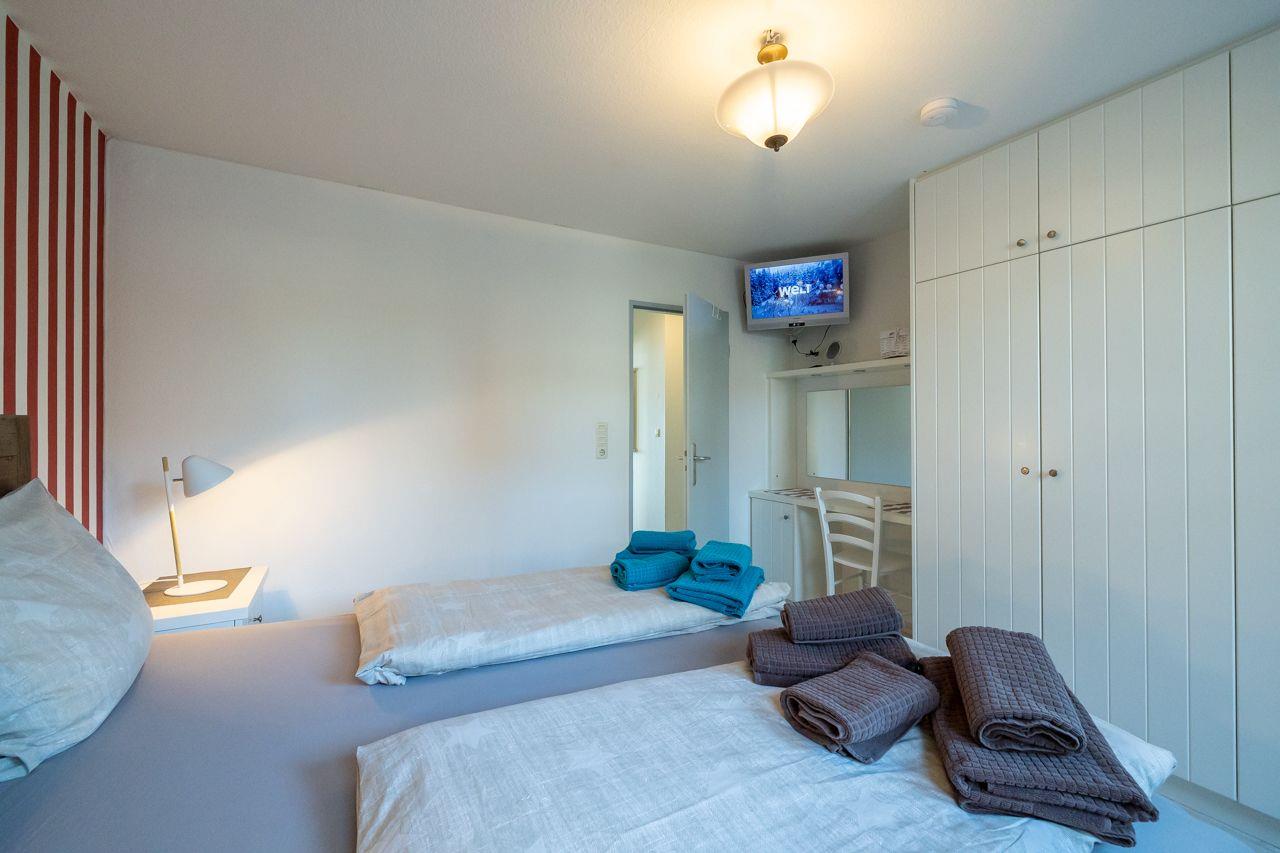 Vom Wohnungsflur aus gelangen Sie ins das große Schlafzimmer mit Doppelbett (180x200), das moderne Duschbad und das lichtdurchflutete Wohnzimmer mit Meerblick und Terrasse. Die separate Küche hochwertig, gut ausgestattet und bietet Ihnen einen Sitzplatz mit Meerblick. Von hier aus haben Sie ebenfalls Zugang zu einer weiteren Terrasse und zum 2. Schlafzimmer mit zwei Einzeln betten (90x200) . In der neuen Küche finden Sie u.a. eine Mikrowelle, eine Spülmaschine und ein Cerankochfeld vor. Das Duschbad ist ebenfalls neu und verfügt über eine Dusche. Zur Ausstattung gehören: großflächige, helle Fliesen und eine moderne Duschkabine.