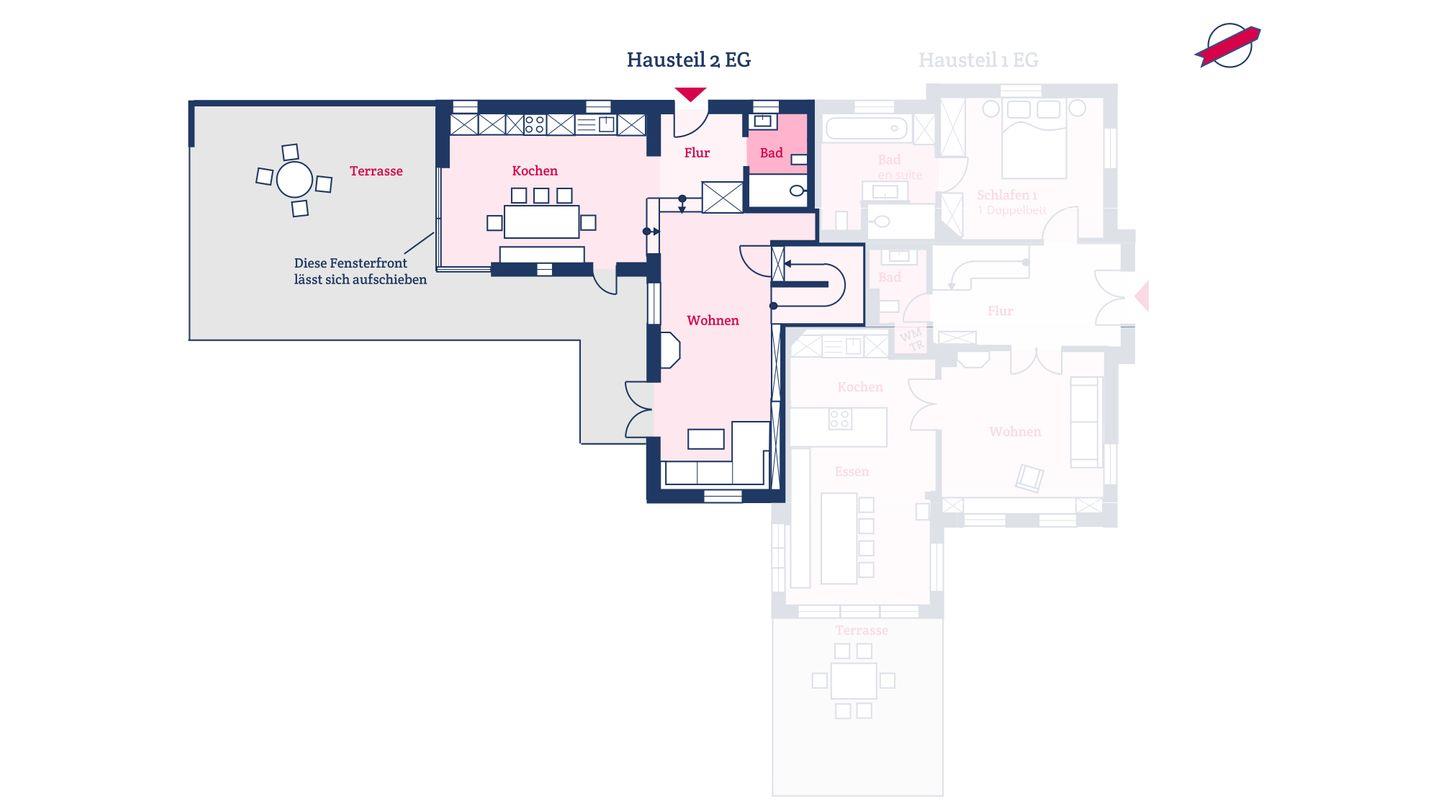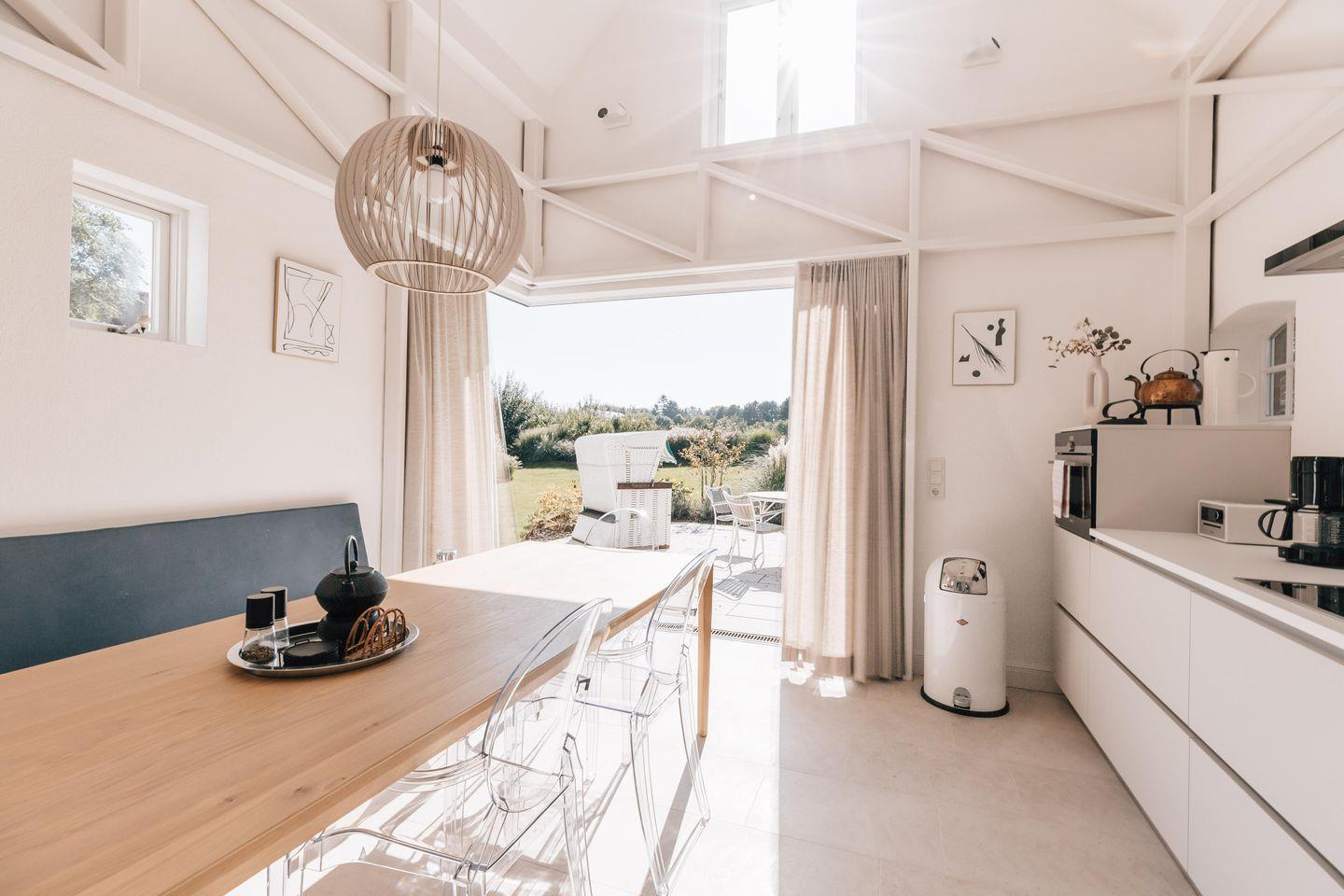 Im Erdgeschoss befinden sich der großzügige Wohnbereich mit offener Küche, ein Duschbad sowie ein Hauswirtschaftsraum mit Waschmaschine und Trockner. Über den Wohnbereich gelangen Sie direkt auf die Terrasse und in den eigenen Garten. Der Ofen sorgt auch an kühleren Tagen für eine angenehme Atmosphäre. Ein Highlight der Ferienunterkunft stellt sicherlich die Küche dar, die Ihnen zusätzlich zu der hochwertigen Ausstattung auch die einzigartige Möglichkeit bietet, die gesamte Glasfassade zur Terrasse zu öffnen und somit Küche und Terrasse zu einem Raum verschmelzen zu lassen.