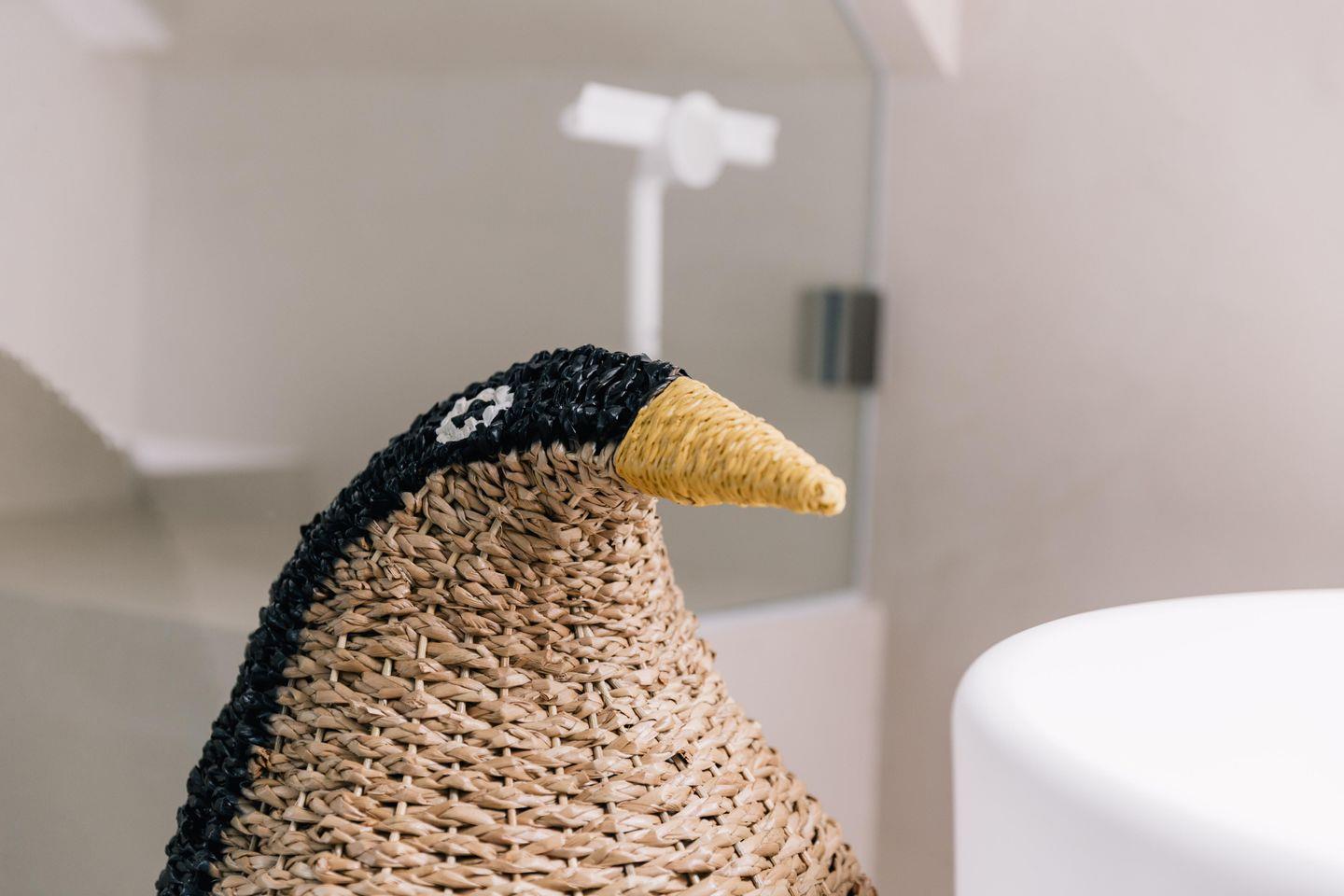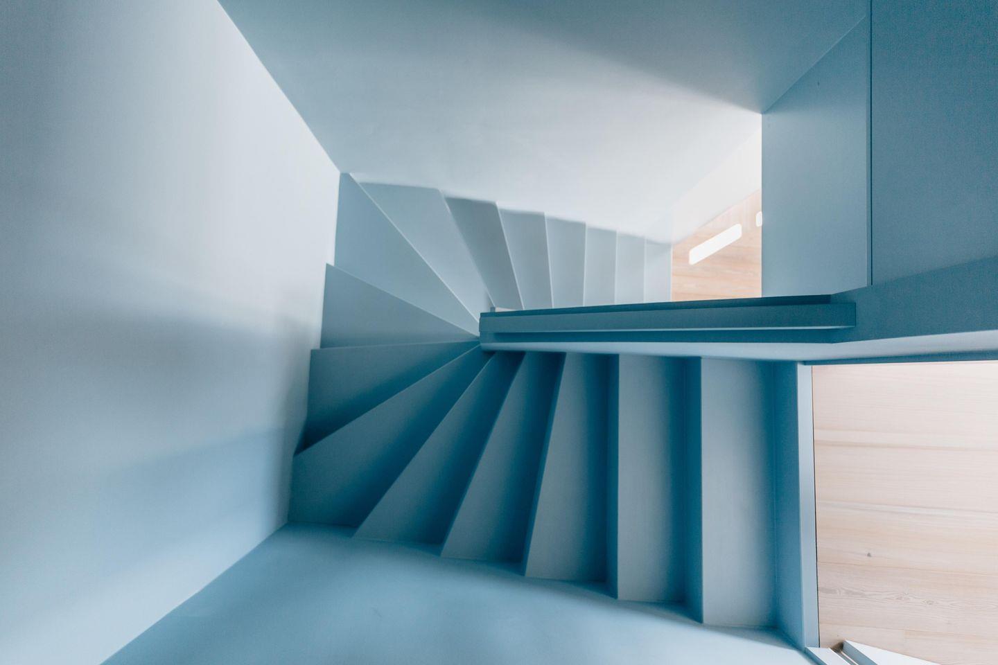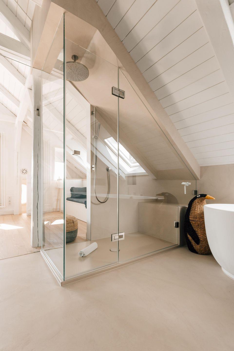 Im Obergeschoss ist das Schlafzimmer für 3 Personen mit Vollbad en Suite und begehbarem Kleiderschrank gelegen. Das Schlafzimmer verfügt über ein Doppelbett und ein ausziehbares Einzelbett. Die Treppe zum Erdgeschoss lässt sich hinter einer Schiebetür "verstecken".