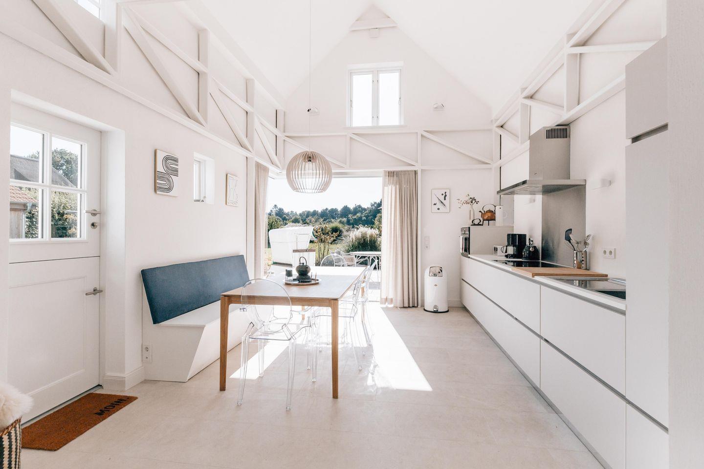 Zu den Highlights der Ferienunterkunft zählen wir u. a. den Kaminofen sowie die Terrasse im eigenen Garten, welche sich über eine vollständig öffnende Glasfassade mit der Küche verbinden lässt. Das einzigartige Raumkonzept zur Sanierung des Hauses wurde von einer Innenarchitektin entwickelt.