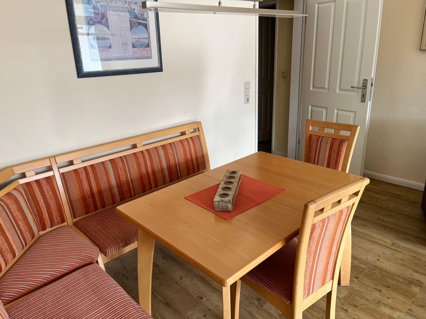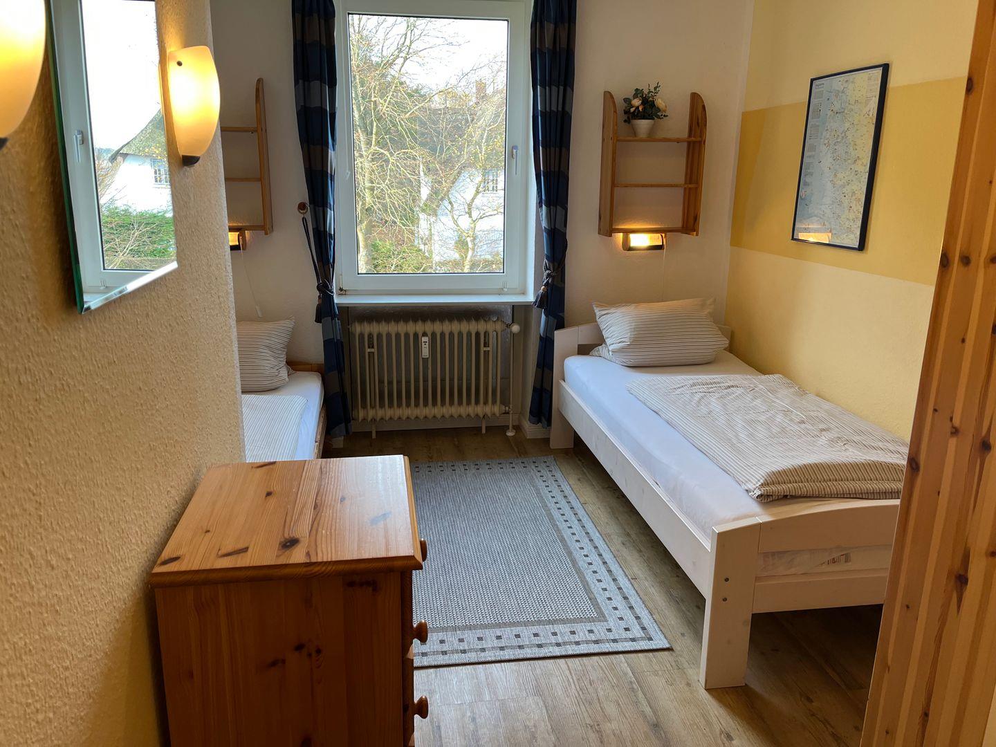 Direkt am Meer gelegen finden Sie in dieser Ferienwohnung in der 1. Etage (ab Hochparterre gibt es einen Fahrstuhl, bis dahin sind es ca. 7 Stufen) ein kombiniertes Wohn-Esszimmer, von dem Sie in die separate Küche gelangen. Vom überdachten Balkon haben Sie einen tollen Blick auf die Nordsee und ihre Halligen. Das Badezimmer mit Dusche ist hell und freundlich. Es steht Ihnen ein Schlafzimmer mit zwei getrennten Betten (je 90*200cm) und ein Schlafzimmer mit einem kleinen Doppelbett (140*200cm) zur Verfügung. So gelingt ein Urlaub allein oder zu zweit und auch mit der ganzen Familie. Auch Ihr Hund ist nach Absprache herzlich willkommen. Im Fahrradraum, der sich im Keller des Hauses befindet, ist Ihr Zweirad gut aufgehoben. Das Schwimmbad (kostenlos) und die Sauna (gegen Gebühr) im Nachbarhaus Uthlande stehen Ihnen zur Verfügung. Bitte beachten Sie, dass es aufgrund der Pandemie und der aktuellen Landesverordnung zu Einschränkungen der Nutzung kommen kann. Daraus ergibt sich keine Mietminderung. Der Mindestaufenthalt beträgt 3 Übernachtungen.