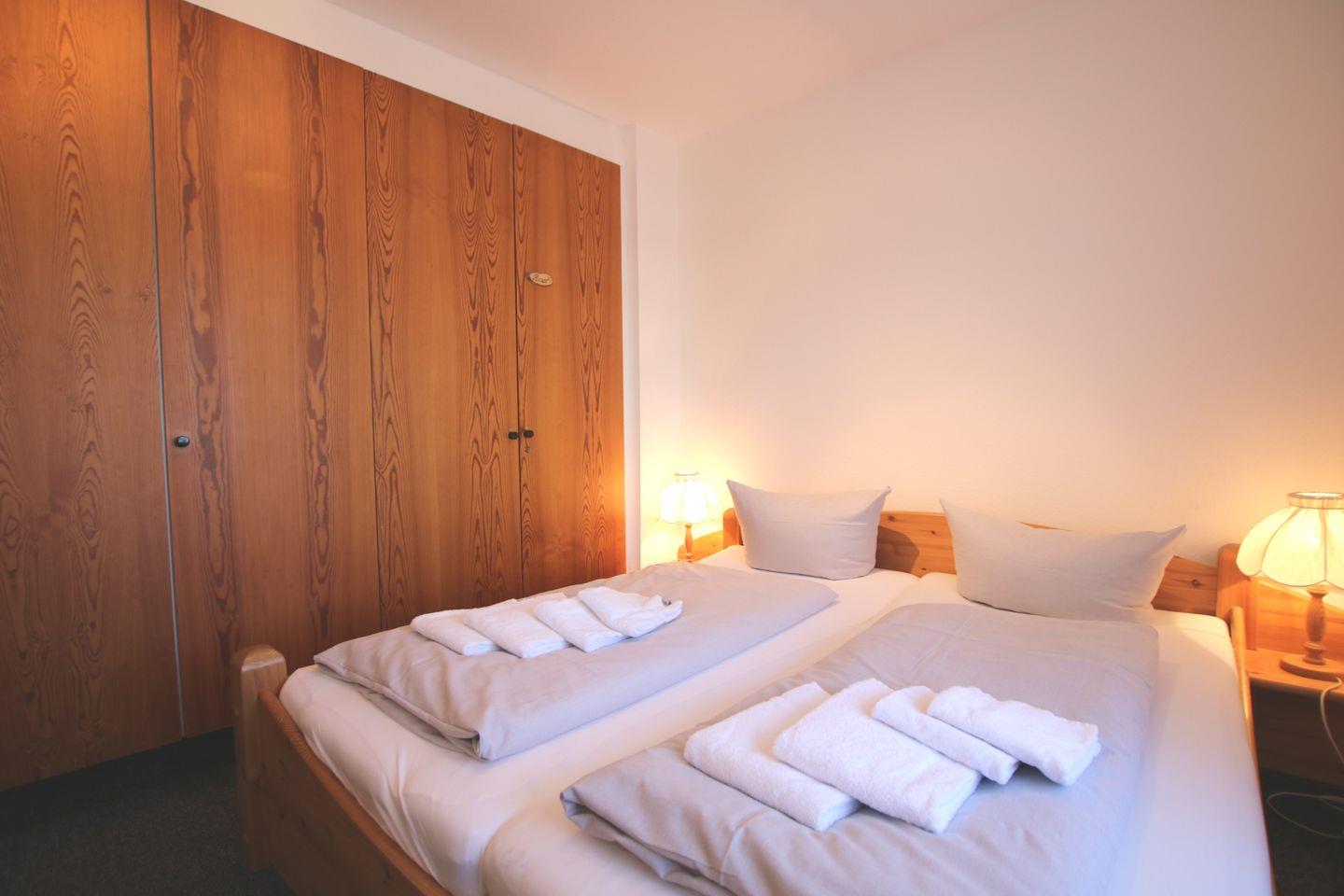 - Schafzimmer mit Doppelbett (180 x 200 cm) und Kleiderschrank und Stuhl