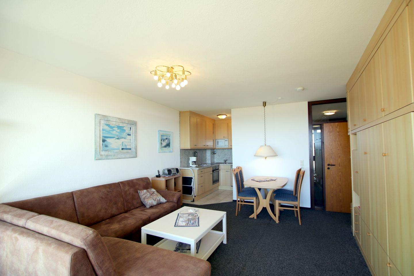 - Wohnzimmer mit Couch, Schrankbett, Esstisch mit 4 Stühlen und Küchenzeile