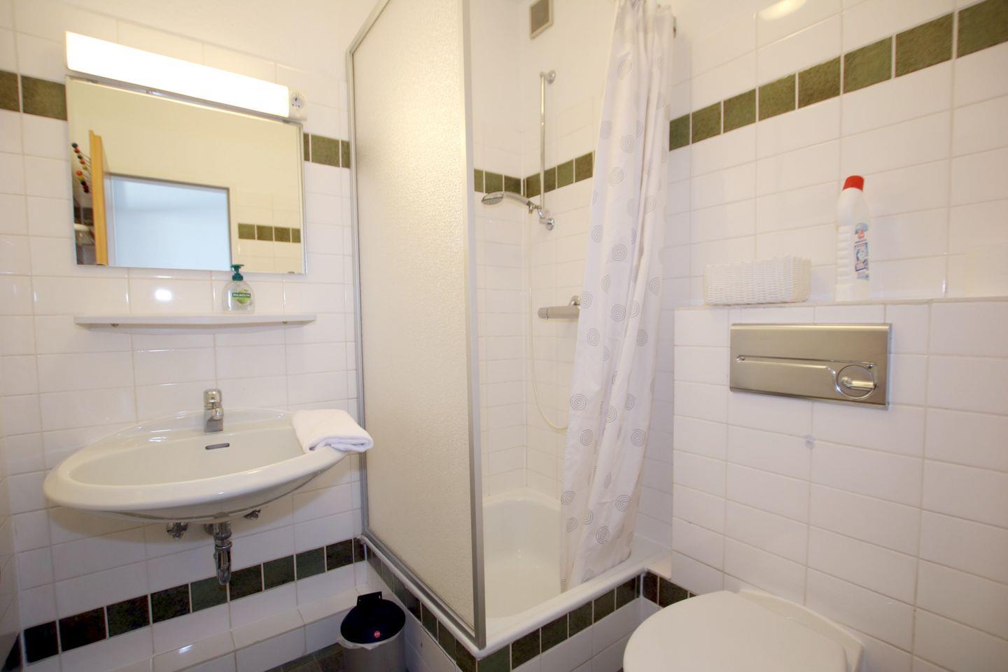 BAD mit Dusche und WC, mit Fliesen.