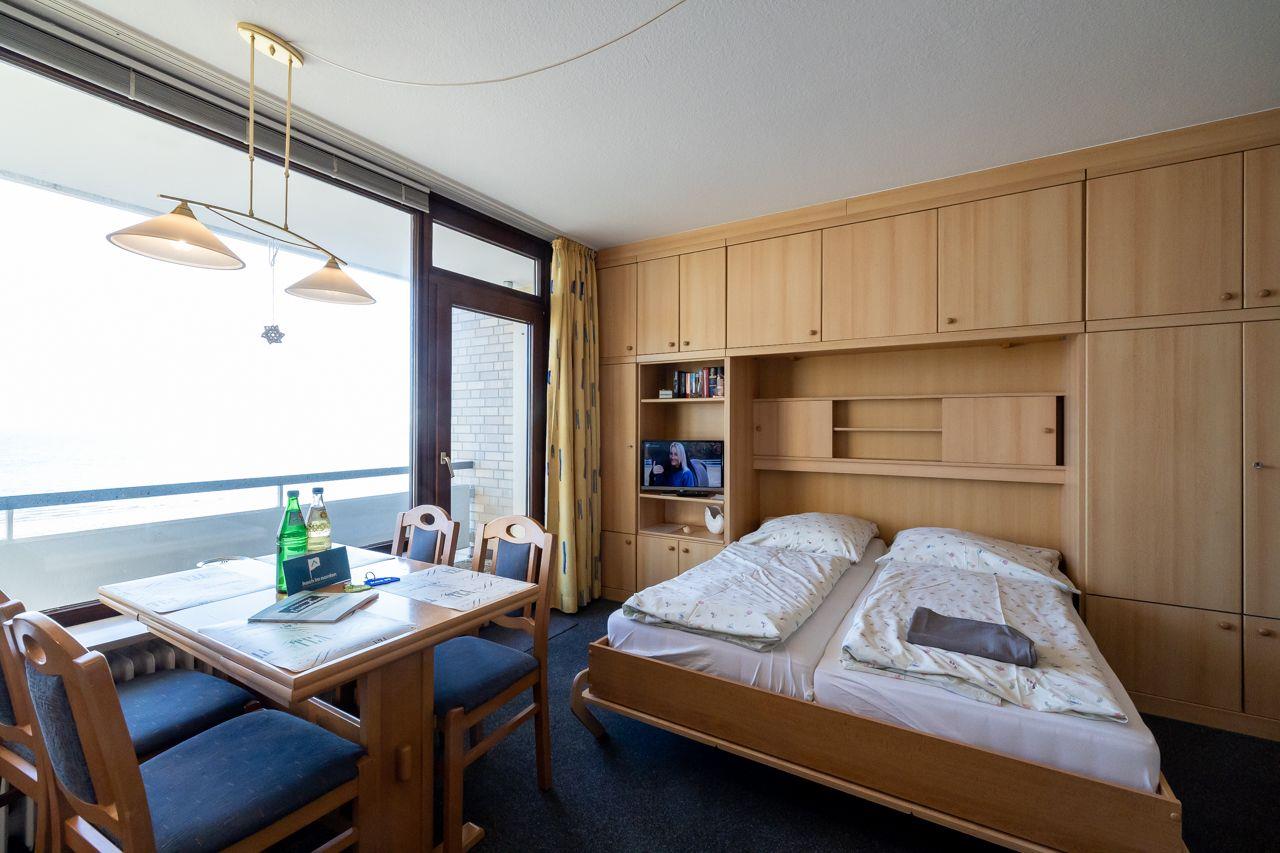Das Appartement bietet einen kombinierten Wohn-Ess-Küchenbereich, der modern und einladend gestaltet ist. Hier können Sie entspannen, speisen und den Ausblick auf das Meer gleichermaßen genießen. Das Schlafzimmer verfügt über zwei Einzelbetten und bietet eine gemütliche Rückzugsmöglichkeit. Das moderne Duschbad mit Fenster sorgt für Frische und Komfort.