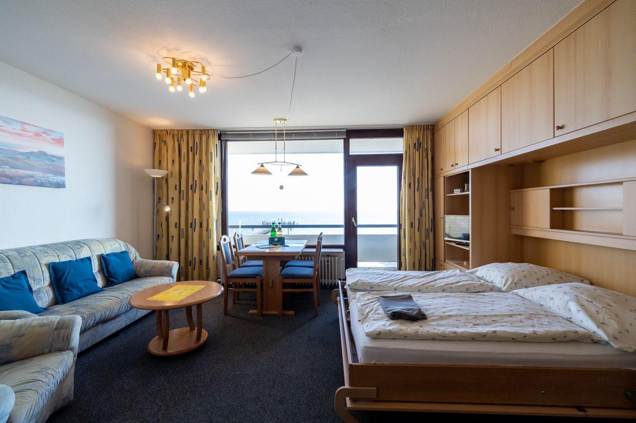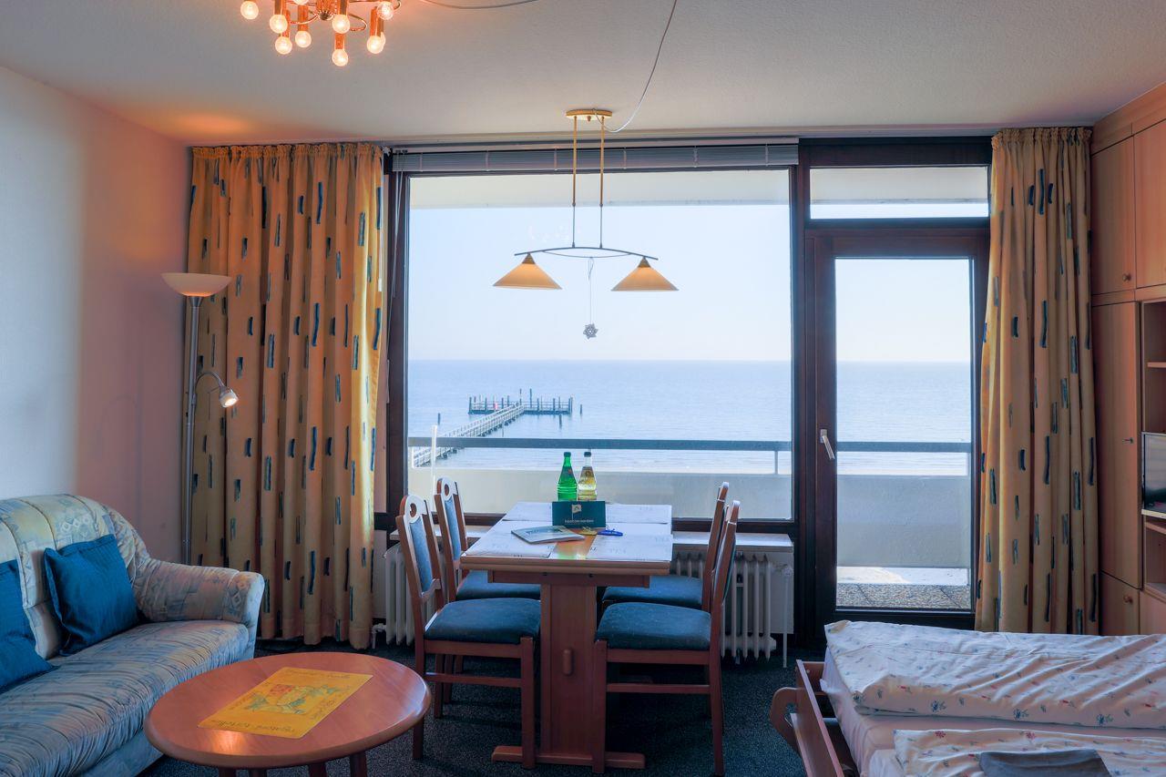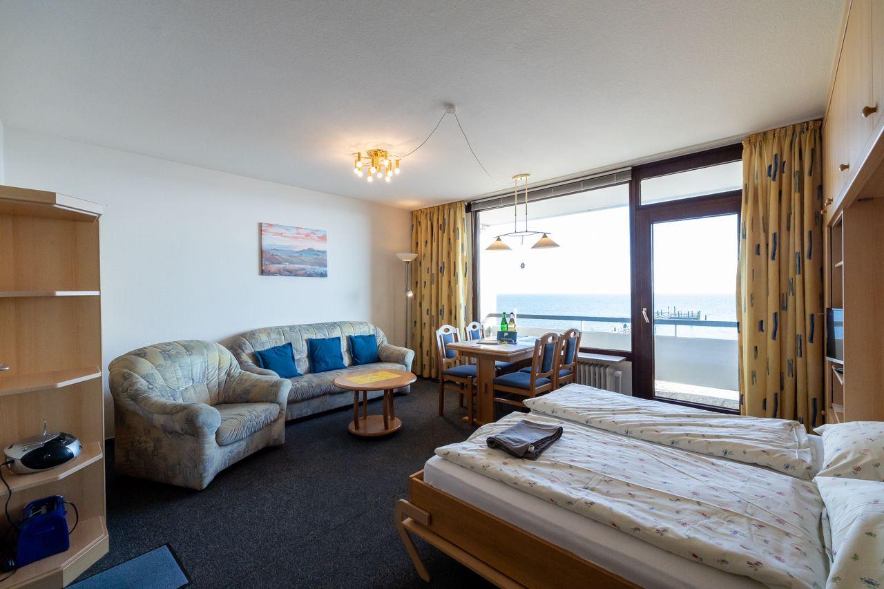Im 1. Stock, bequem per Fahrstuhl erreichbar (ab Hochparterre, ca. 8 Treppenstufen), bietet dieses Appartement einen herrlichen Meerblick, der das Innere hell und freundlich macht. Der überdachte Balkon ermöglicht es Ihnen, auch bei Regen die Nordsee und die Halligen zu genießen. Das Appartement verfügt über einen kombinierten Wohn-Ess-Küchenbereich, ein Schlafzimmer mit zwei Einzelbetten und ein modernes Duschbad mit Fenster. Die gut ausgestattete Küche beinhaltet unter anderem eine Mikrowelle, während ein TV, Radio und W-Lan für Unterhaltung sorgen.