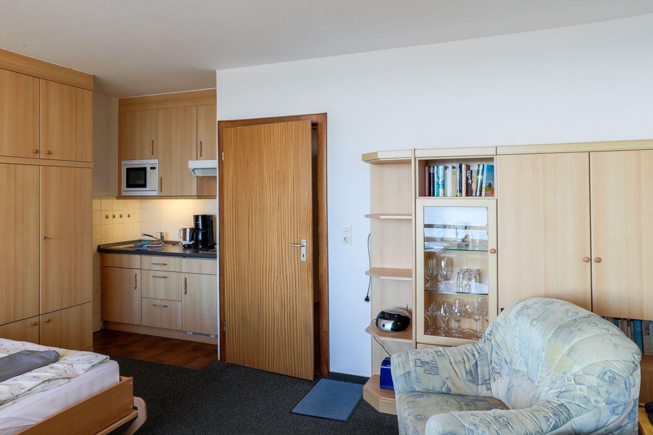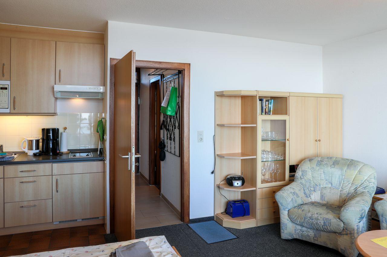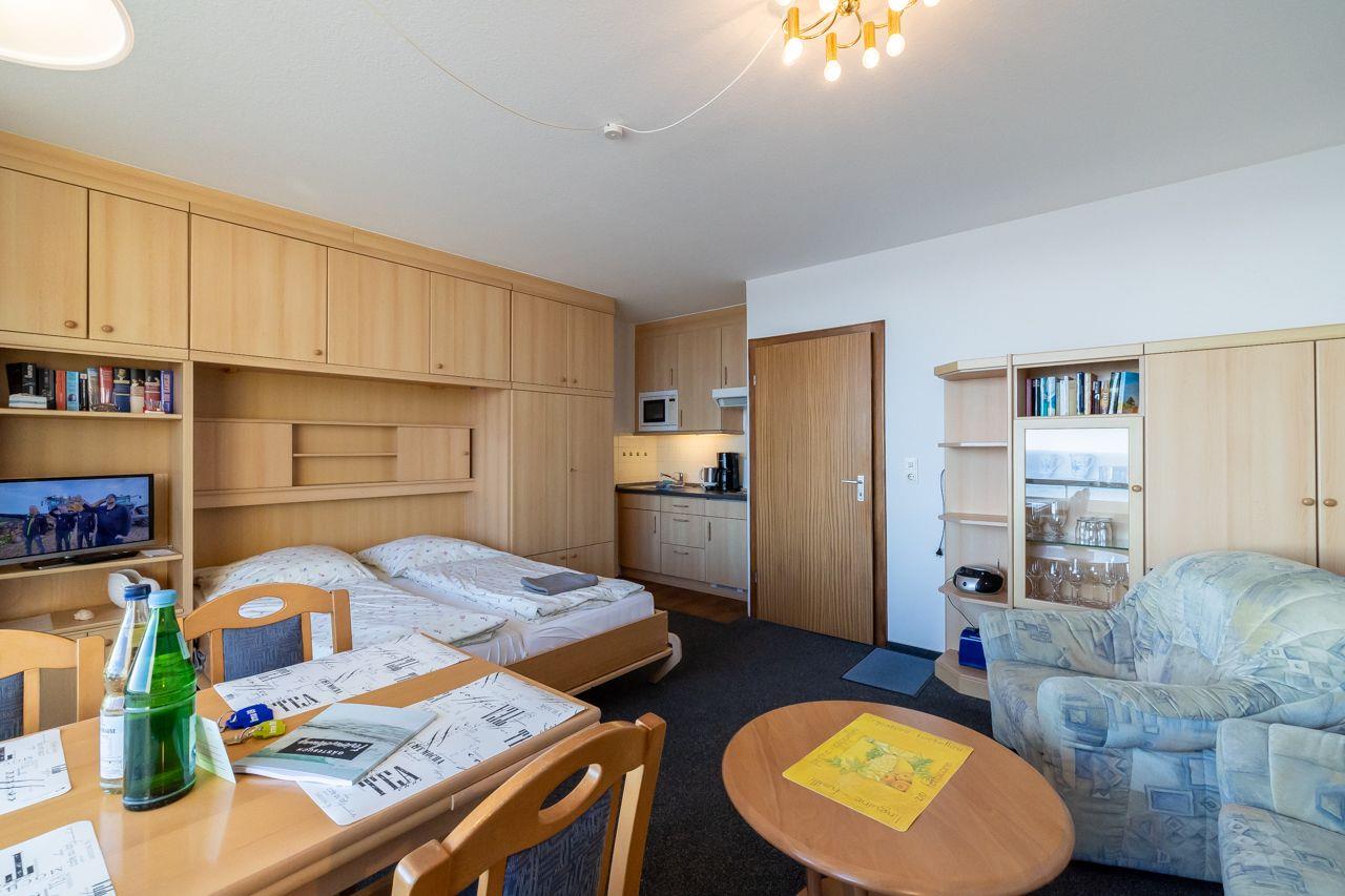 Im 1. Stock, bequem per Fahrstuhl erreichbar (ab Hochparterre, ca. 8 Treppenstufen), bietet dieses Appartement einen herrlichen Meerblick, der das Innere hell und freundlich macht. Der überdachte Balkon ermöglicht es Ihnen, auch bei Regen die Nordsee und die Halligen zu genießen. Das Appartement verfügt über einen kombinierten Wohn-Ess-Küchenbereich, ein Schlafzimmer mit zwei Einzelbetten und ein modernes Duschbad mit Fenster. Die gut ausgestattete Küche beinhaltet unter anderem eine Mikrowelle, während ein TV, Radio und W-Lan für Unterhaltung sorgen.