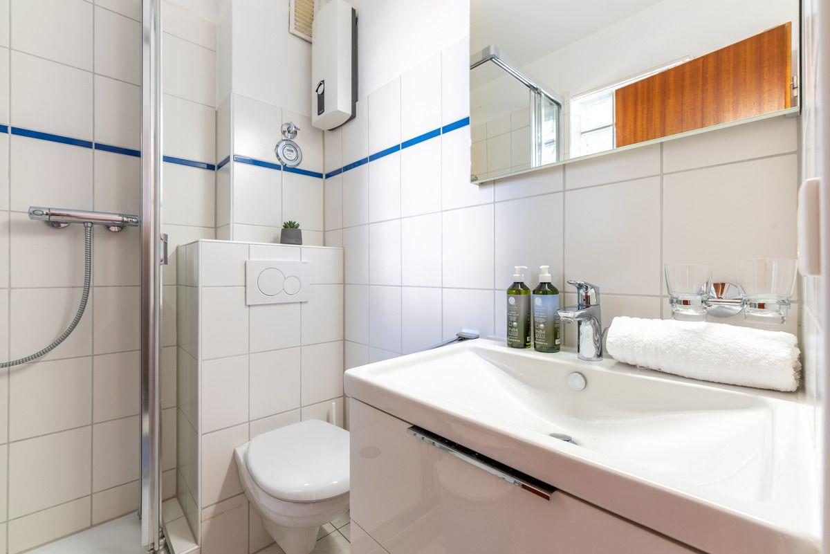 Die Wohnung befindet sich im ersten Stock und begeistert mit einem offenen Wohnkonzept, das Wohnzimmer, Essbereich und Küche sowie ein neues kleines Duschbadezimmer mit WC. Des weiterem befinden sich im Wohnzimmer zwei Einzelklappbetten. Ein separates Schlafzimmer ist ebenfalls vorhanden was für eine Person ausgelegt ist. Die gesamte Wohnung ist eine Nichtraucher-Oase und mit Sichtschutz an den Fenstern versehen, um Ihre Privatsphäre zu gewährleisten.