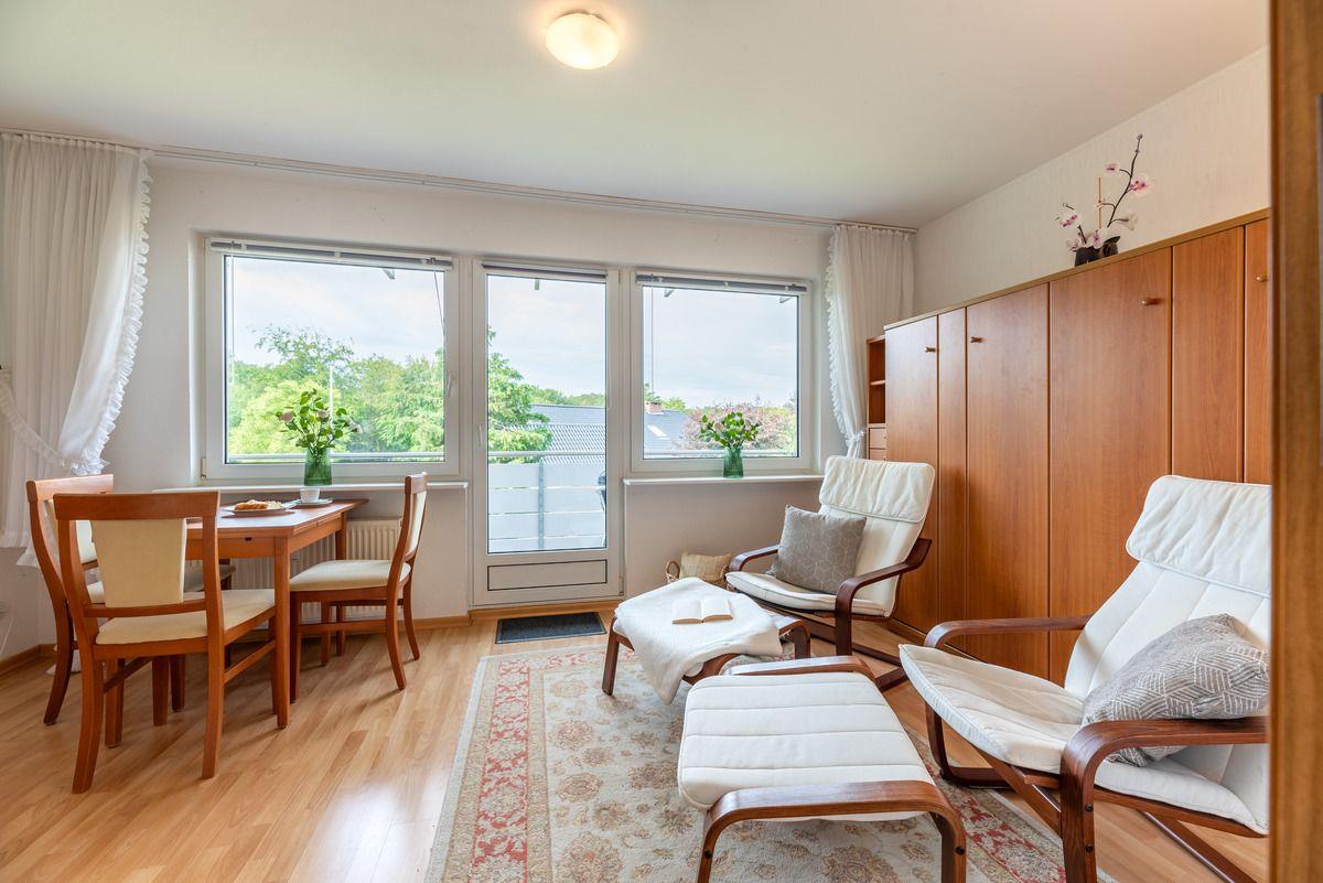 Gemütliche Ferienwohnung mit separatem Schlafzimmer, Duschbad und sonnigem Balkon. Ruhige Lage am Waldrand mit Parkplatz. Spielplatz, Bäcker und Restaurant in Laufnähe.