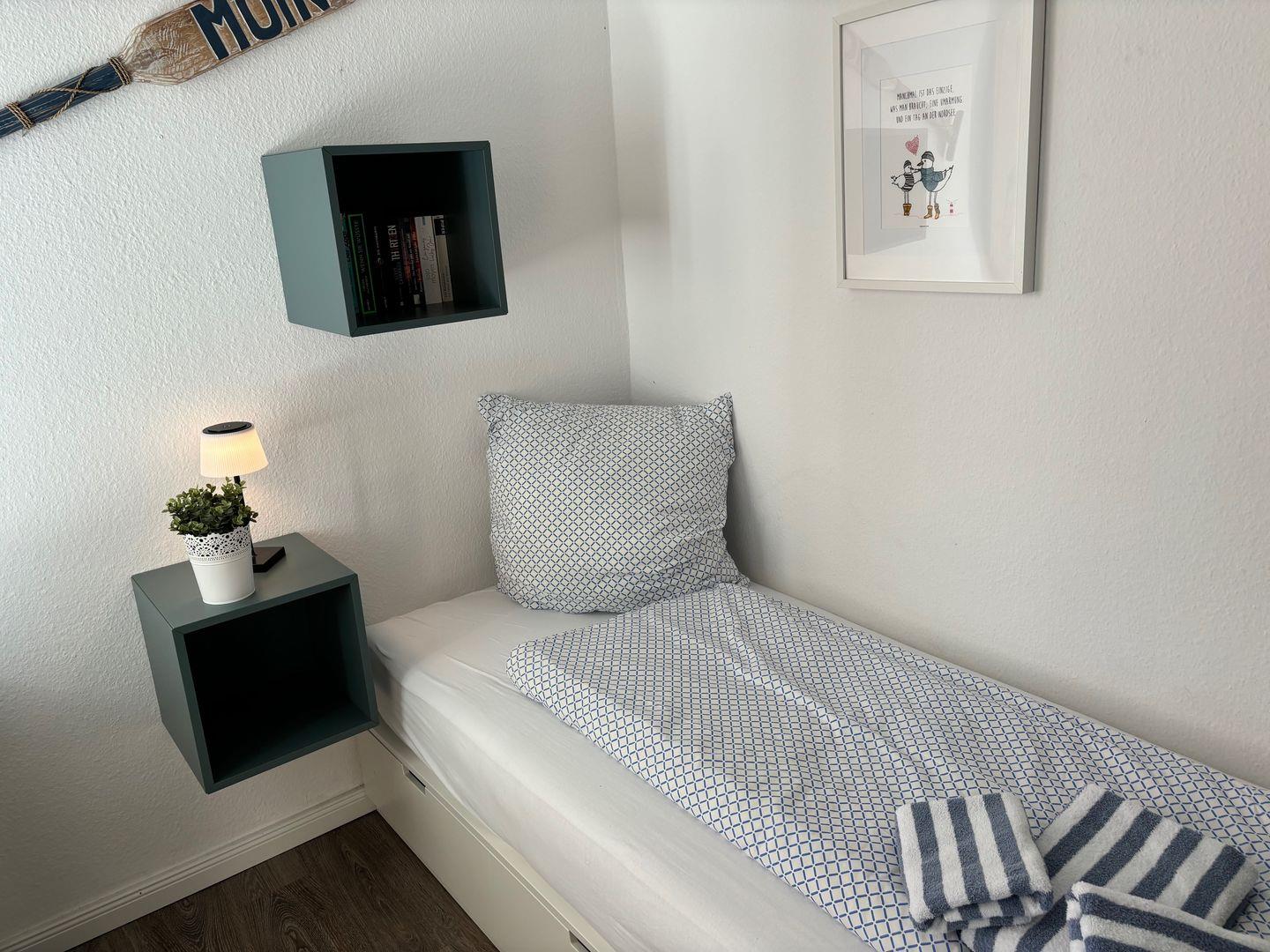 Genießen Sie Ihren Urlaub in dieser großzügigen und hellen Ferienwohnung im 2. Stock des Hauses Uthlande mit atemberaubendem Meerblick. Der moderne Wohnbereich lädt zum Entspannen ein, während die gut ausgestattete Küche alles bietet, was Sie für eine angenehme Selbstversorgung benötigen. Die Wohnung verfügt über ein Schlafzimmer mit Doppelbett (160x200 cm, 2 Matratzen) sowie ein weiteres Schlafzimmer mit zwei hintereinander stehenden Einzelbetten. Ein helles Duschbad, WLAN und ein Flachbild-TV sorgen für zusätzlichen Komfort.