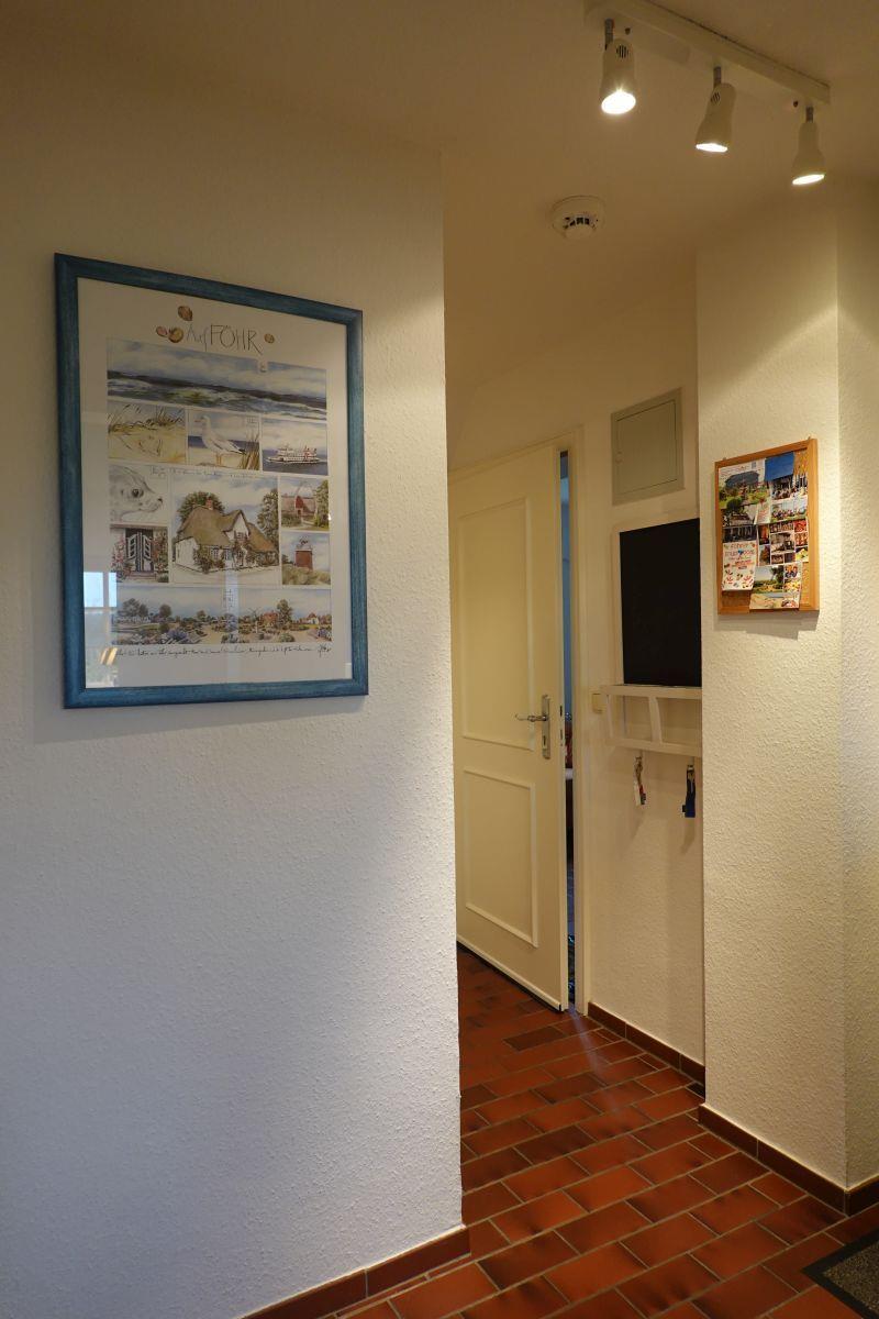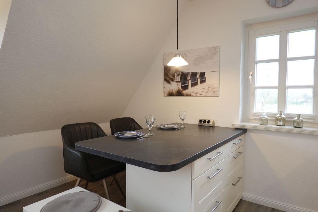 Die Wohnung Daaje liegt im 1. OG eines schönen Reetdachhauses in Wyk. Sie bietet mit ca. 51qm den stilvollen Rahmen für einen entspannten Urlaub. Hell und freundlich eingerichtet, bietet sie Platz für 2 Personen, evtl. mit kleinem Hund. Der große Essbereich mit angegliederter moderner Küchenzeile, das angegliederte Wohnzimmer oder auch im großen Schlafzimmer, überall findet man viel Platz. Die große Terrasse mit Rasenfläche im Erdgeschoss rundet das schöne Gesamtpaket hervorragend ab.
