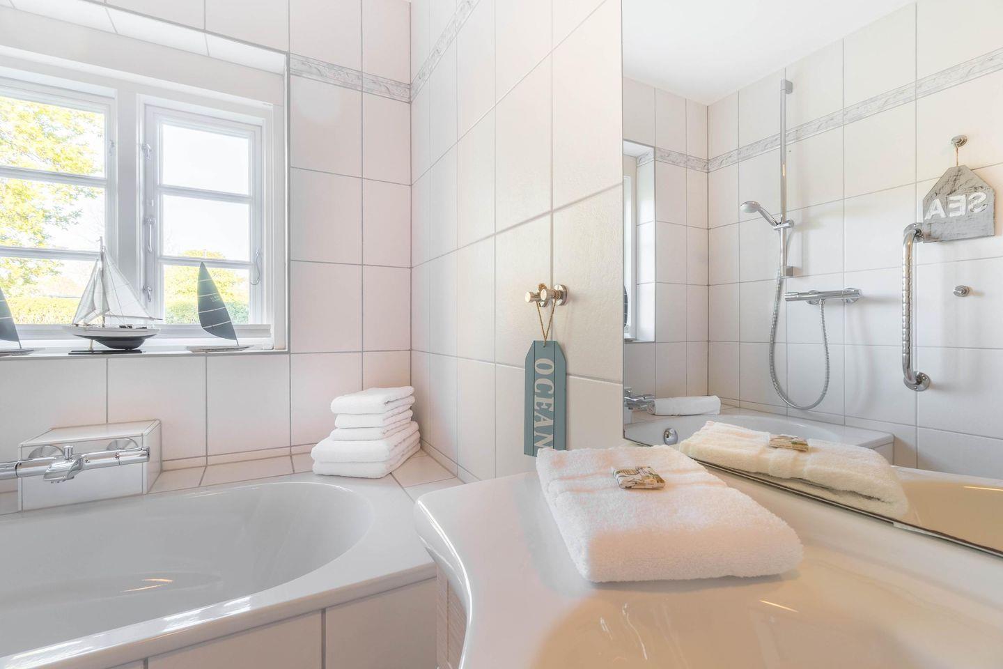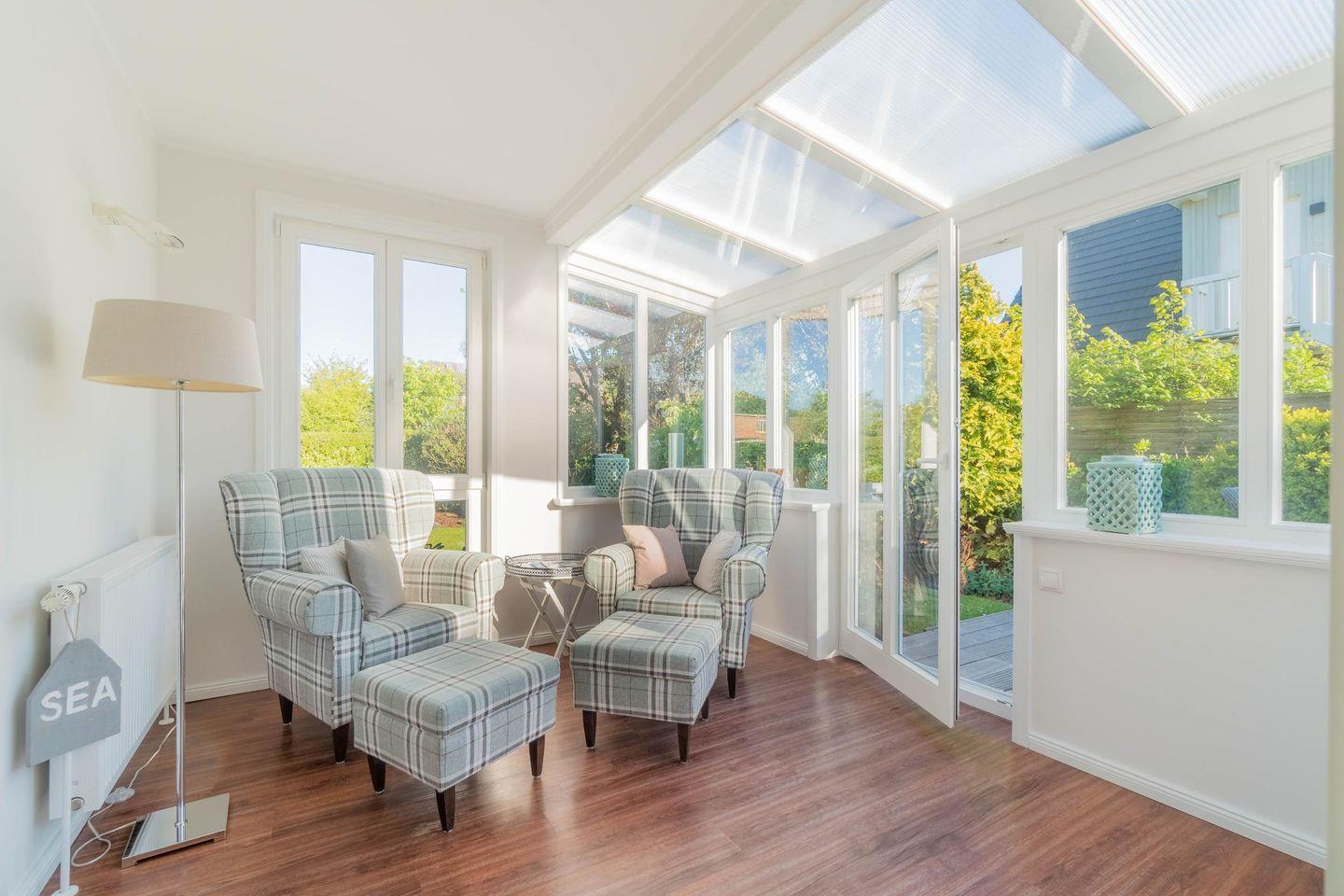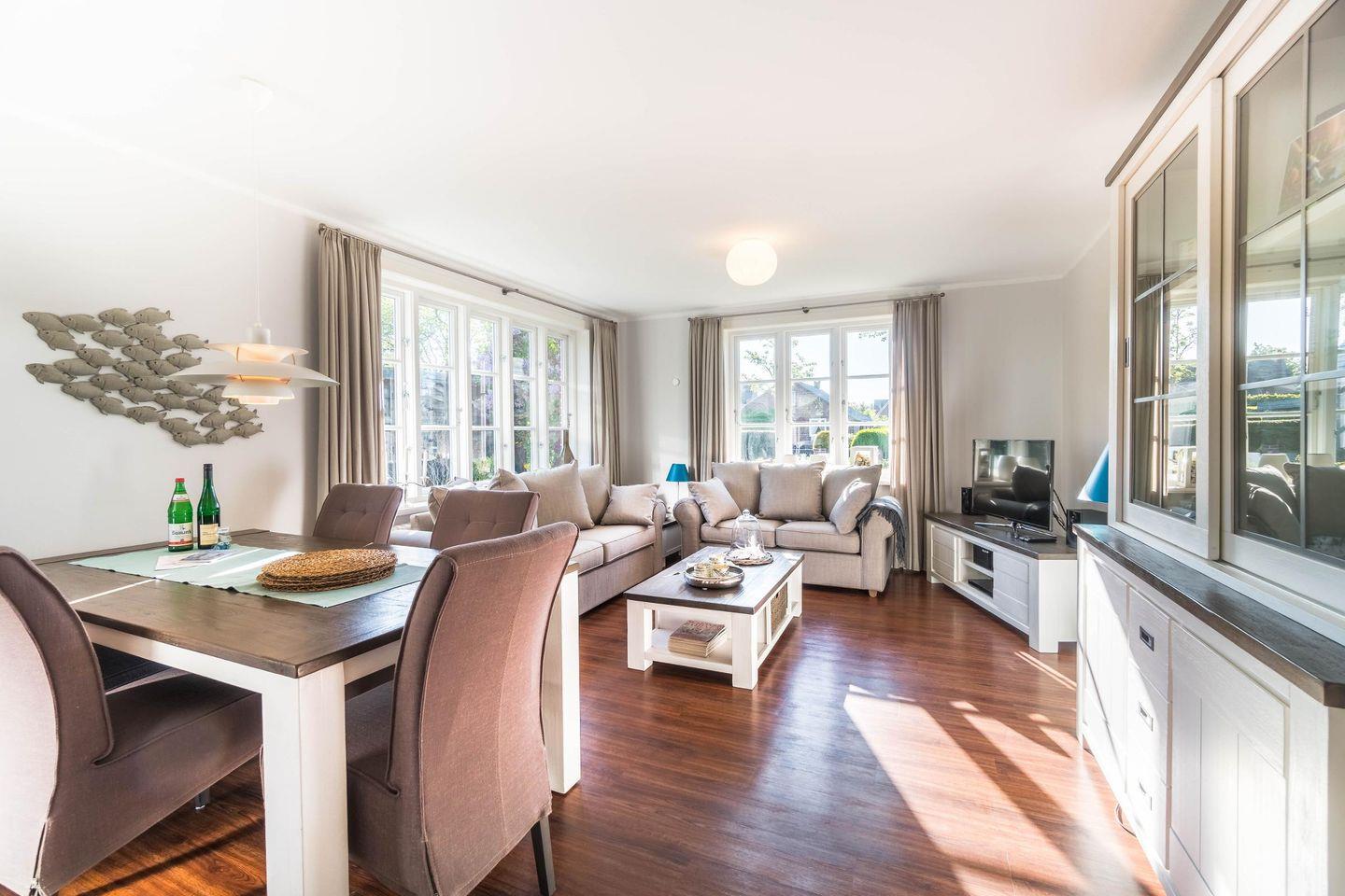 Die großzügige, ca. 120 m² große Wohnung "Rose" liegt im Erdgeschoss des Hauses und bietet Ihnen ein offenes Wohn-Esszimmer mit separater Küche, zwei Doppelbett-Schlafzimmer, ein Vollbad mit Dusche und Wanne, ein Duschbad und einen Wintergarten, von dem aus Sie auf die eigene Terrasse und in den gemeinschaftlich genutzten Garten gelangen. Zudem befindet sich im Souterrain ein weiterer Aufenthaltsraum mit einem Schlafsofa, einem Sessel und einem Smart-TV.