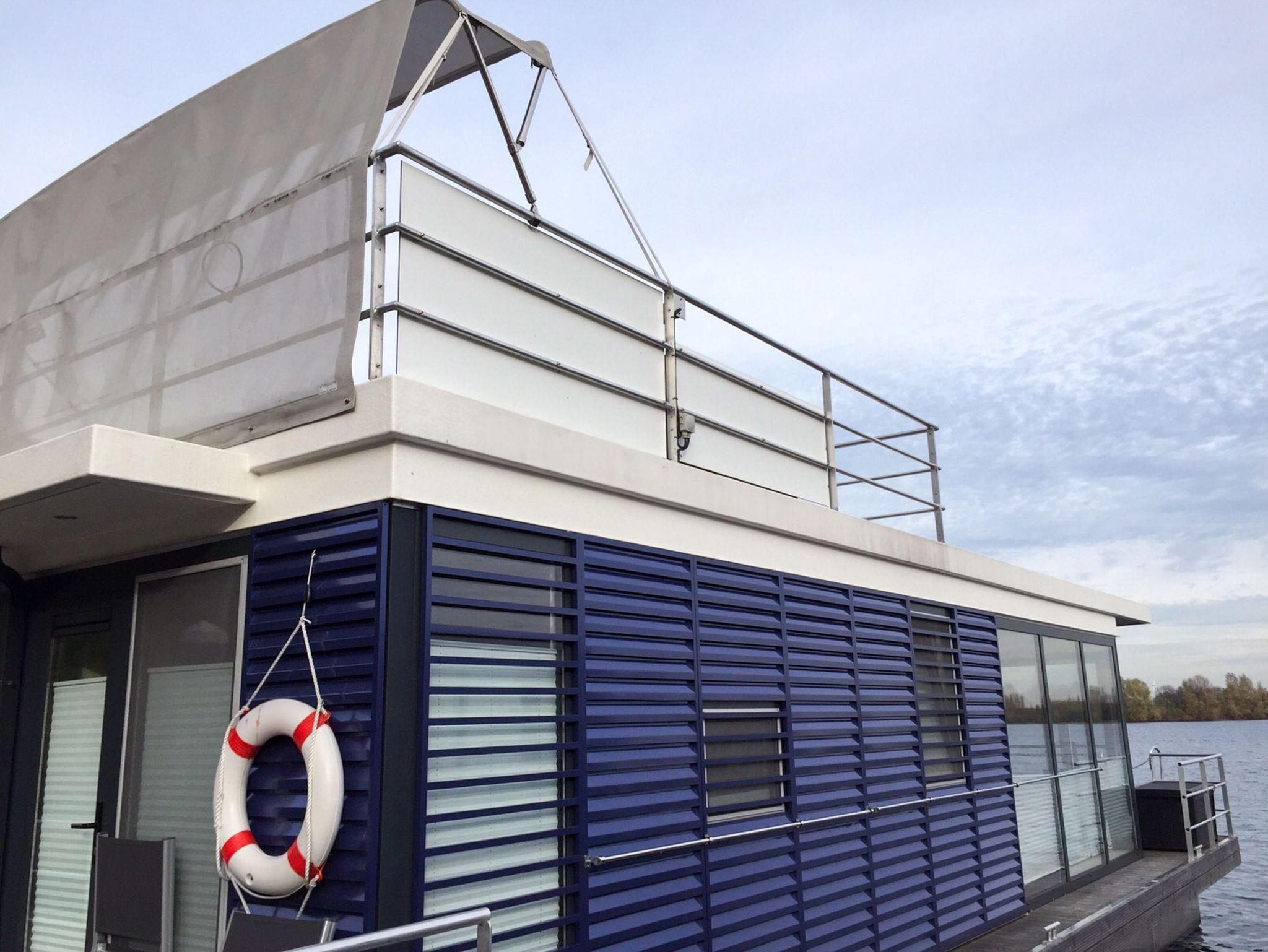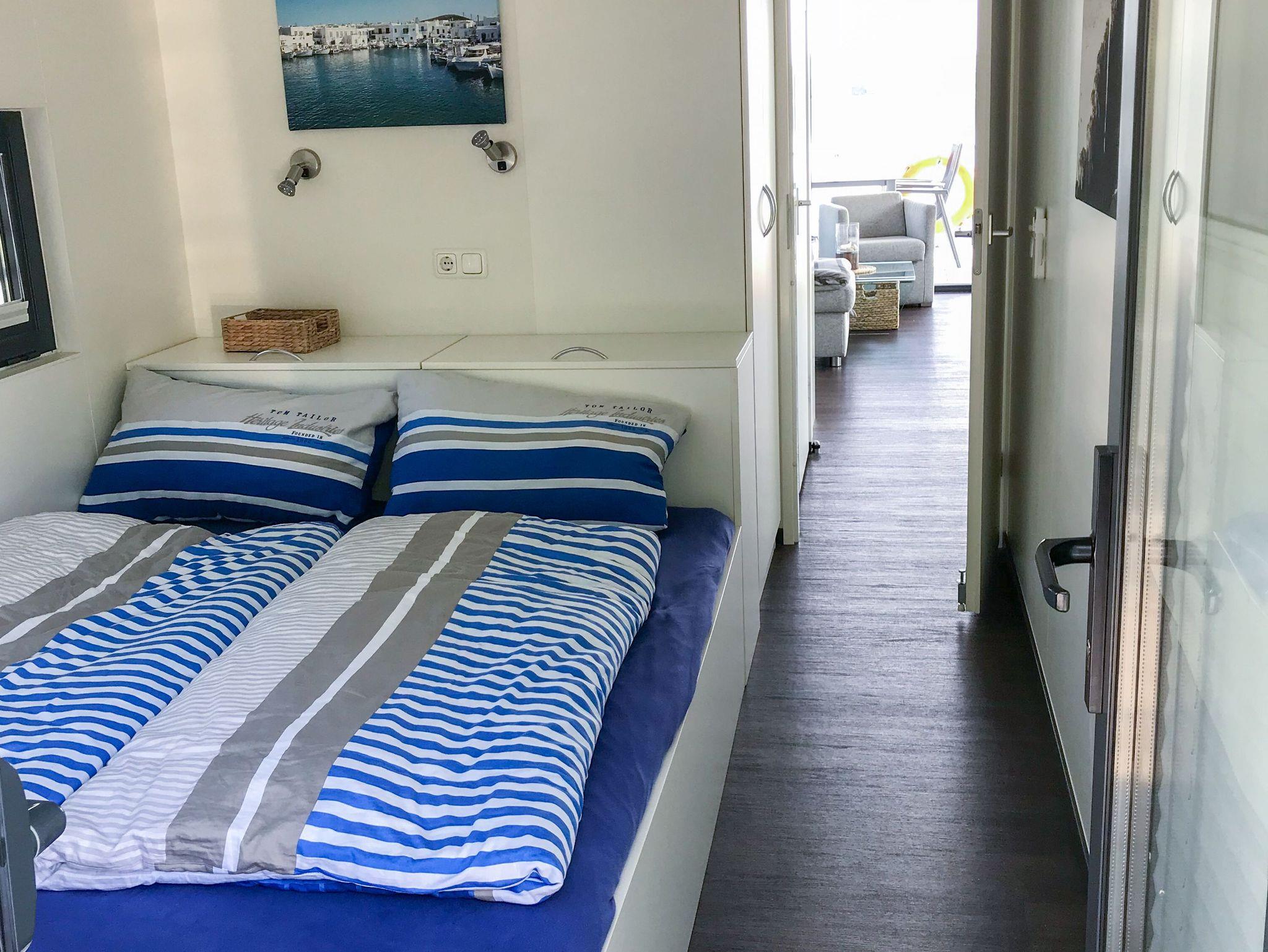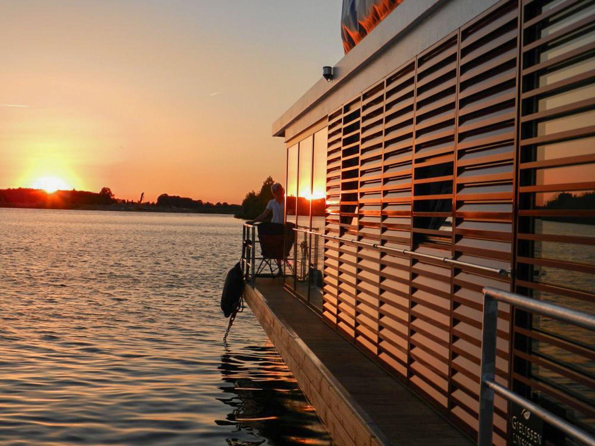 Floating Houses Xanten fünf moderne Hausboote mit je 44m² Wohnfläche, zwei Schlafzimmern und Platz für bis zu vier Personen erwarten Dich auf dem idyllischen Nordsee in Xanten. Die festliegenden Hausboote liegen an einer eigenen Steganlage im charmanten Ortsteil Vynen direkt auf dem Wasser, mitten in der grünen Seenlandschaft zwischen Nord- und Südsee. Hier genießt Du nicht nur absolute Ruhe, sondern auch das Gefühl, mitten in der Natur zu sein mit Wasser, Wellen und weitem Blick. Die Boote sind besonders hochwertig und maritim-modern eingerichtet und verfügen über zwei gemütliche Schlafzimmer mit Doppelbetten, einen lichtdurchfluteten Wohnbereich mit großen Fensterfronten und eine voll ausgestattete Küche. Der Zugang zur Bug-Terrasse mit Sitzmöbeln macht das Frühstück am Wasser zum täglichen Highlight. Oben erwartet Dich eine großzügige 25m² große Dachterrasse perfekt zum Sonnen, Entspannen oder einfach nur für die Aussicht. Eine Klimaanlage sorgt auch an warmen Tagen für angenehmes Raumklima.