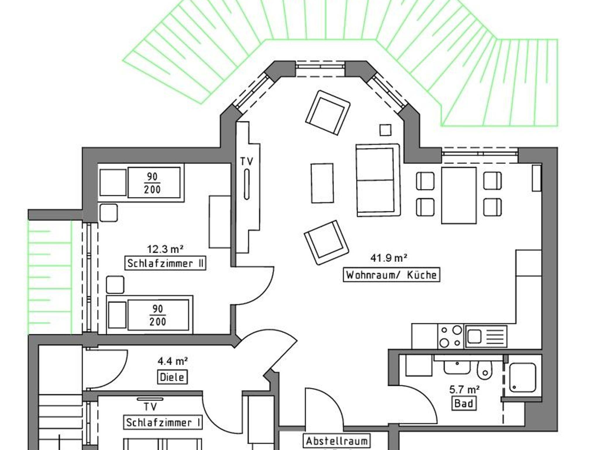- 2 Schlafzimmer mit je 2 Betten (Doppelbett = 2 Einzelbetten ggf. trennbar)