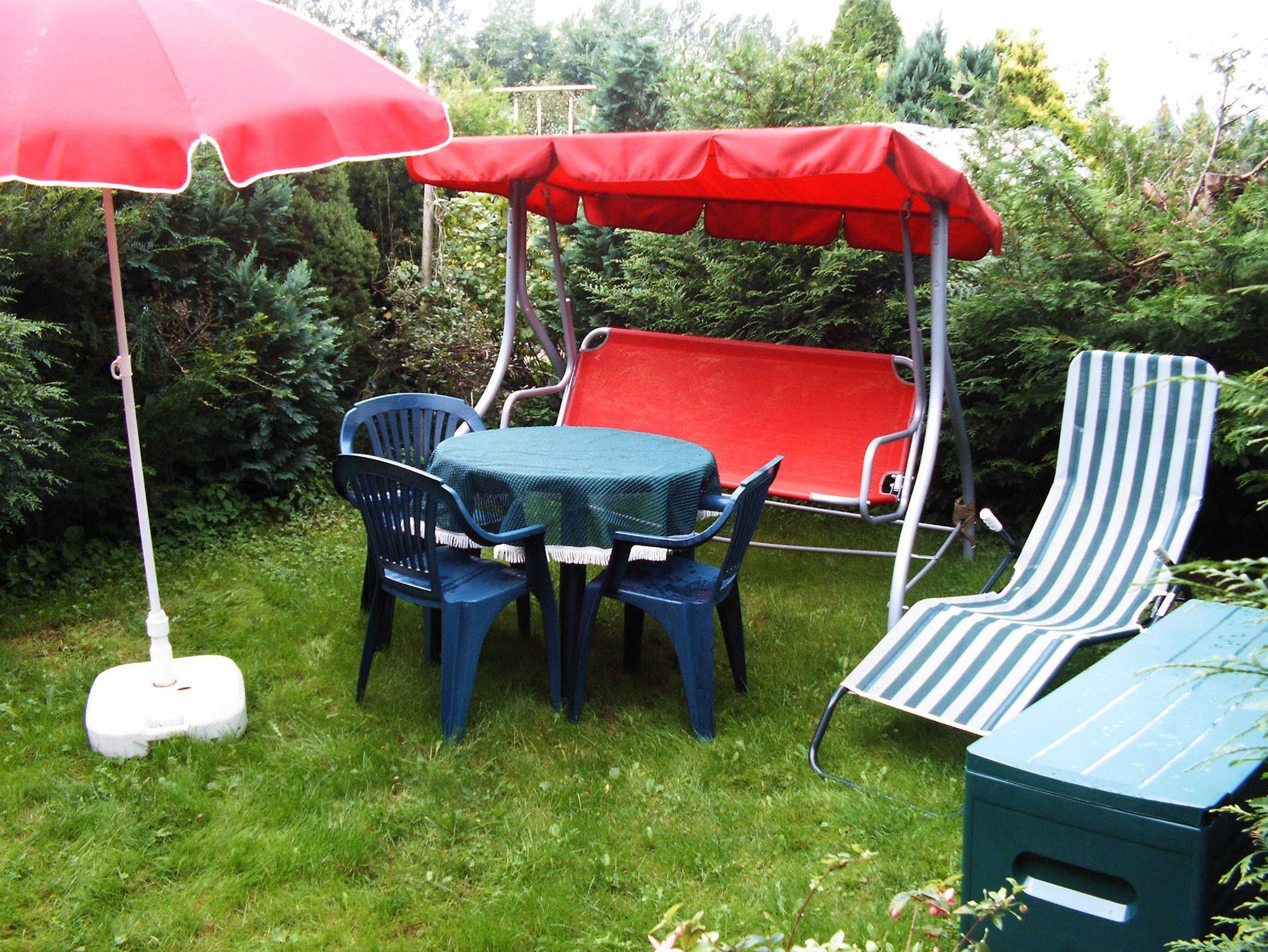 Vor der Wohnung gibt es einen Parkplatz für das Auto und im Garten einen eigenen durch Sichtschutzhecken abgetrennten Bereich mit Gartenmöbeln.