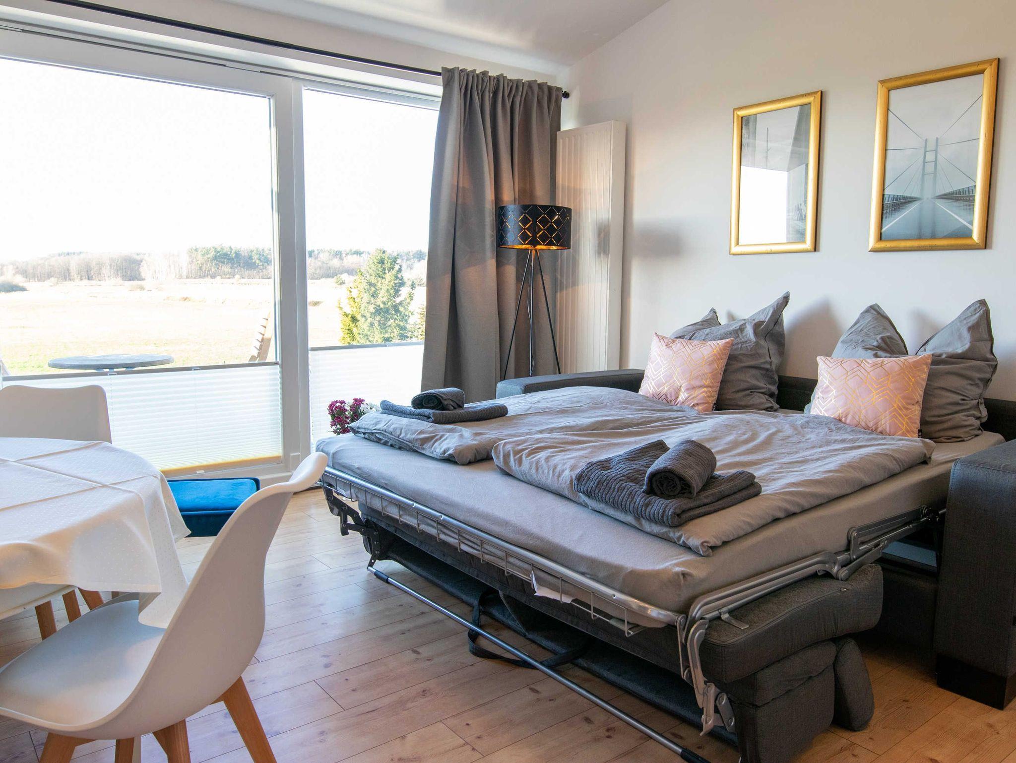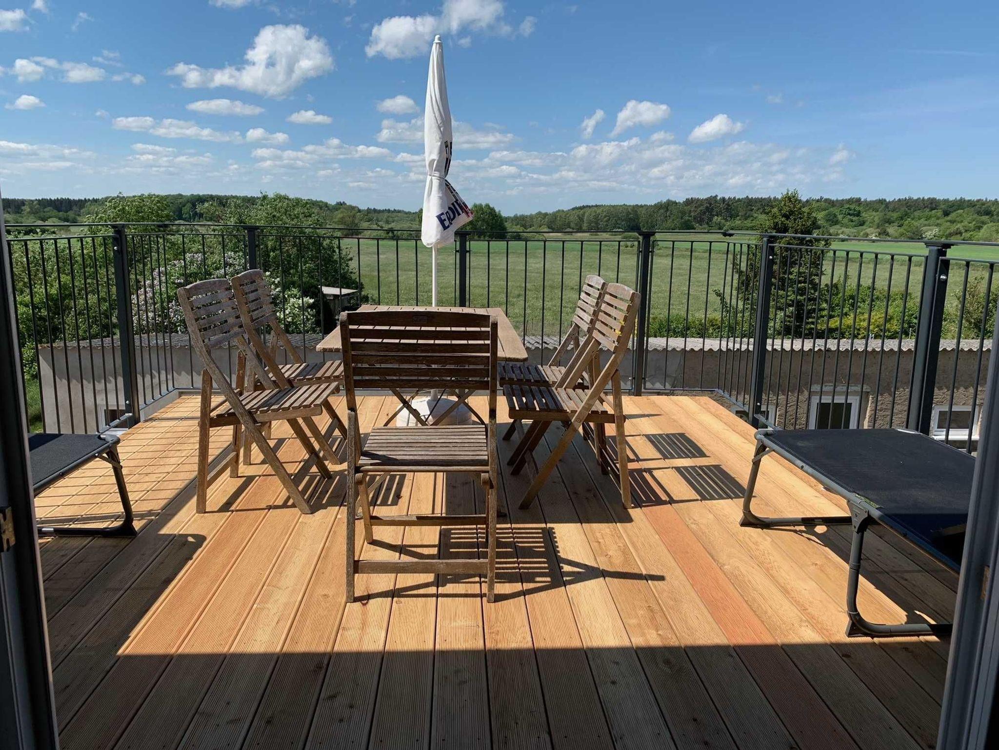 Die Ferienwohnung Panoramablick 2 im Landhaus Wiesenblick in Zarrendorf ist für bis zu 6 Personen geeignet und verfügt auf 75m² Fläche über 1 Wohnbereich mit offener Küche und Essbereich, sowie einer Schlafcouch die zu einem vollwertigen Bett (160x200) umgebaut werden kann. Die zwei separaten Schlafzimmer beinhalten jeweils ein Doppelbett (160x200) und eine Garderobe. Das Badezimmer ist abschließbar und mit einer ebenerdigen Dusche, Badewanne, Waschbecken und WC ausgestattet. Die Küche enthält neben einer Spüle, Geschirrspüler, Backofen, Cerankochfeld, Kühlschrank mit Gefrierfach, Wasserkocher, Toaster, Tassimo Kaffeemaschine auch Küchenhelfer, Besteck und Geschirr. Der Balkon kann zum Sonnen und Entspannen genutzt werden, auf der Terrasse im Erdgeschoss steht ein Grill bereit.