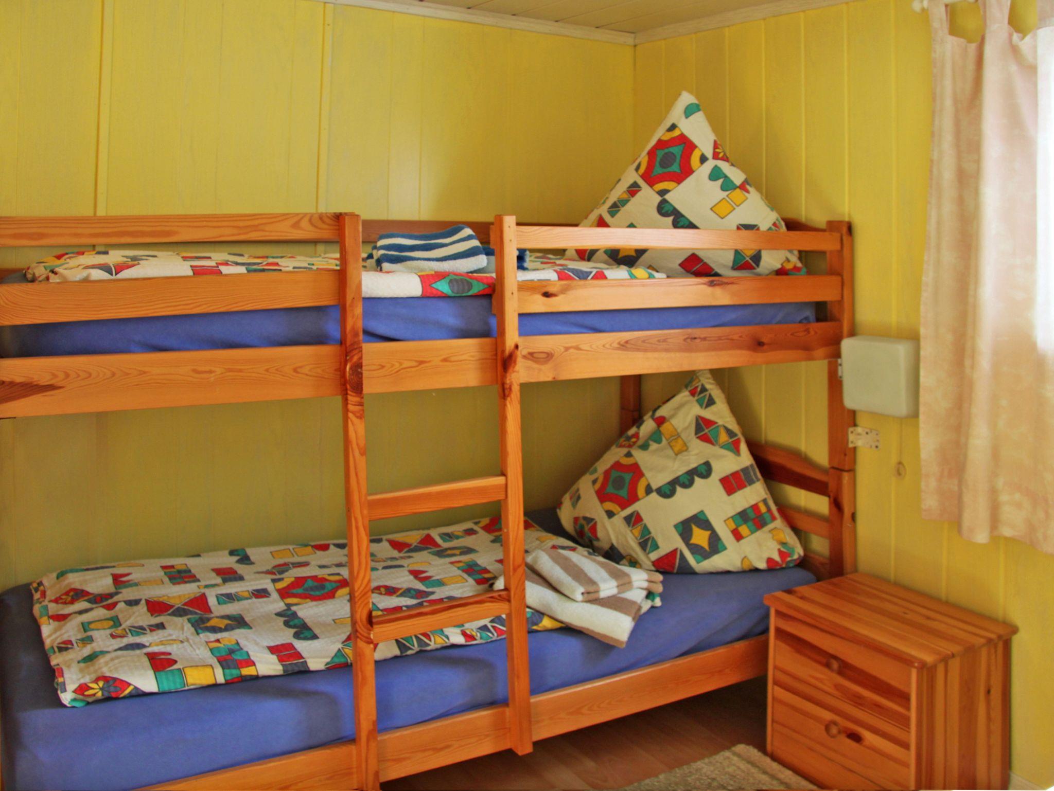 Ein Schlafzimmer ist mit einem Doppelbett und das andere Schlafzimmer mit einem Etagenbett (Doppelstockbett) für Kinder und Junggebliebene ausgestattet. Über das Kinderschlafzimmer gelangt man in das Bad.