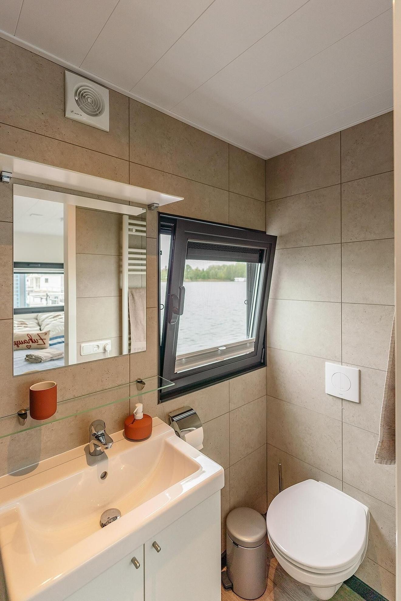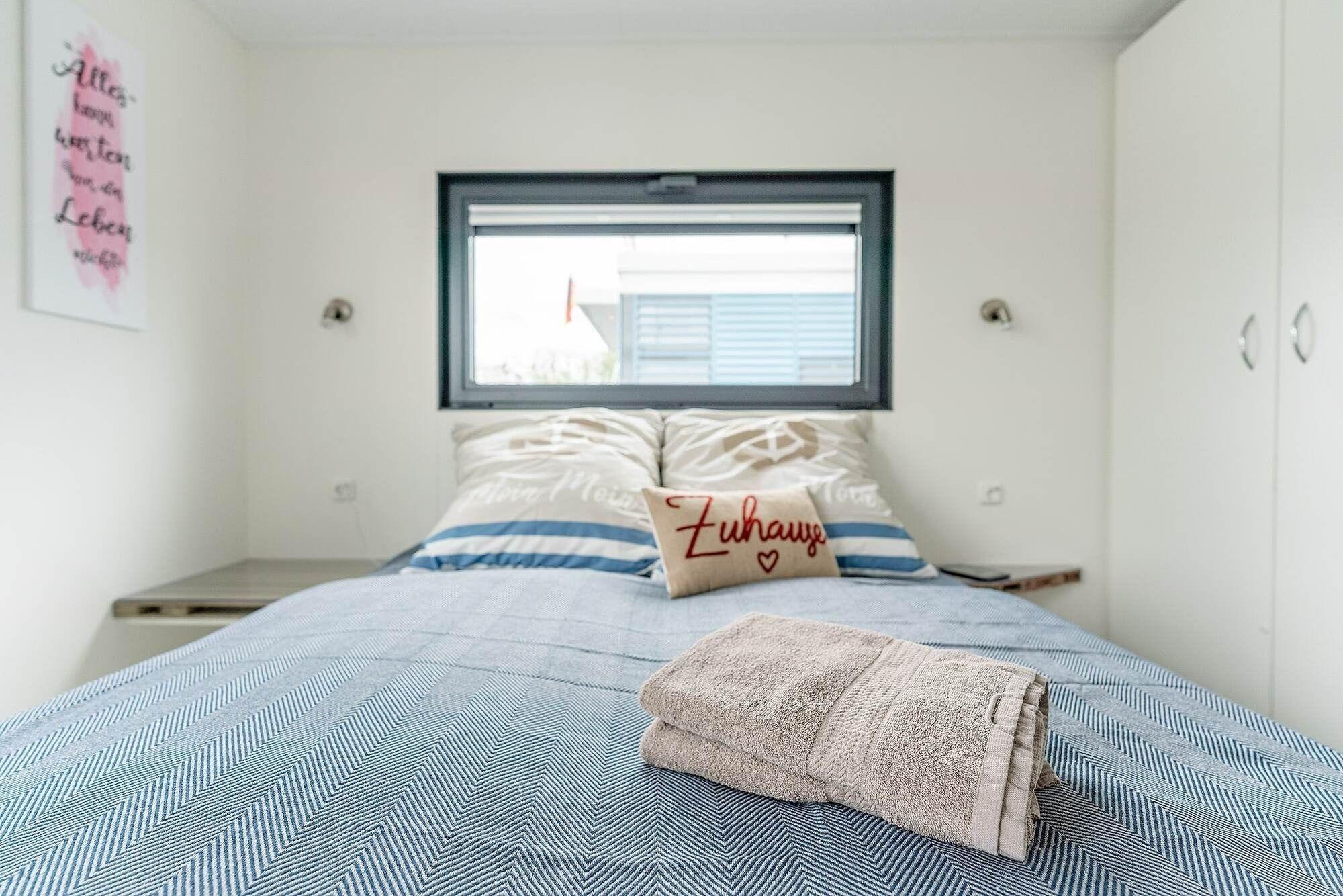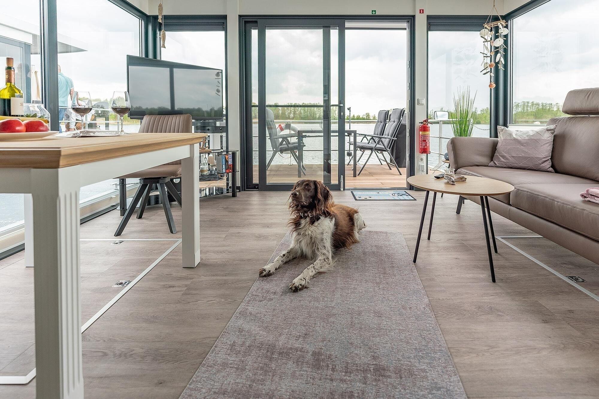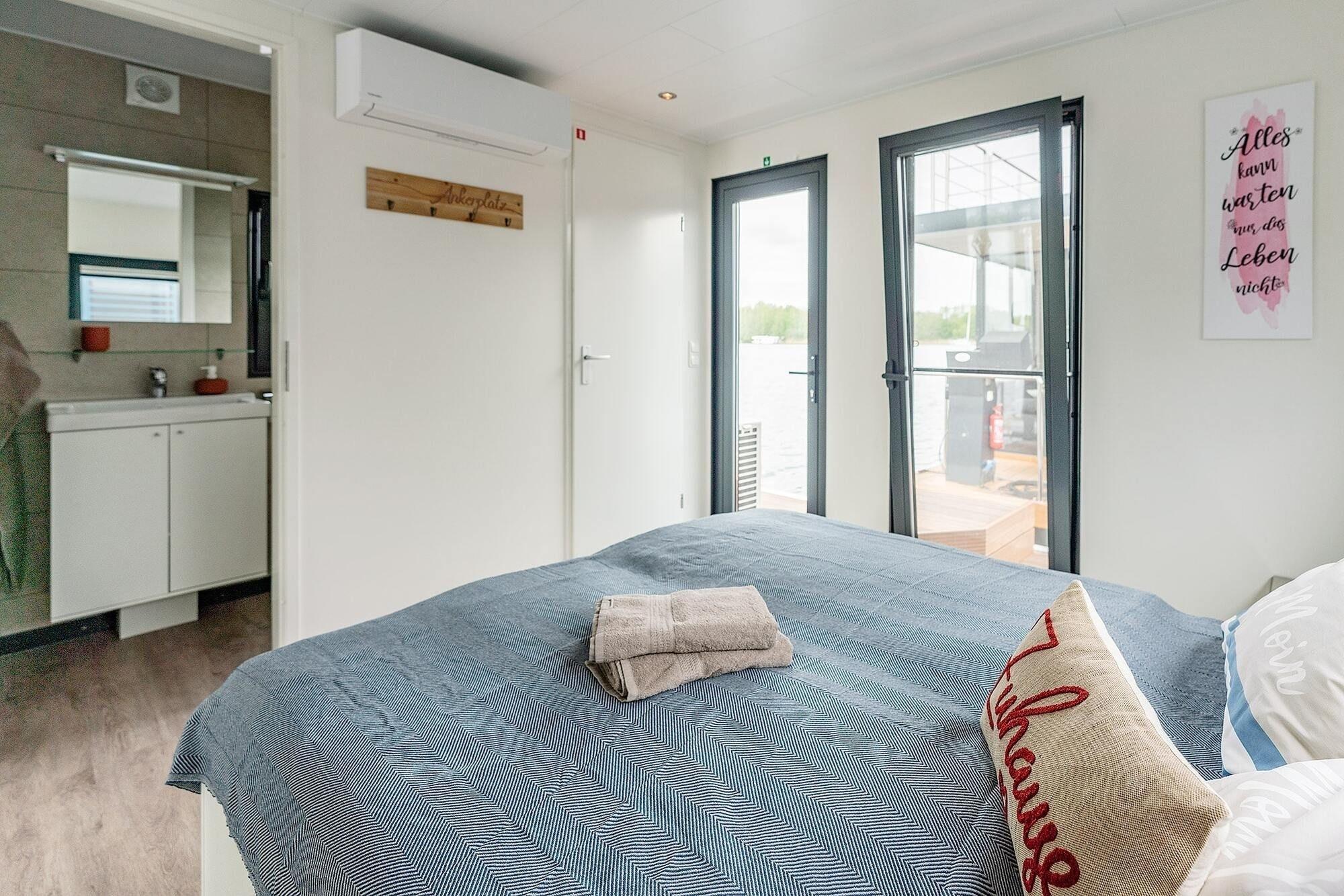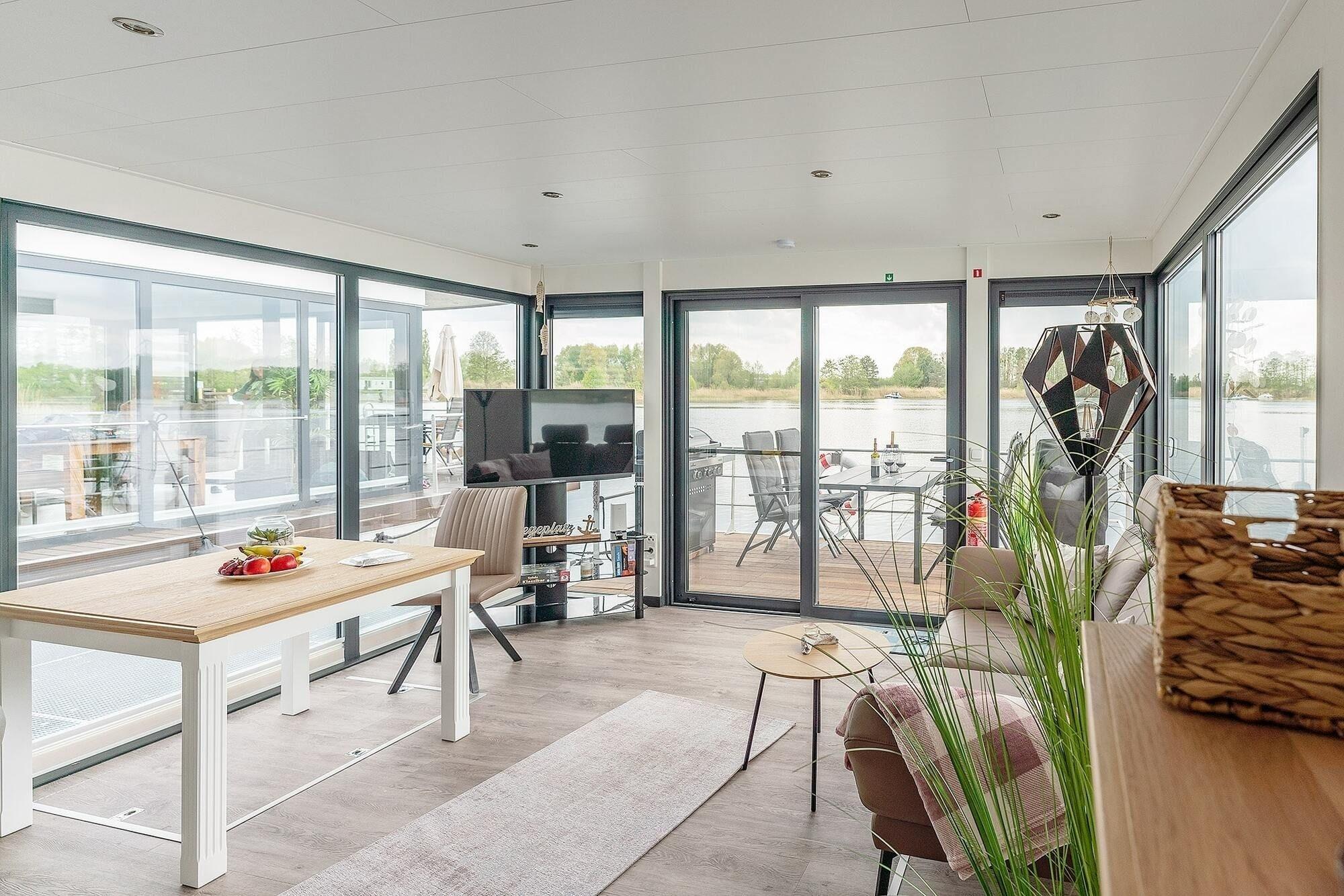 Das Hausboot ist ein floating 33. Es besitzt 1 Schlafzimmer mit einem Doppelbett. Das Badezimmer ist mit einer Dusche und WC ausgestattet. Der Wohn- und Essbereich ist ein stilvoll eingerichteter Raum mit einer dreiseitigen Glasfront.