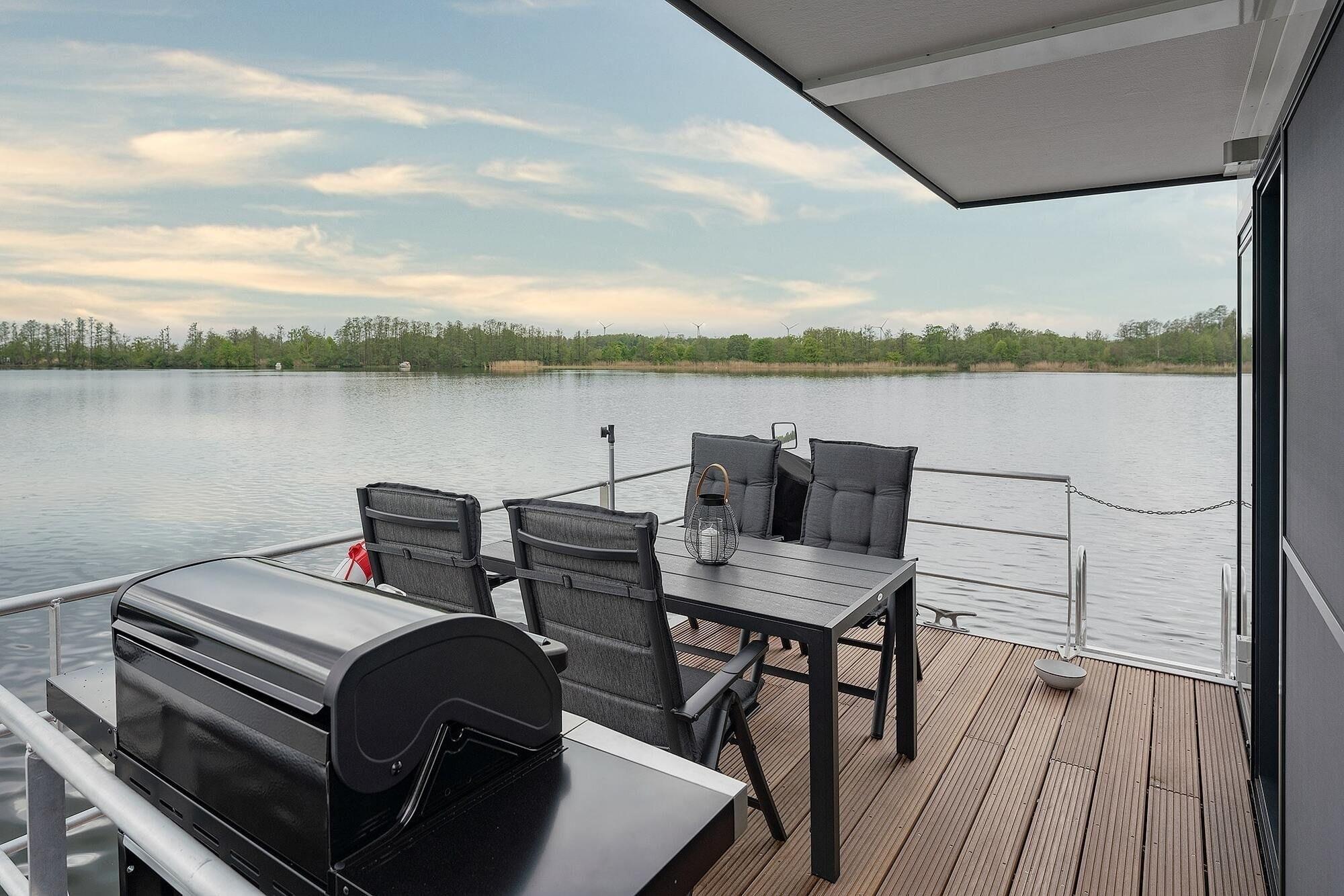 Aus dem Wohn- und Essbereich gelangen Sie auf die Terrasse. Auch hier können Sie Ihre Mahlzeiten genießen. Auf der Dachterrasse kann man sehr gut entspannen und die Seele baumeln lassen. Erleben Sie das Gefühl von Freiheit auf dem Wasser!