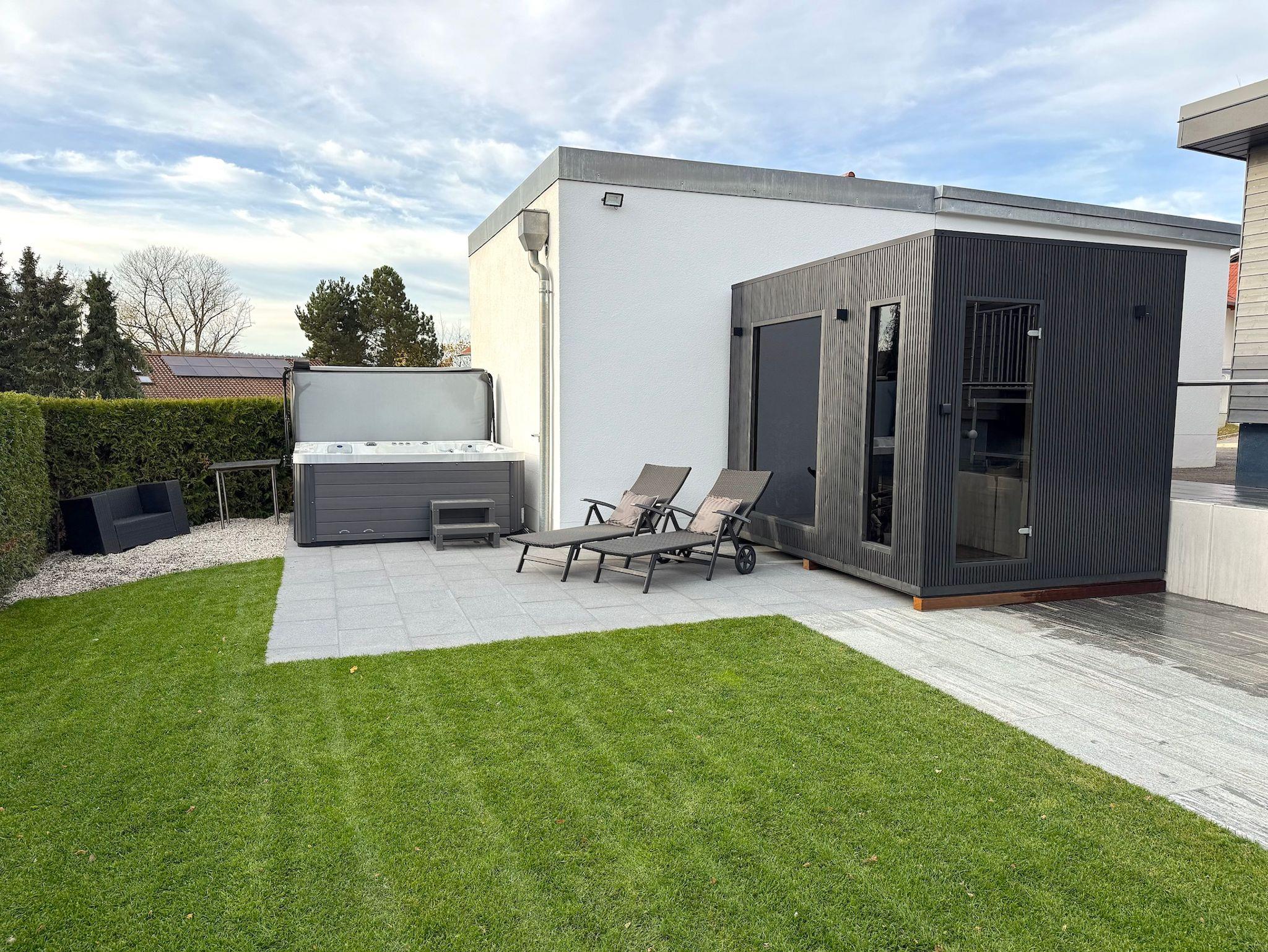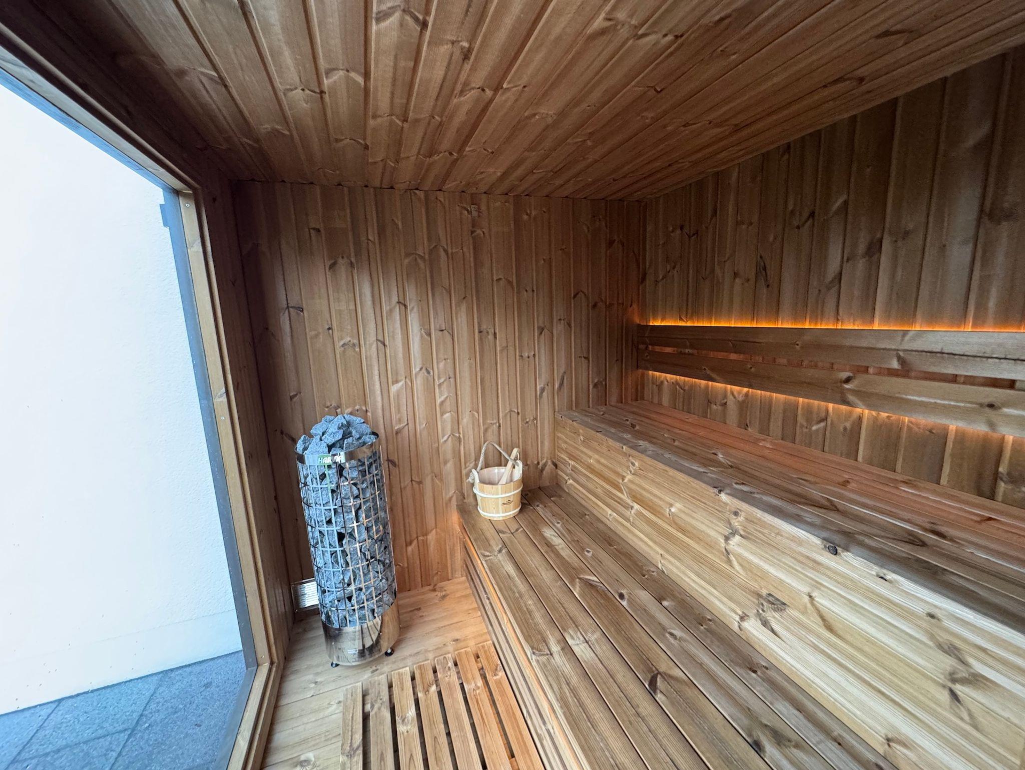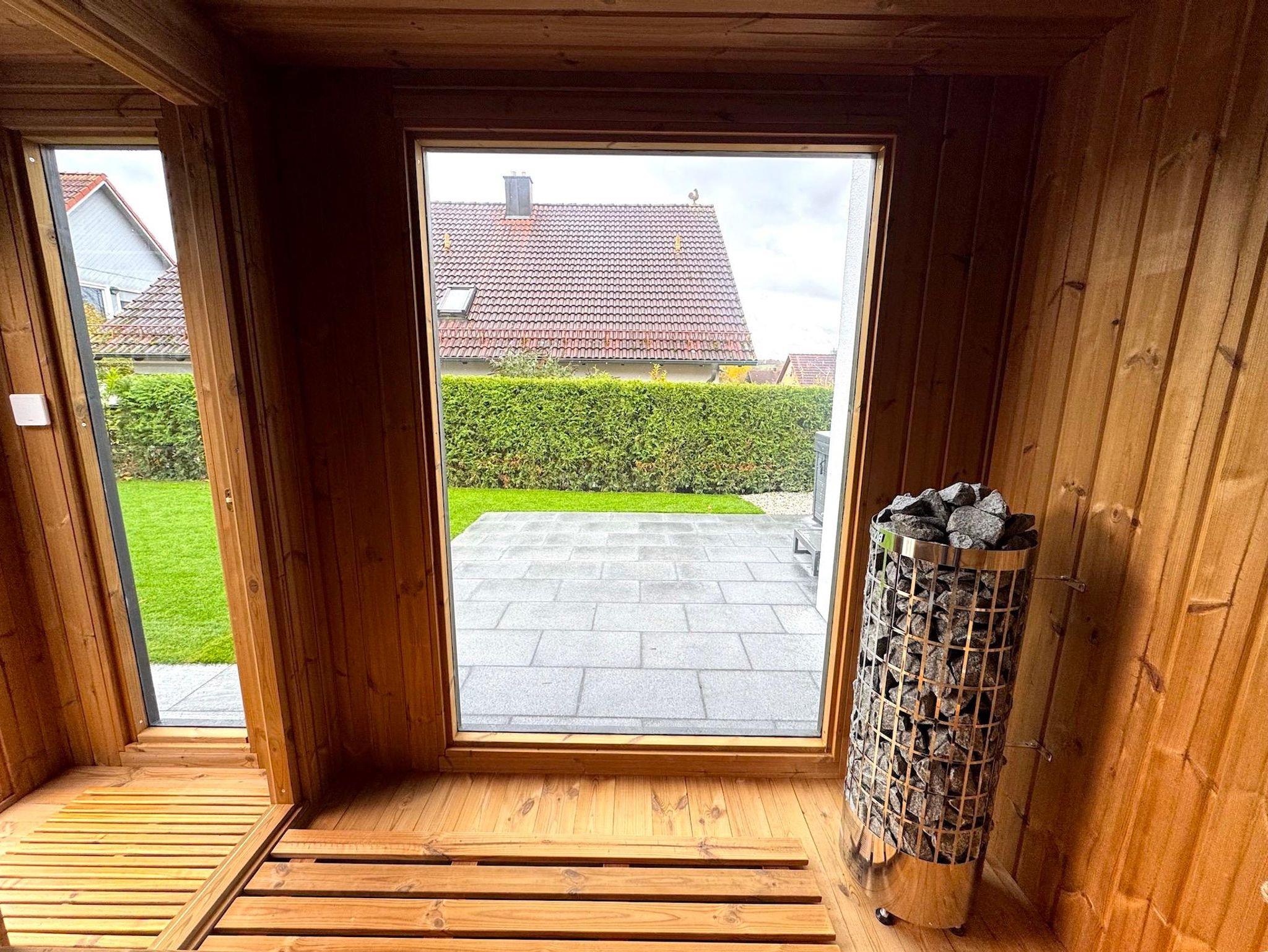 Außerdem befindet sich dort eine sehr hochwertige Außensauna: Genießen Sie die wohlige Wärme unserer Außensauna mit wohltuenden Aufgüssen und revitalisieren Sie Körper und Geist mit Ausblick in die Natur.