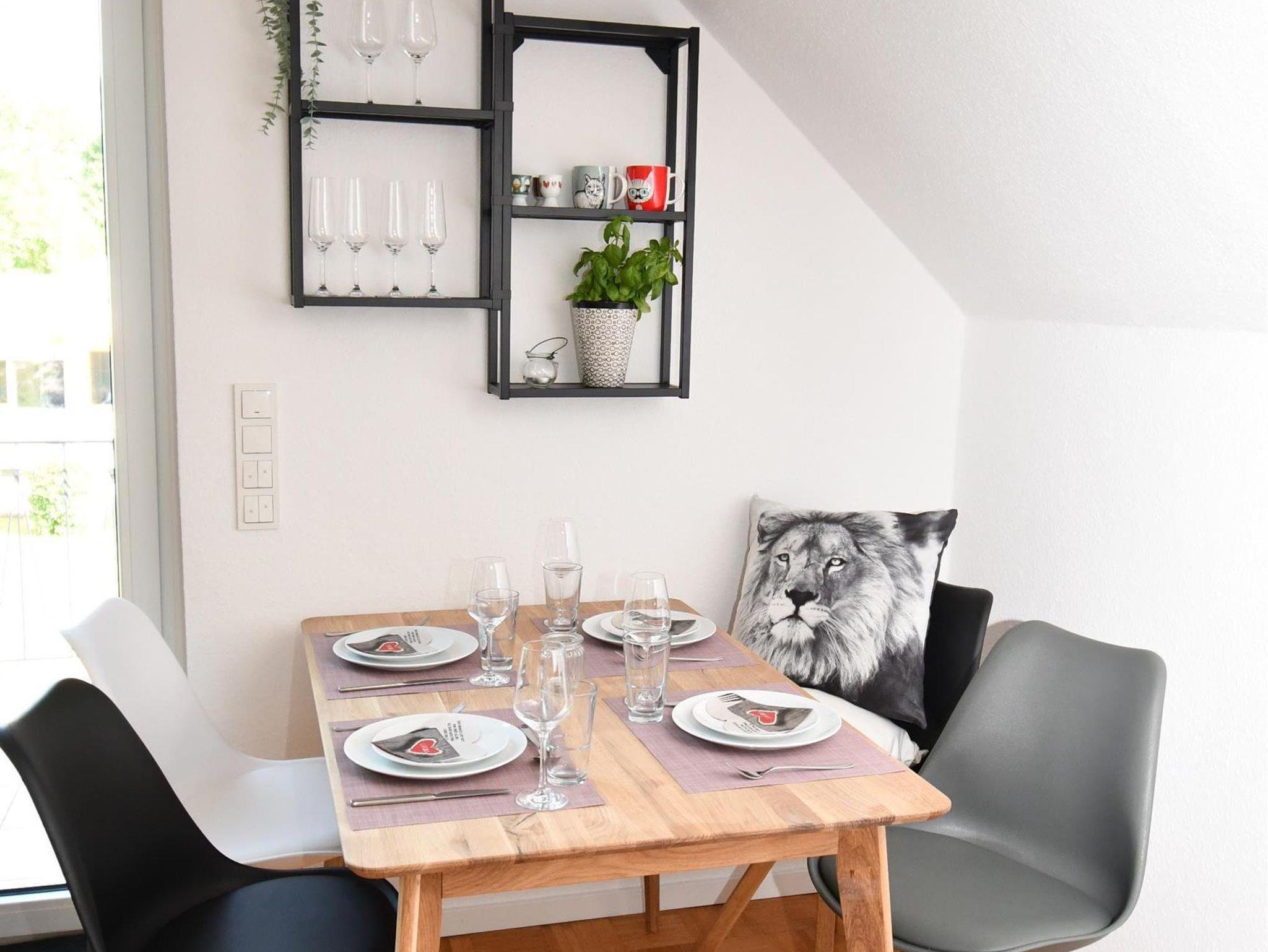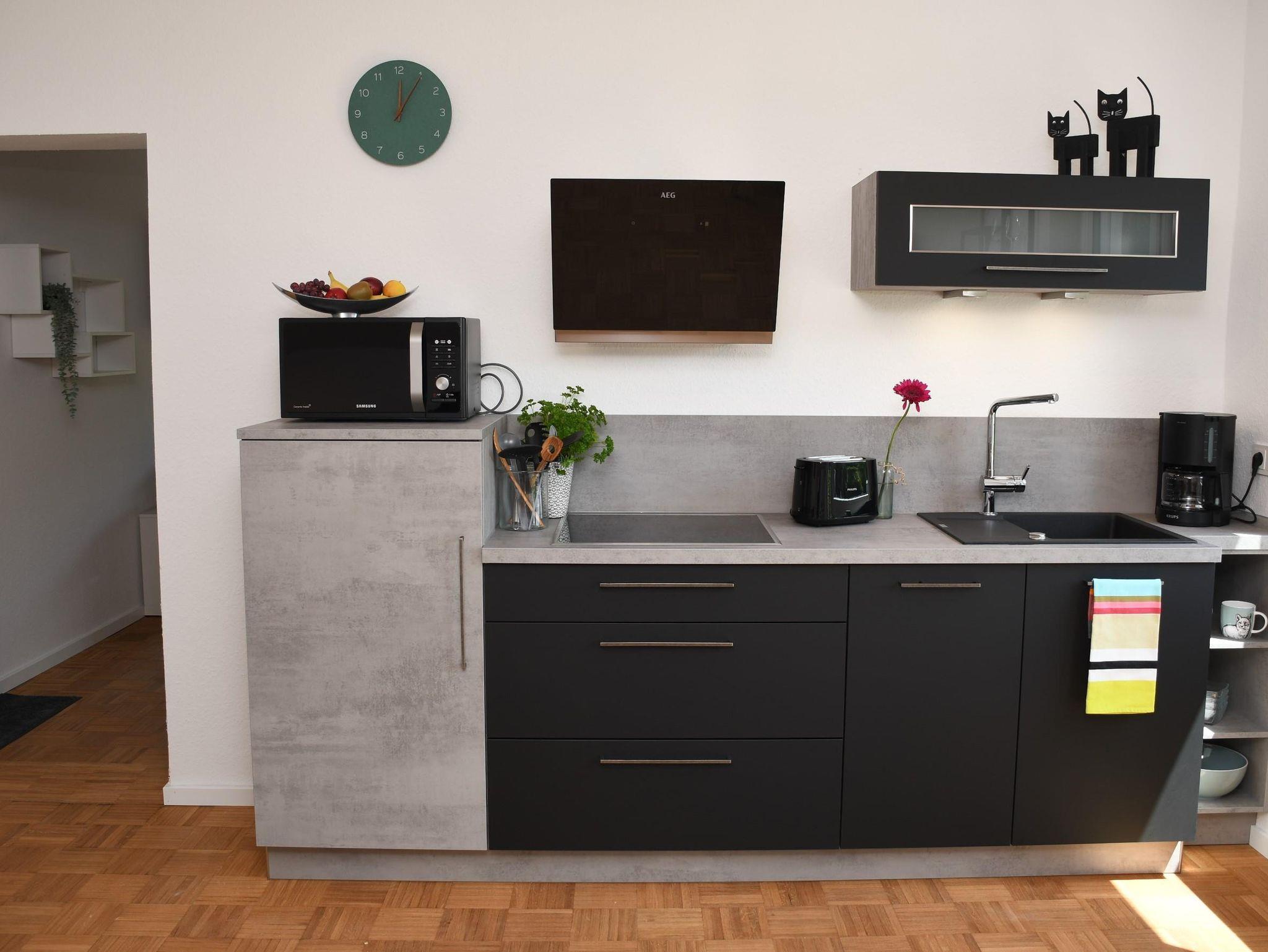 • eine Wohnküche mit einer sehr gut ausgestatteten modernen Küchenzeile, Essecke und Zugang zu einem weiteren Balkon. Im Wohnbereich finden Sie ein gemütliches Sofa und ein Flachbild TV.