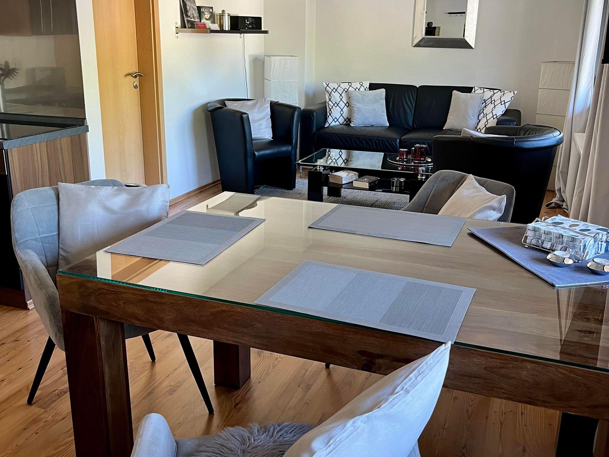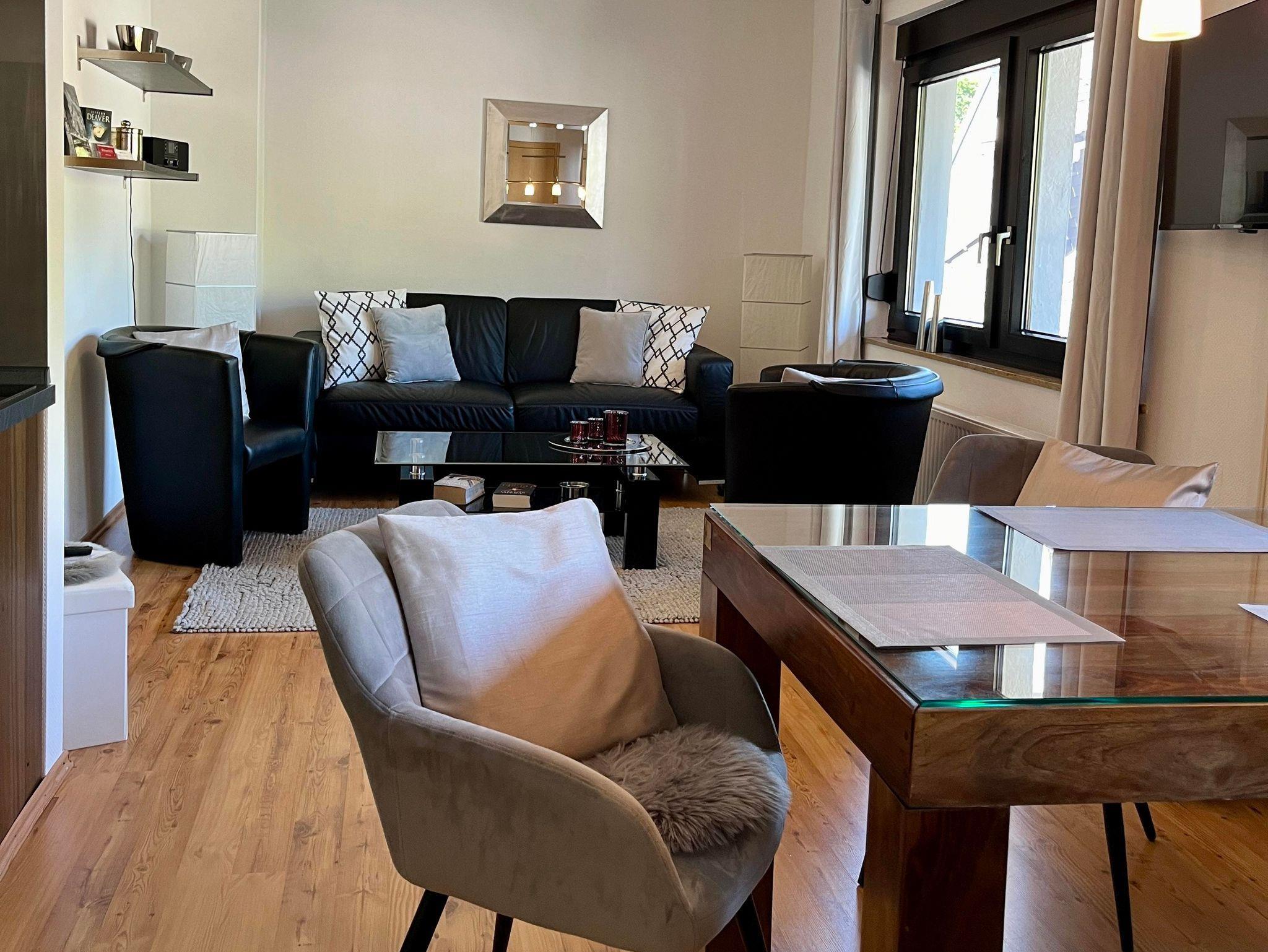 Helle, modern eingerichtete Ferienwohnung mit Balkon 48 qm für 2 Personen. Offener Wohnraum, separates Bad und Schlafzimmer.