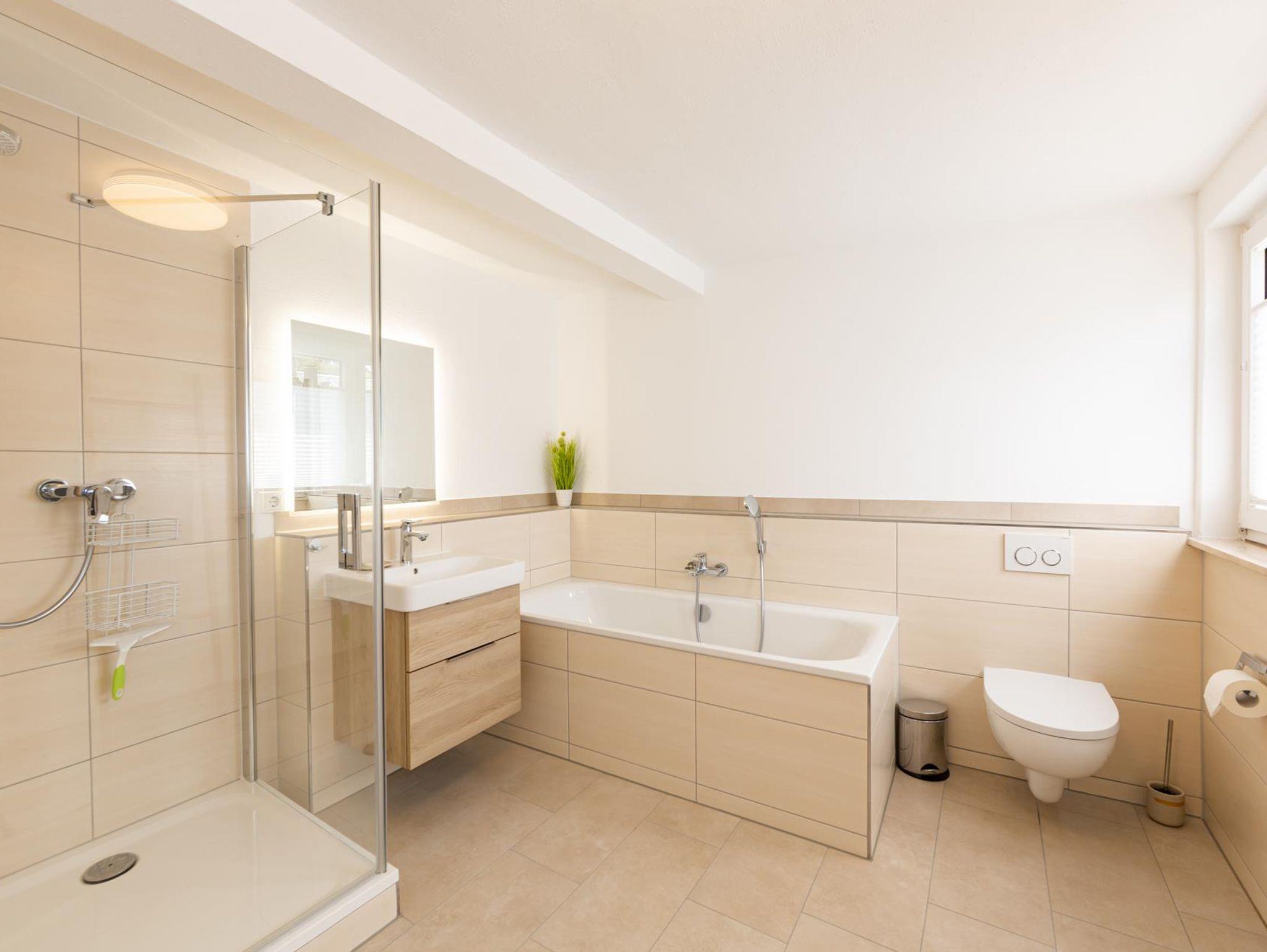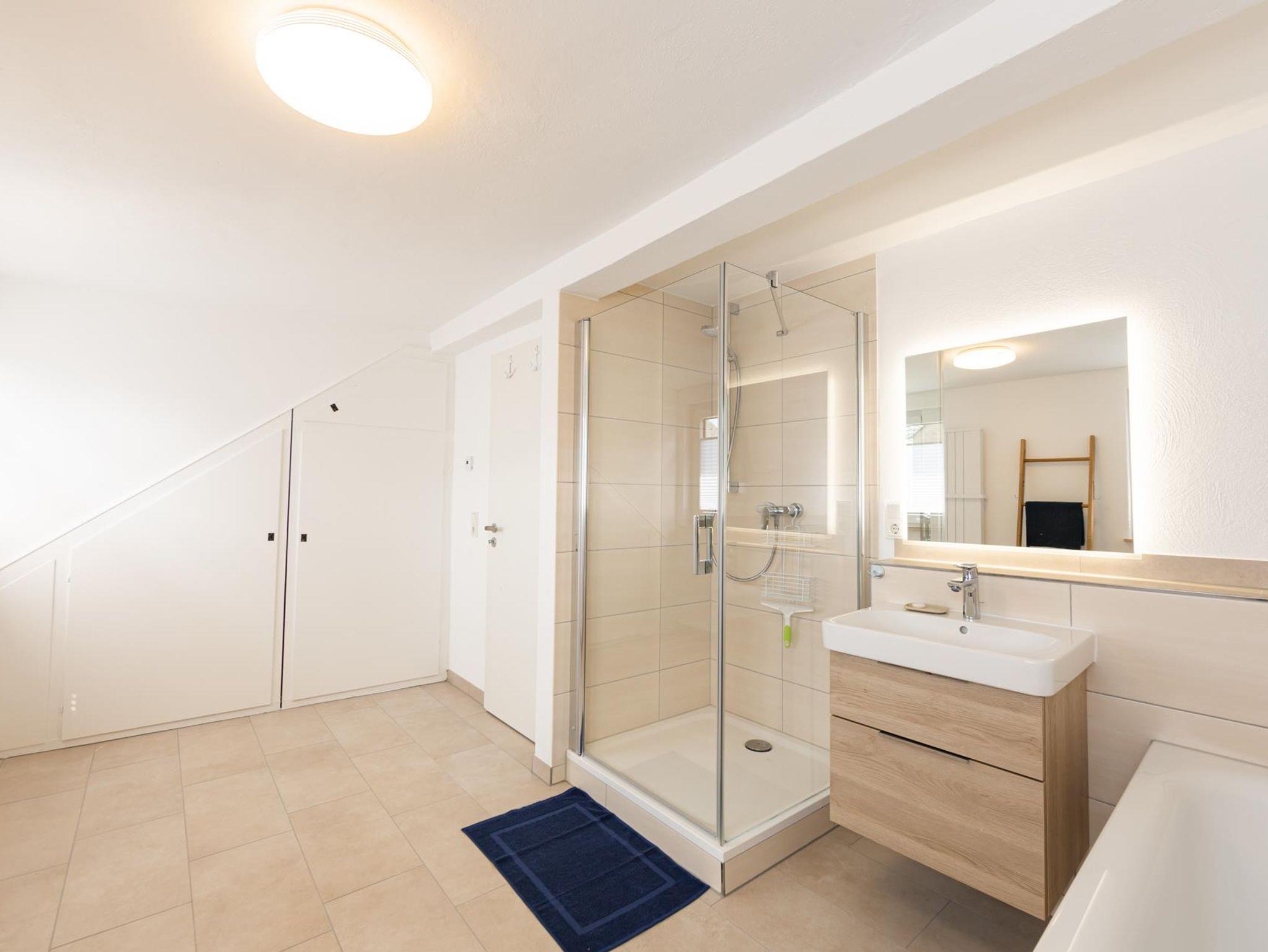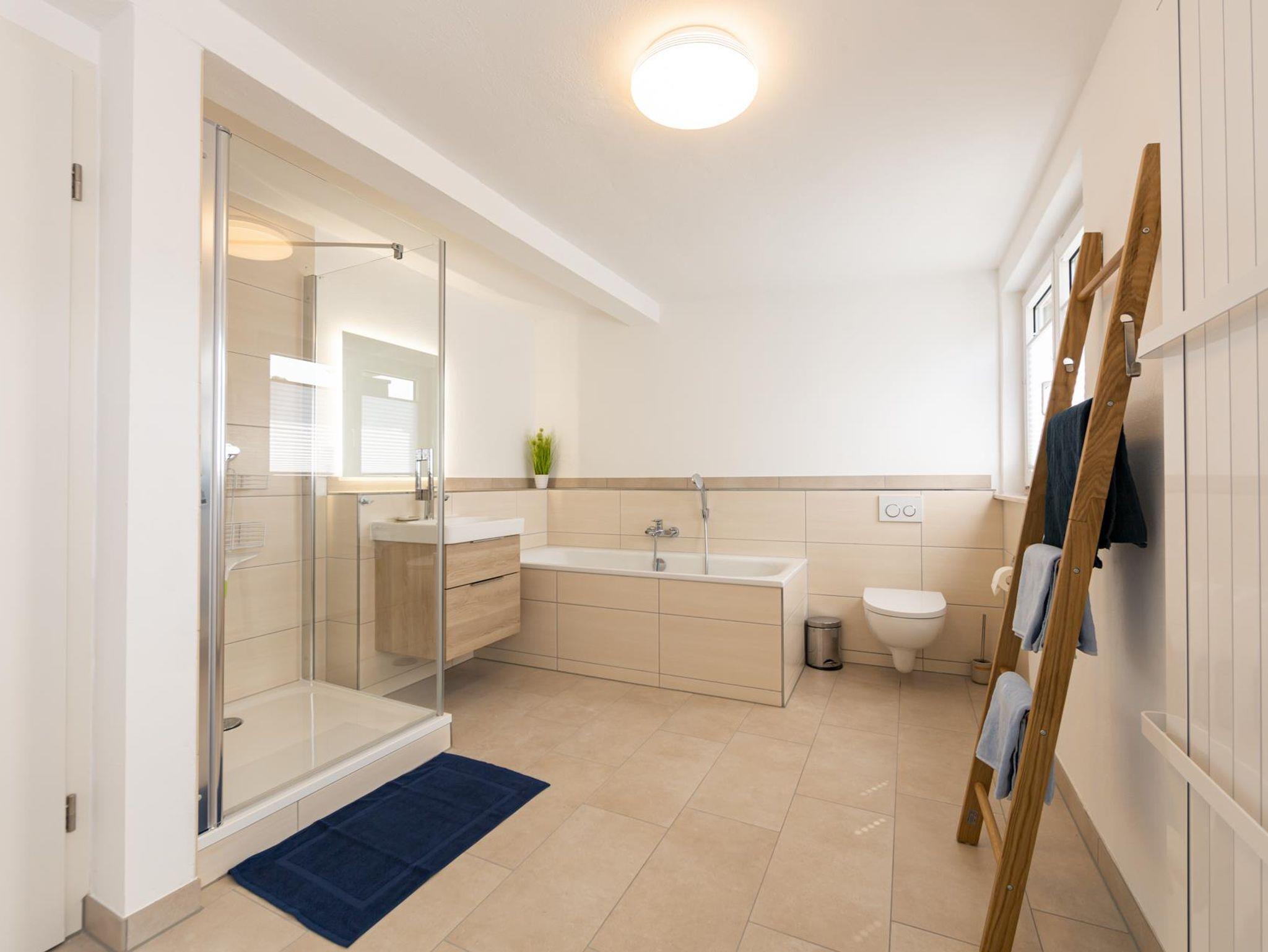 Das Haus verfügt über drei Bäder. Das geräumigste Tageslichtbad mit Badewanne und Dusche befindet sich im DG und ist über den Flur zugänglich. Ein weiteres Duschbad liegt im 1. OG ensuite zum Schlafzimmer, das dritte im Erdgeschoss.