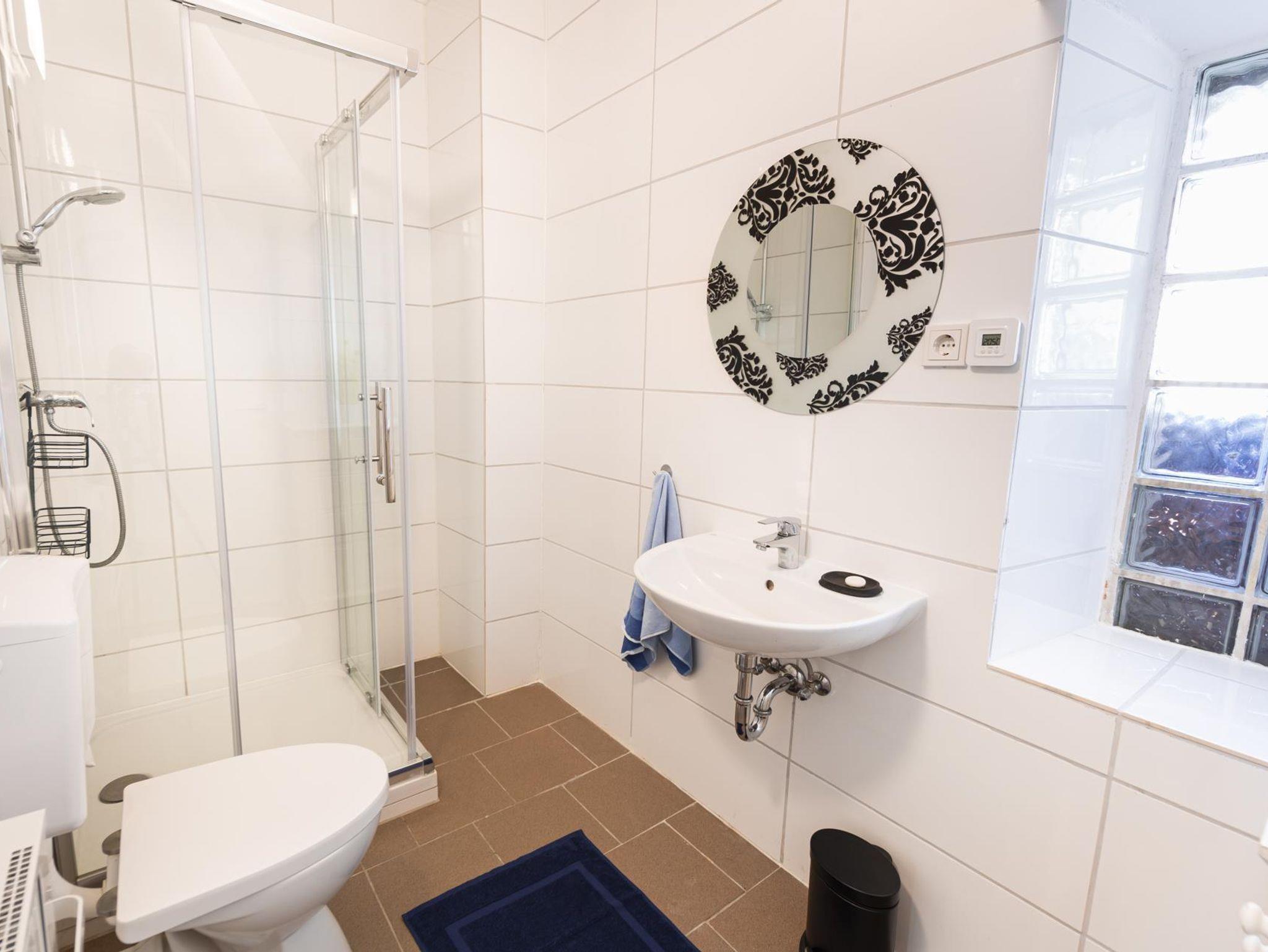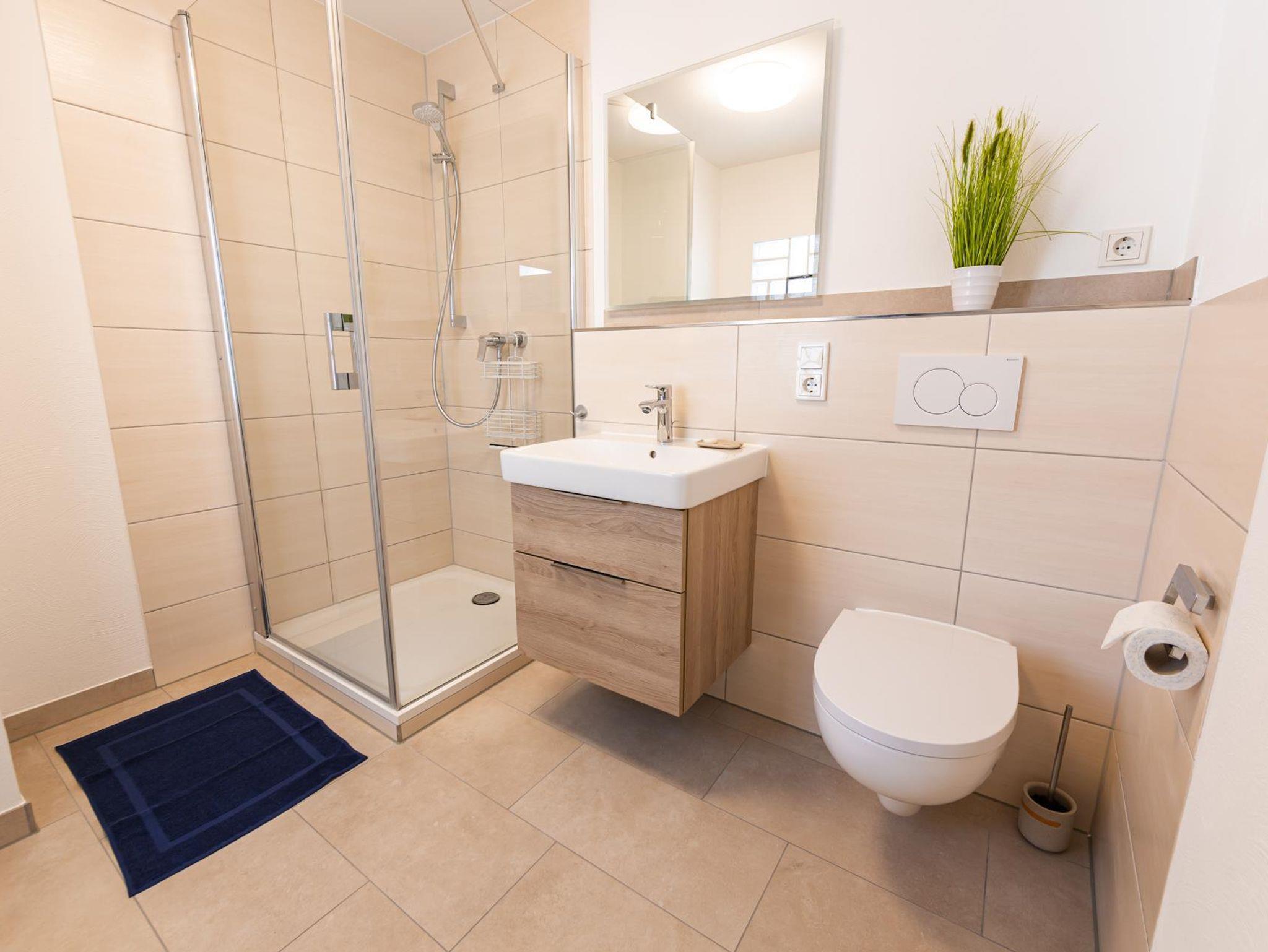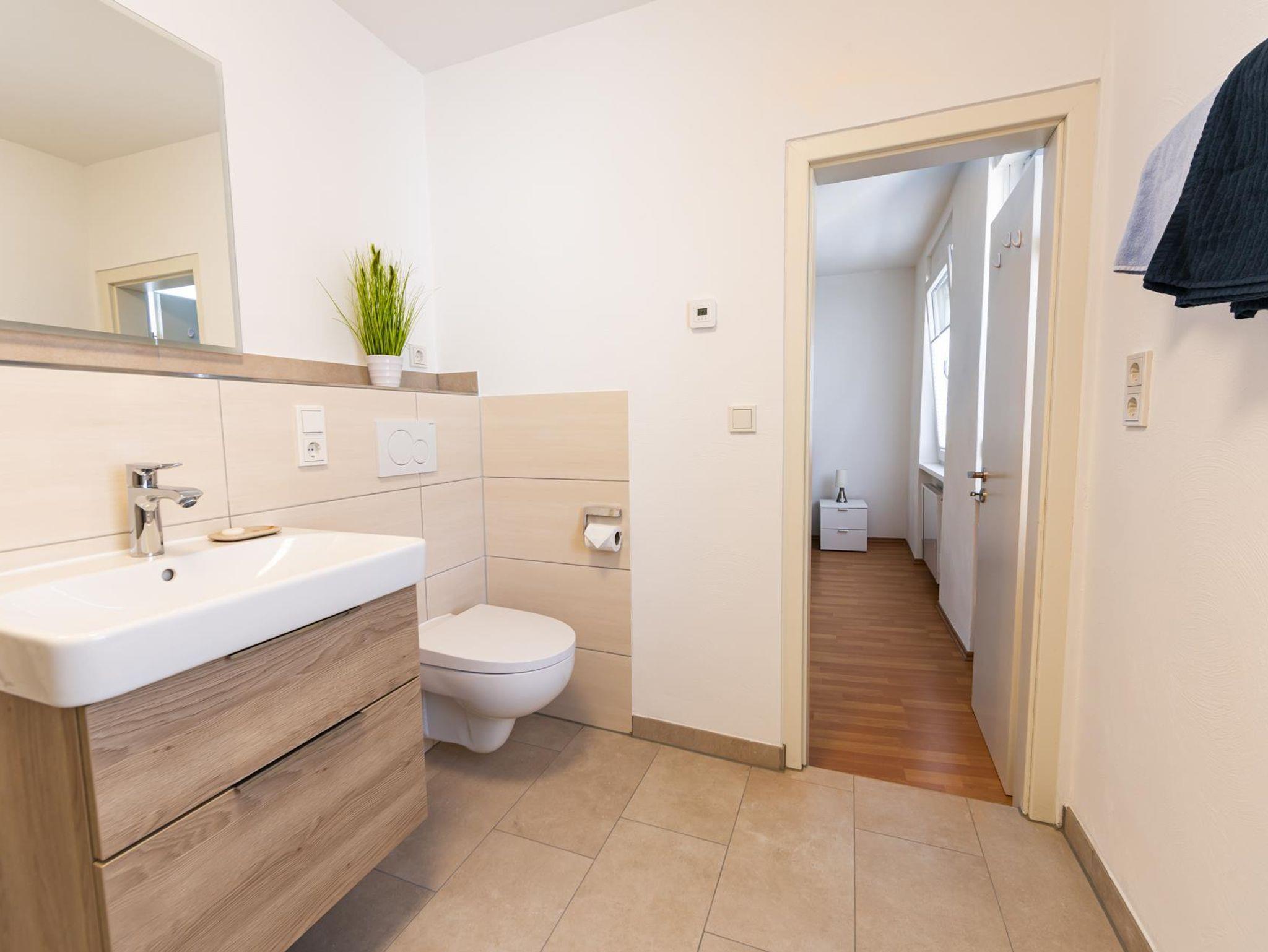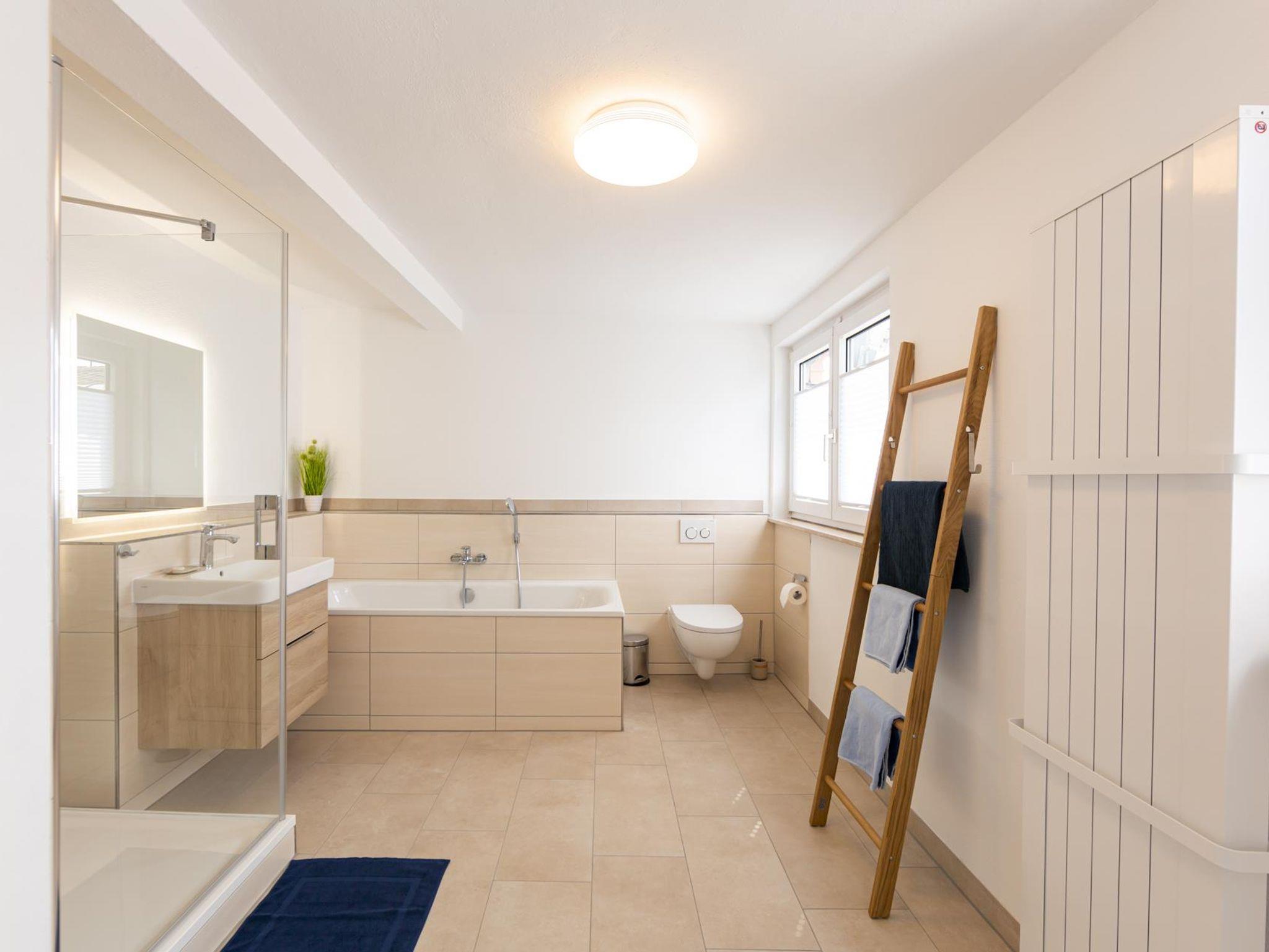 Das Haus verfügt über drei Bäder. Das geräumigste Tageslichtbad mit Badewanne und Dusche befindet sich im DG und ist über den Flur zugänglich. Ein weiteres Duschbad liegt im 1. OG ensuite zum Schlafzimmer, das dritte im Erdgeschoss.